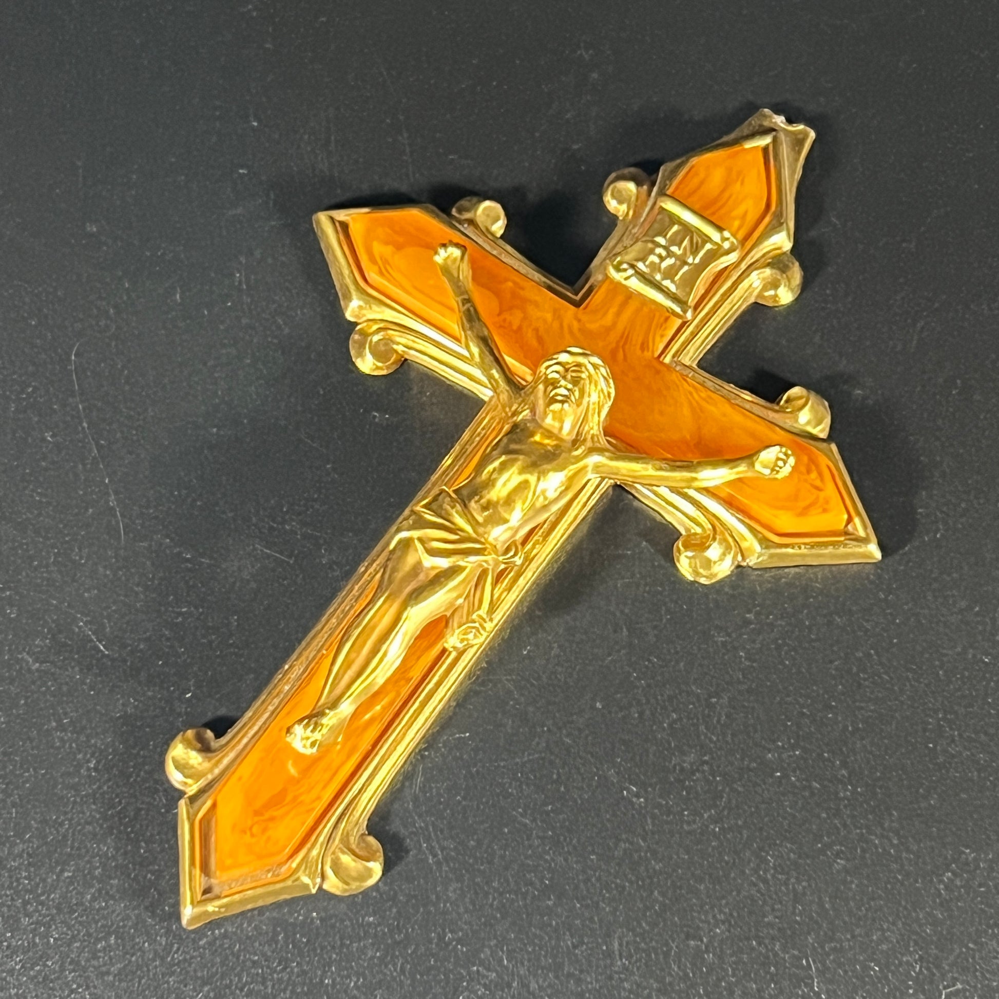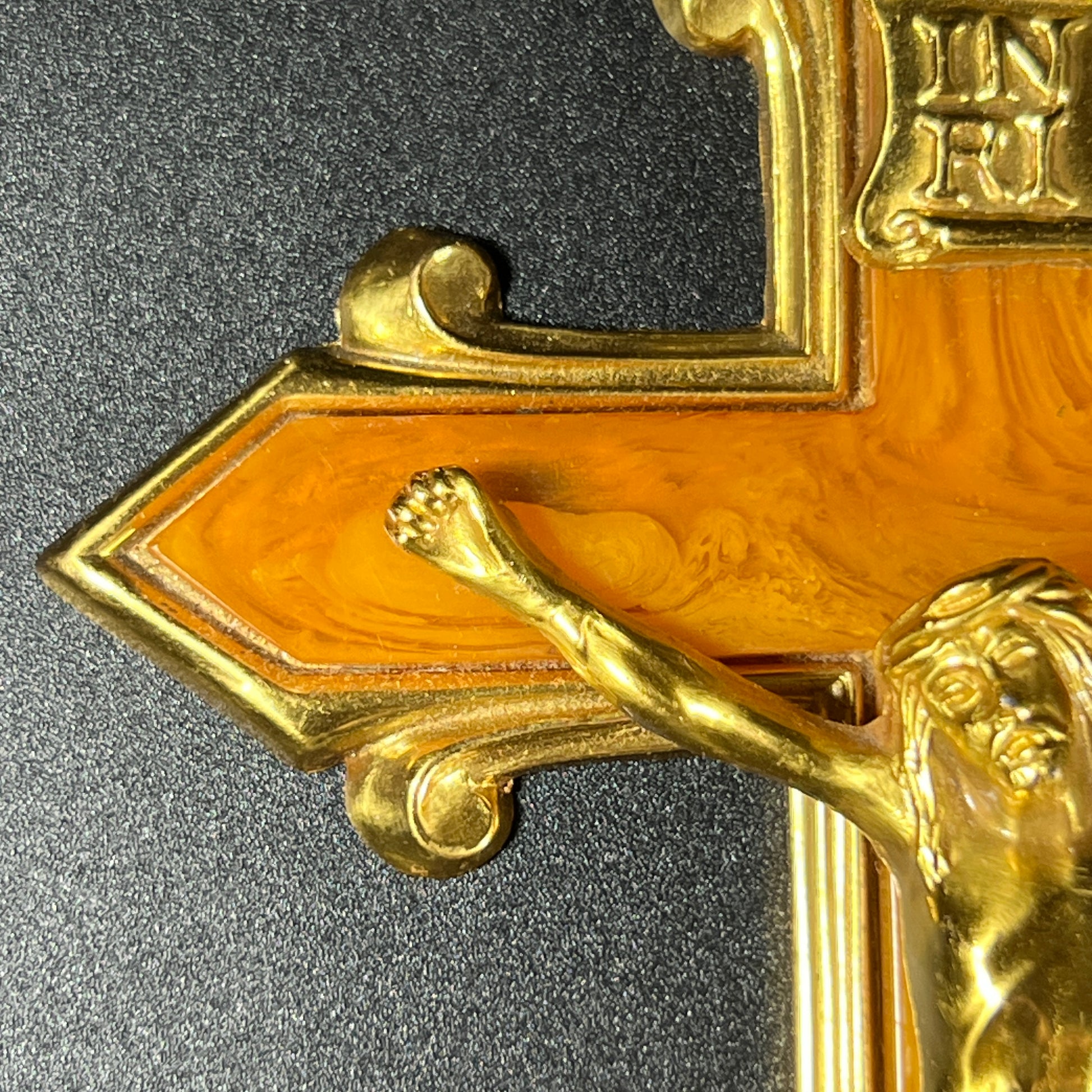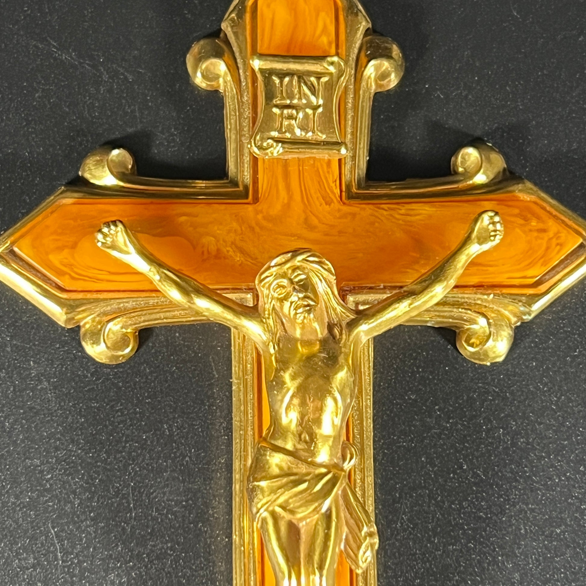 This vintage 1940s INRI crucifix is a beautifully preserved piece of religious art, crafted from gold-plated brass and rich marbled orange Bakelite, often referred to as butterscotch Bakelite. A striking blend of faith and mid-century design, this 6" crucifix makes a meaningful addition to any devotional space or vintage collection. While it is in good vintage condition overall, please note that the top hole appears to be missing. See photos, it has been priced accordingly. Measures approximately 6" H x 4" W x 0.75" D. A timeless symbol of devotion and a wonderful example of vintage religious craftsmanship.