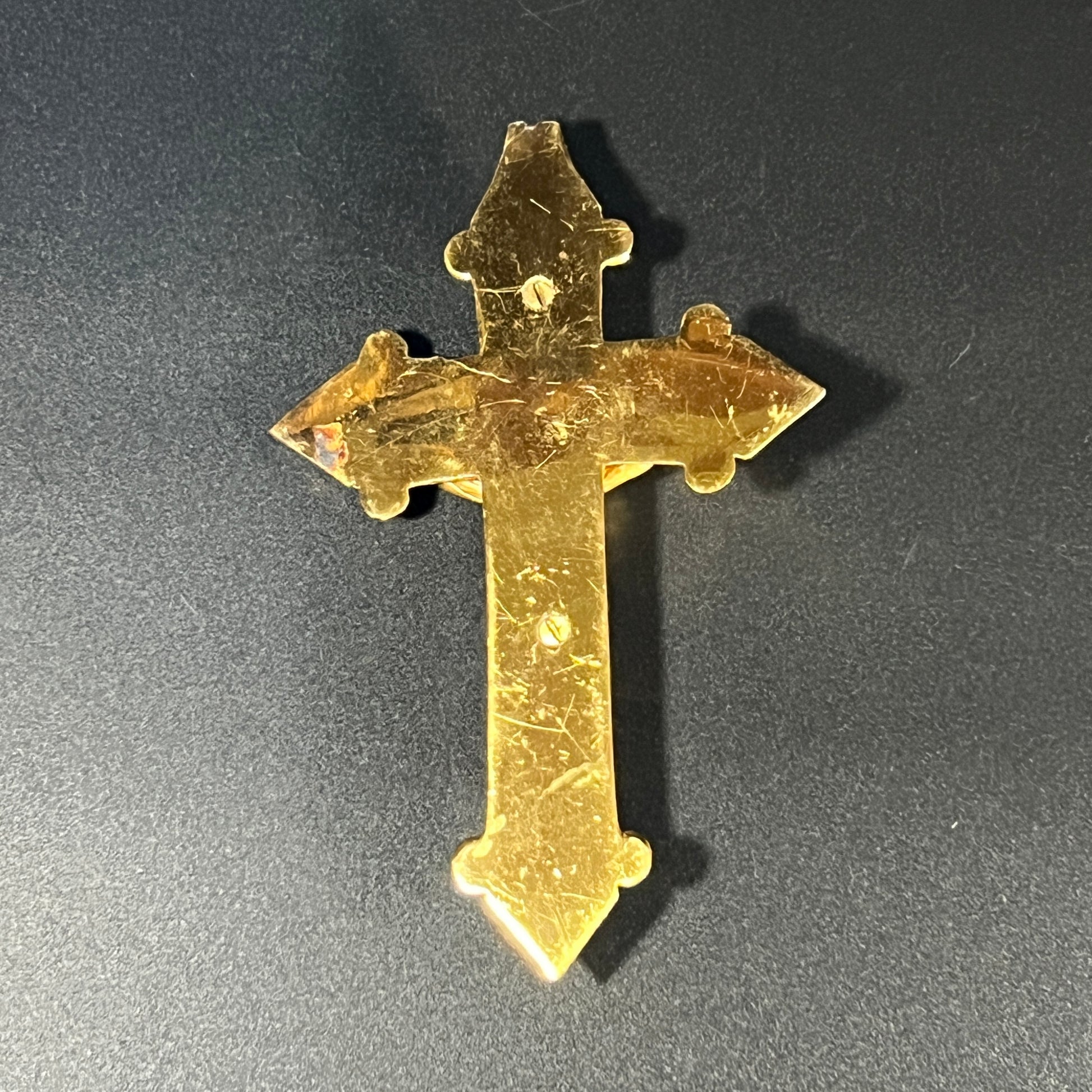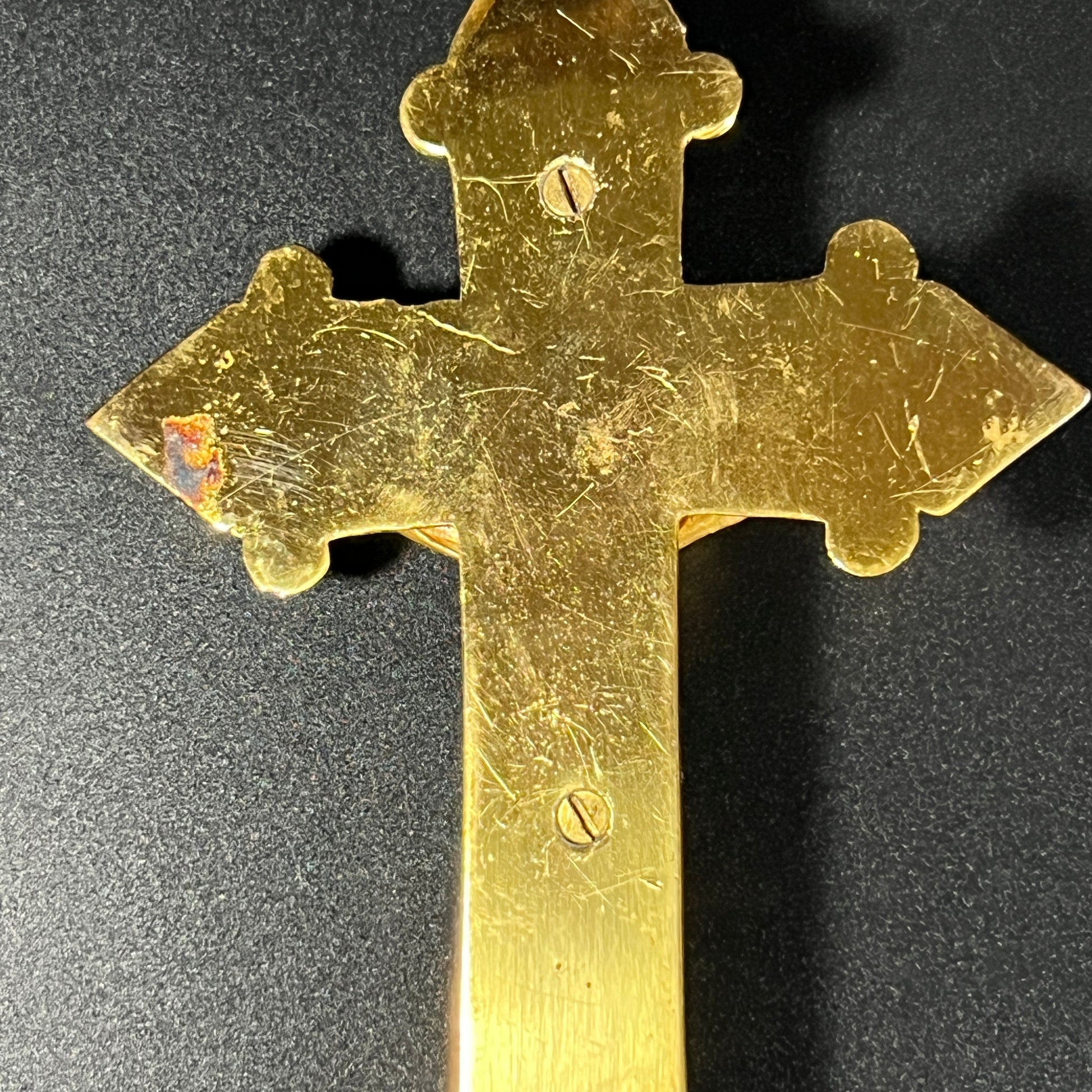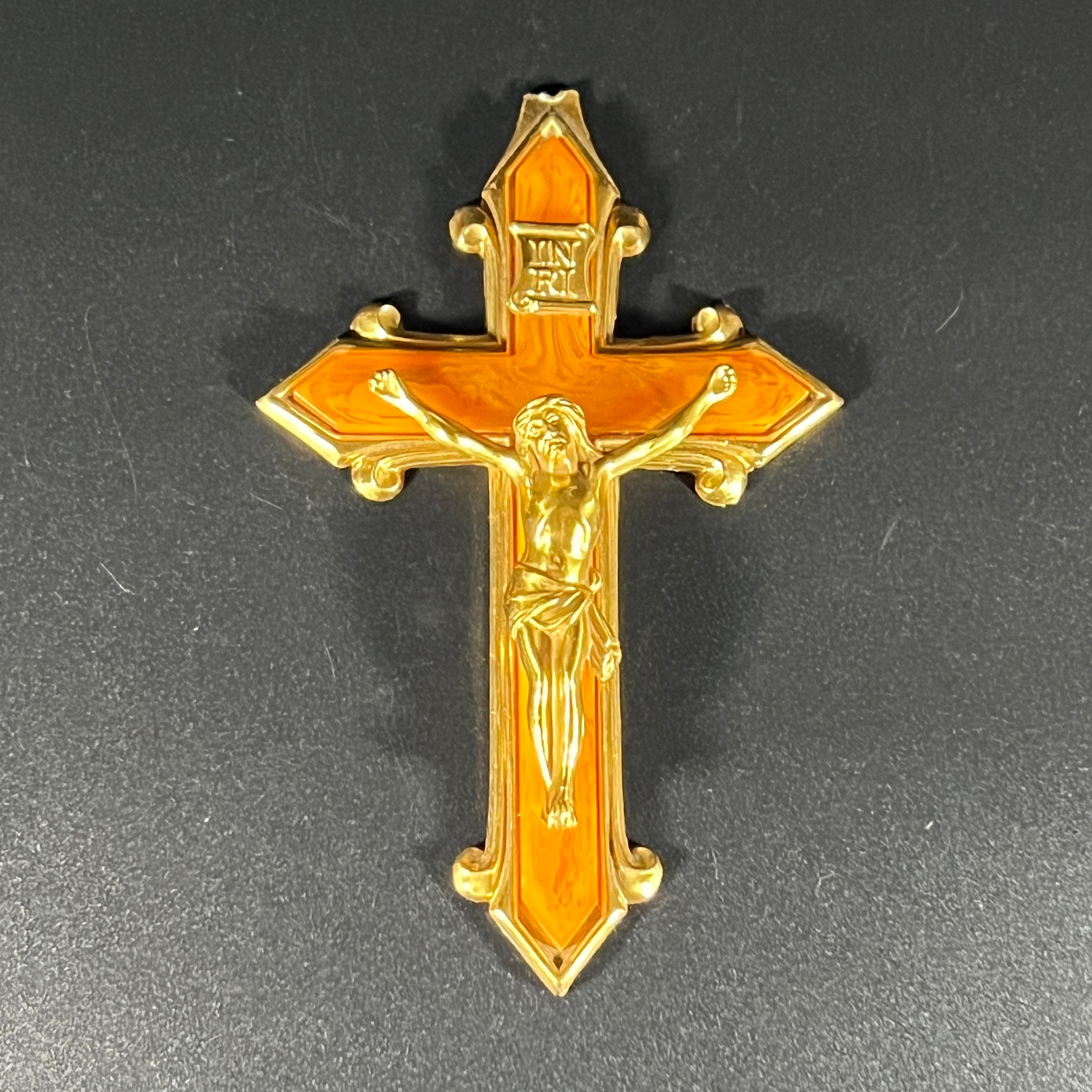 This vintage 1940s INRI crucifix is a beautifully preserved piece of religious art, crafted from gold-plated brass and rich marbled orange Bakelite, often referred to as butterscotch Bakelite. A striking blend of faith and mid-century design, this 6" crucifix makes a meaningful addition to any devotional space or vintage collection. While it is in good vintage condition overall, please note that the top hole appears to be missing. See photos, it has been priced accordingly. Measures approximately 6" H x 4" W x 0.75" D. A timeless symbol of devotion and a wonderful example of vintage religious craftsmanship.