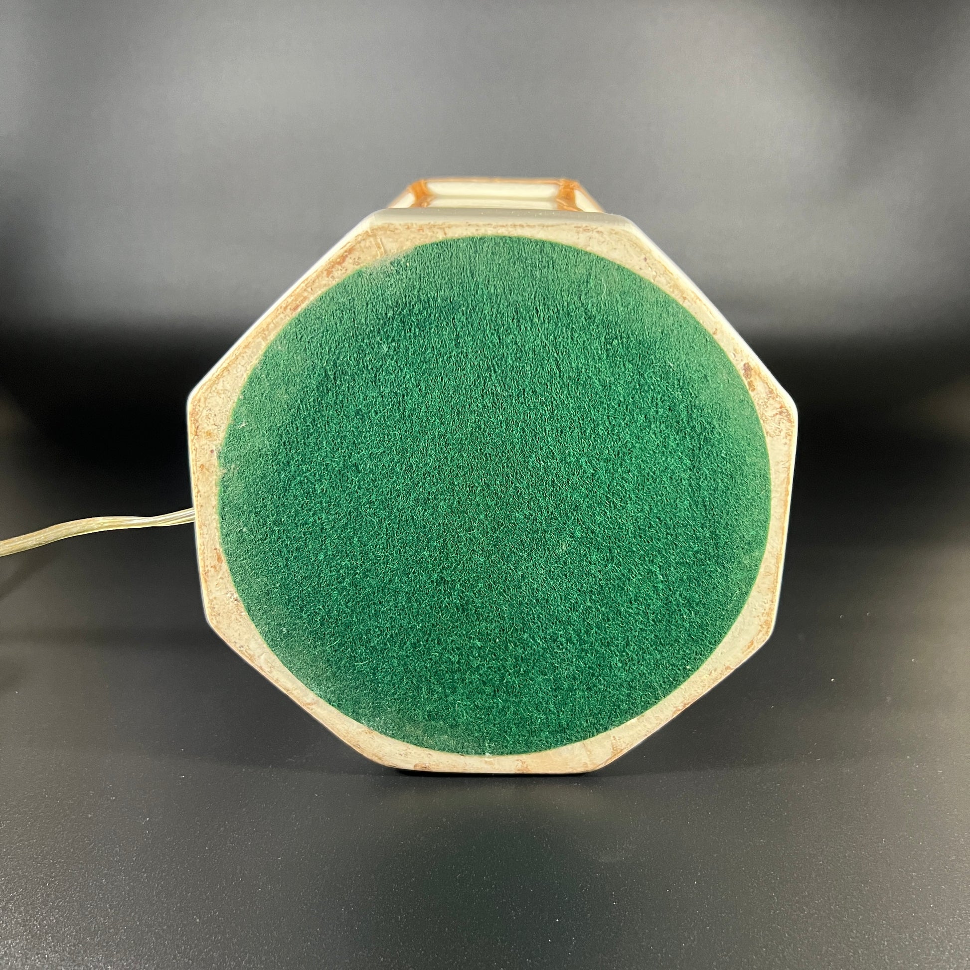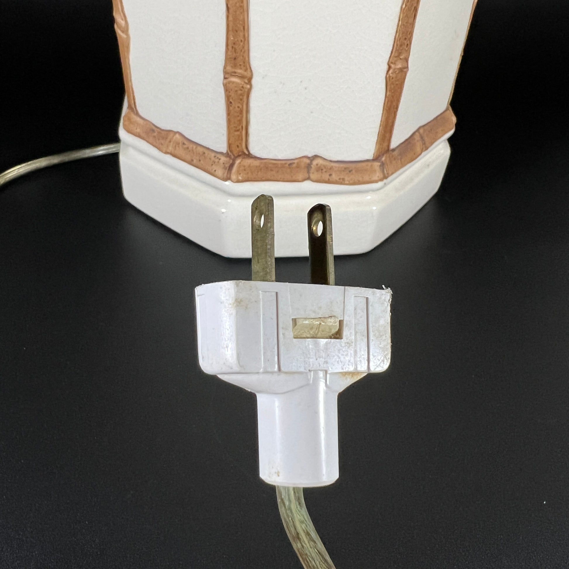 Stunning Vintage 1950s Hollywood Regency Faux Bamboo Porcelain Table Lamp – a true statement piece! This elegant lamp exudes timeless charm with its graceful faux bamboo design, a hallmark of mid-century sophistication. It shows the beautiful patina of age with some subtle, age-appropriate wear and delicate crinkling that only adds to its character. Please note, the lamp is sold without a shade, giving you the perfect opportunity to pair it with your ideal accent. Dimensions: 7" W x 30" H x 7" D.