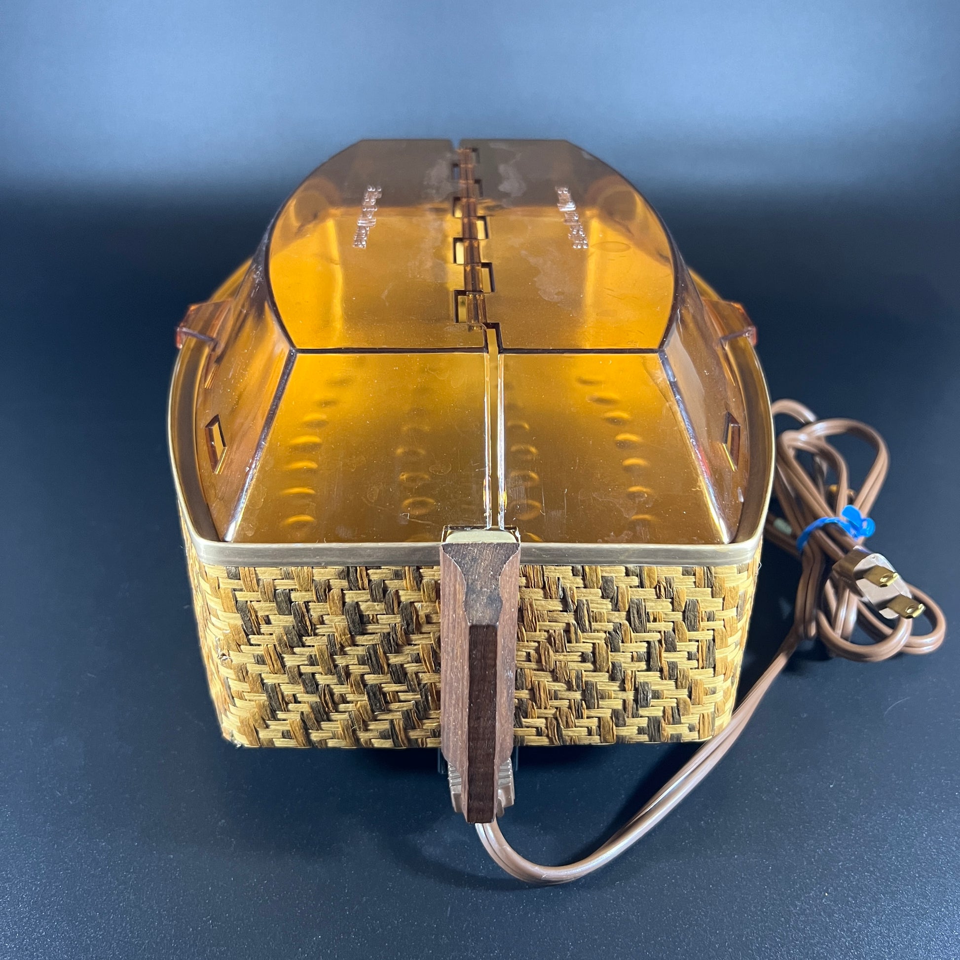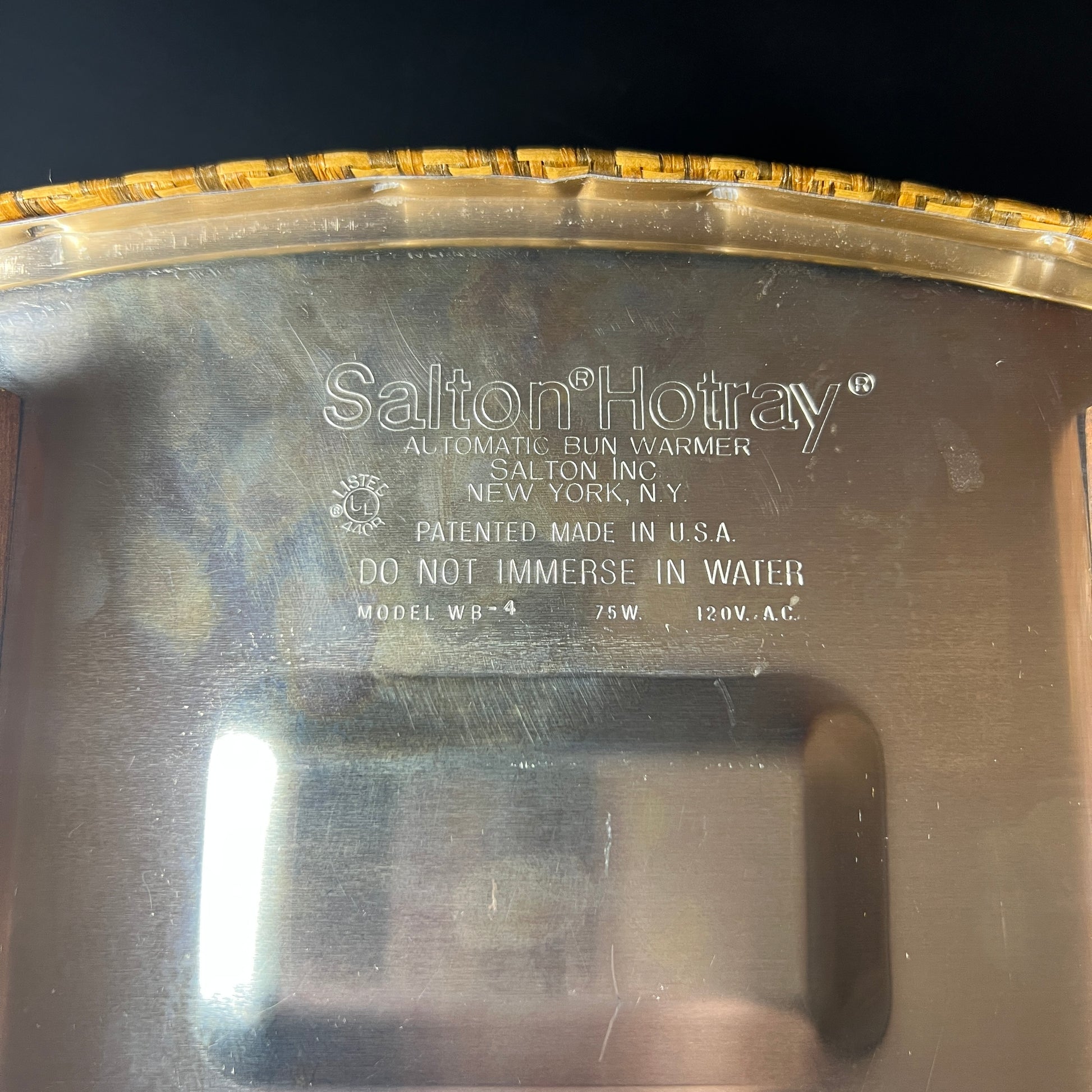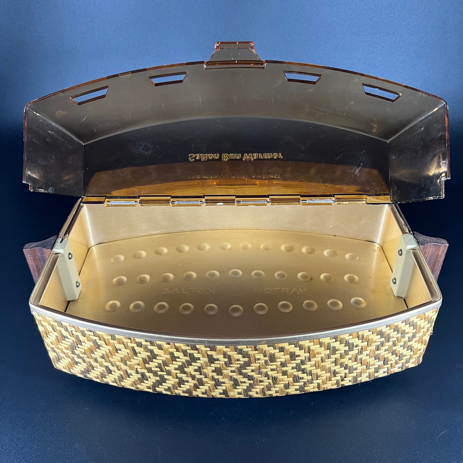 This vintage 1960s Salton Hotray Bun Warmer, Model WB-4, is a charming and functional piece of mid-century kitchenware. Made in New York, USA, it features a woven exterior with sturdy wooden handles and legs, and is topped with an amber plastic lid. The basket portion measures approximately 12 by 8 inches, while the full unit measures about 5.5 inches high, 14 inches wide, and 8.5 inches deep. The item is clean, has been tested, and works perfectly. It also includes the original power cord. A great addition to any retro kitchen collection or for practical use during gatherings and meals.