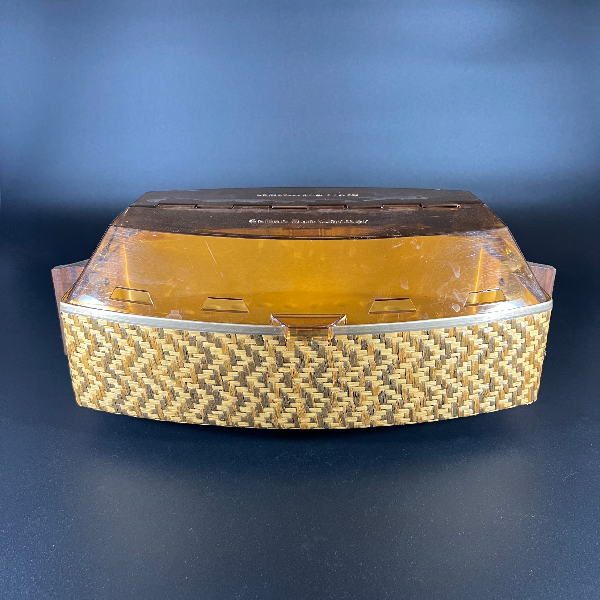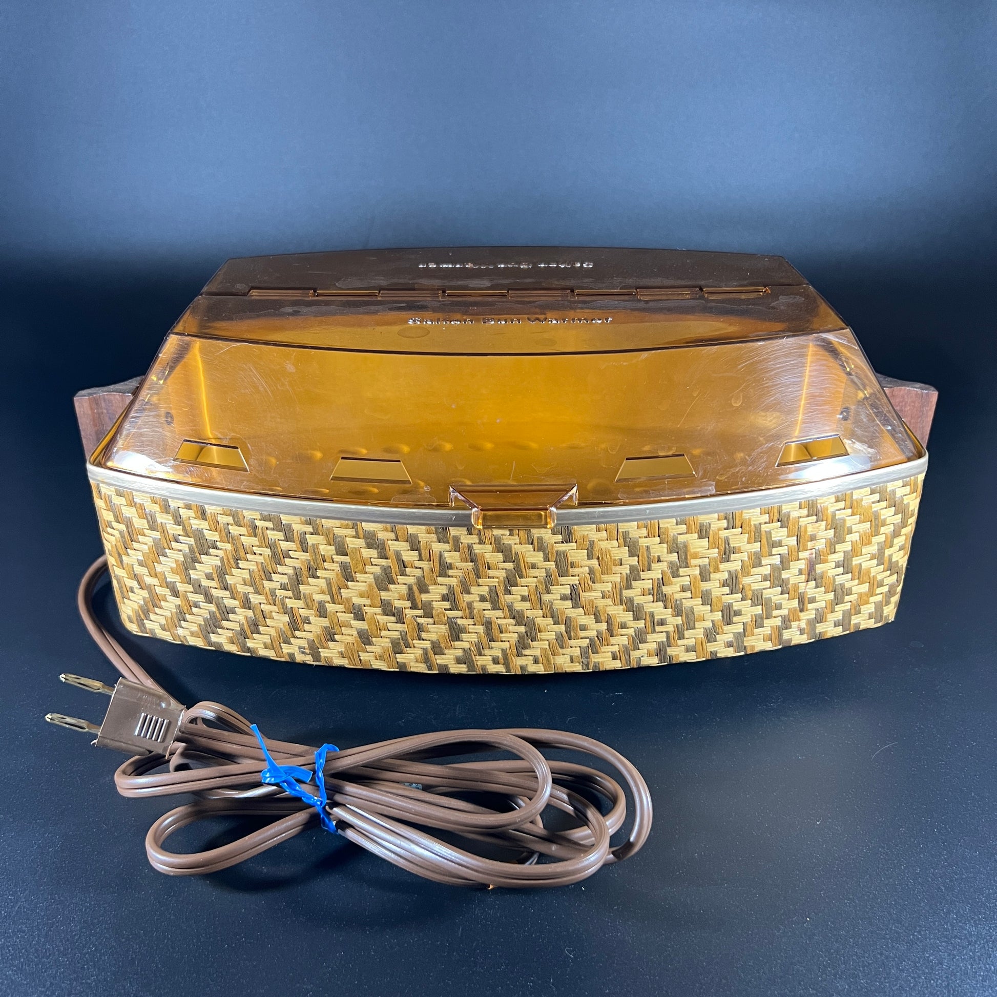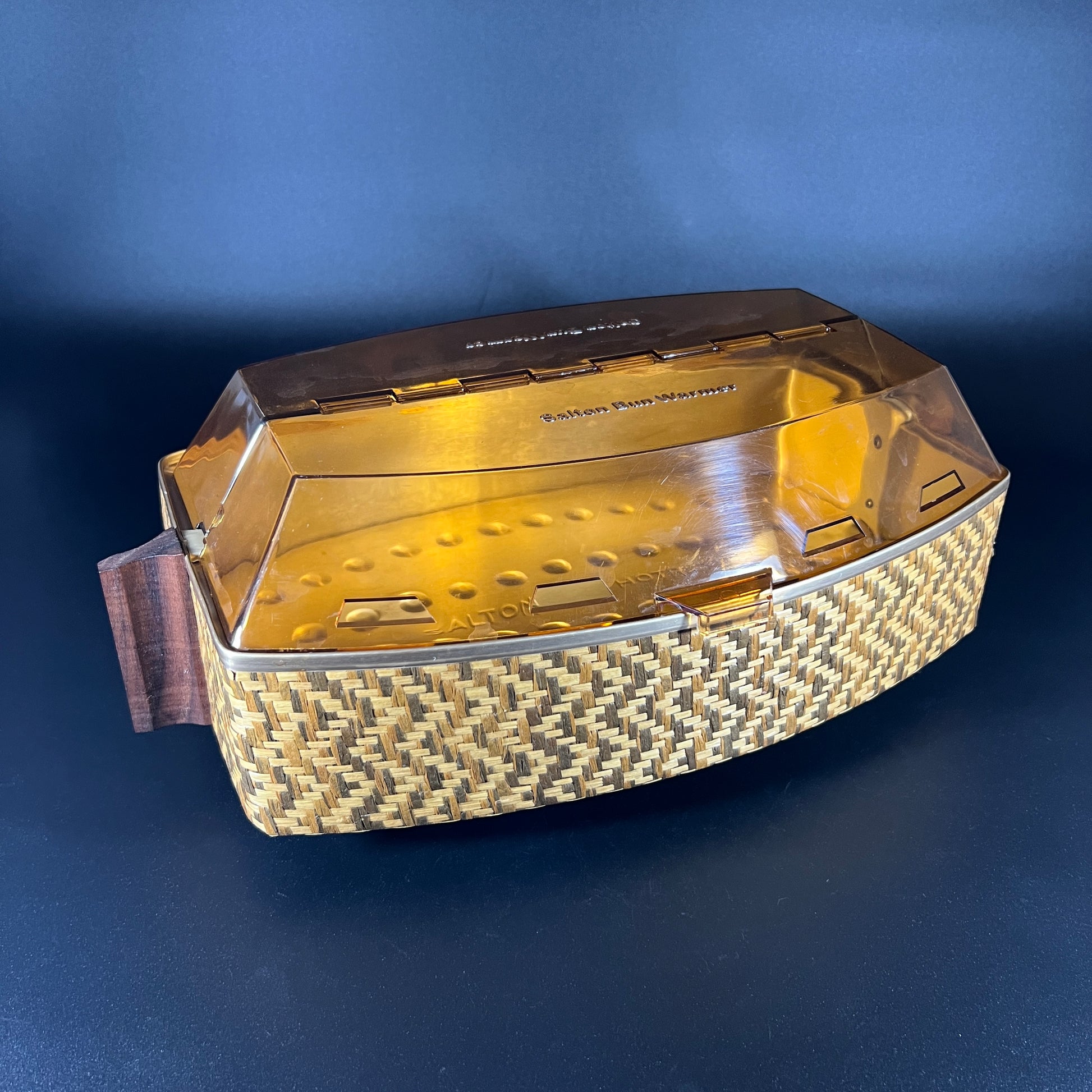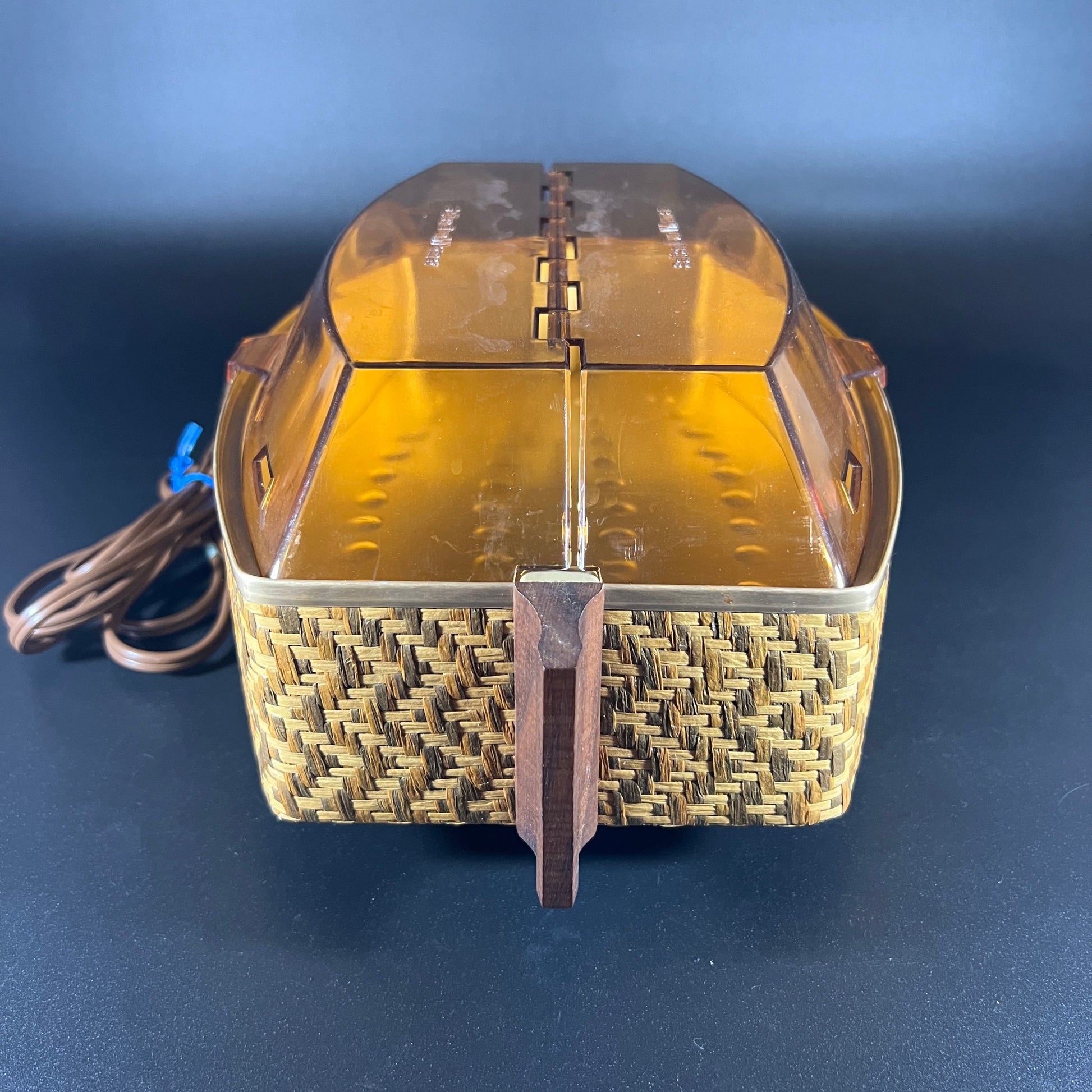 This vintage 1960s Salton Hotray Bun Warmer, Model WB-4, is a charming and functional piece of mid-century kitchenware. Made in New York, USA, it features a woven exterior with sturdy wooden handles and legs, and is topped with an amber plastic lid. The basket portion measures approximately 12 by 8 inches, while the full unit measures about 5.5 inches high, 14 inches wide, and 8.5 inches deep. The item is clean, has been tested, and works perfectly. It also includes the original power cord. A great addition to any retro kitchen collection or for practical use during gatherings and meals.