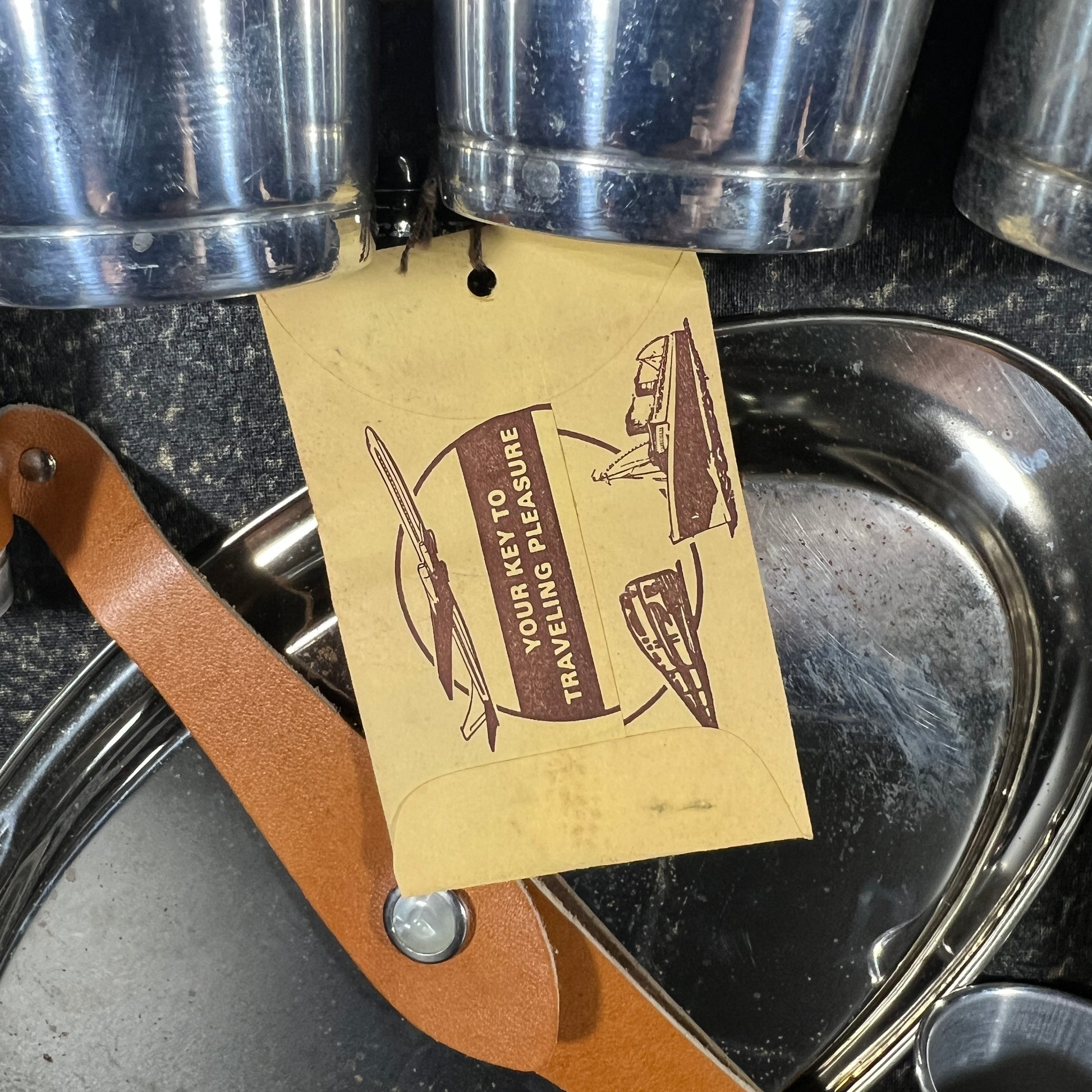 Inside, the set is in remarkable shape. The components appear to be made of aluminum or stainless steel, and all pieces are clean and shiny. The set includes a 10" oblong silver tray, four 3.5" tall glasses, two 2.25" shot glasses, an 8" swizzle spoon, and a bottle opener. Each item is secured with genuine top grain cowhide strapping.