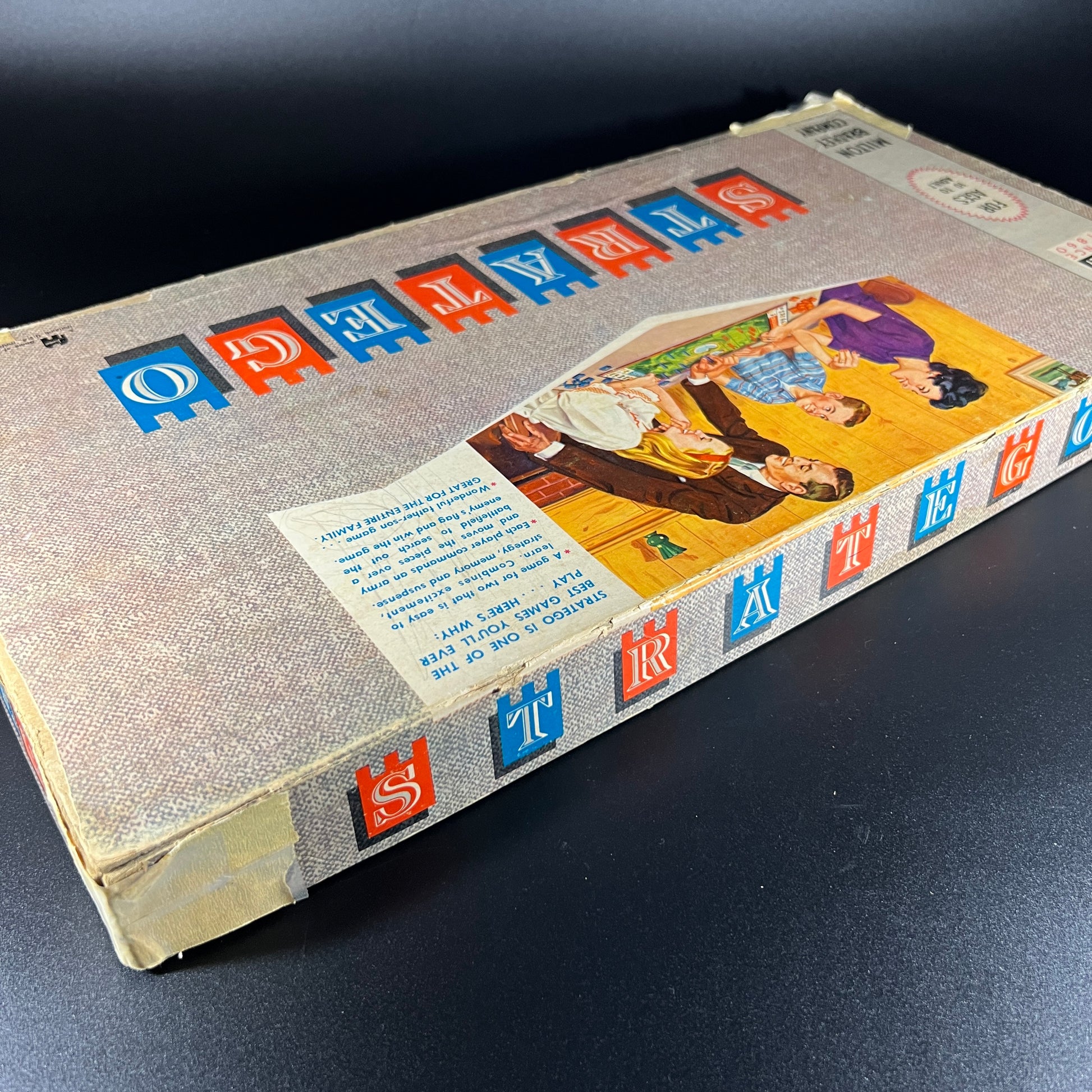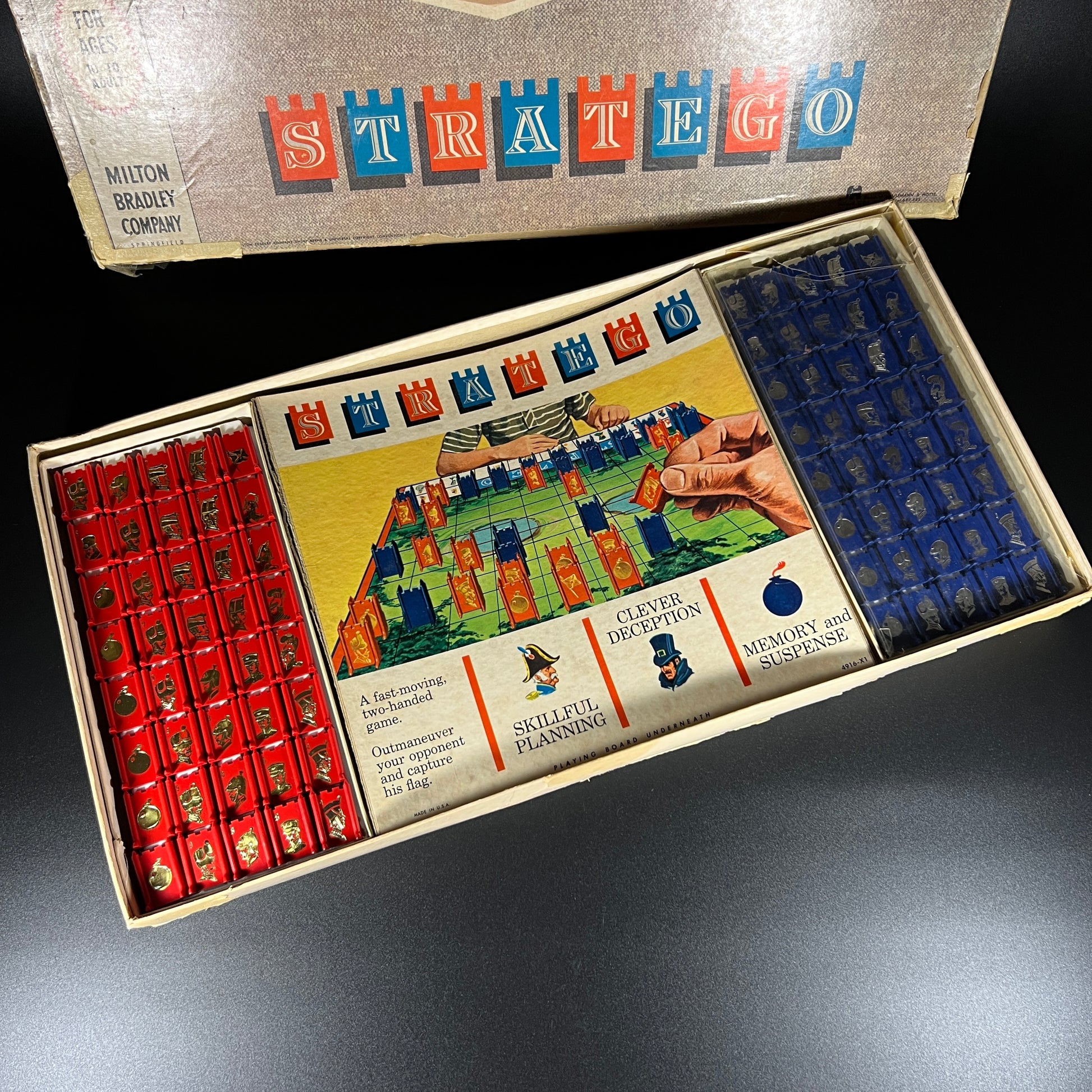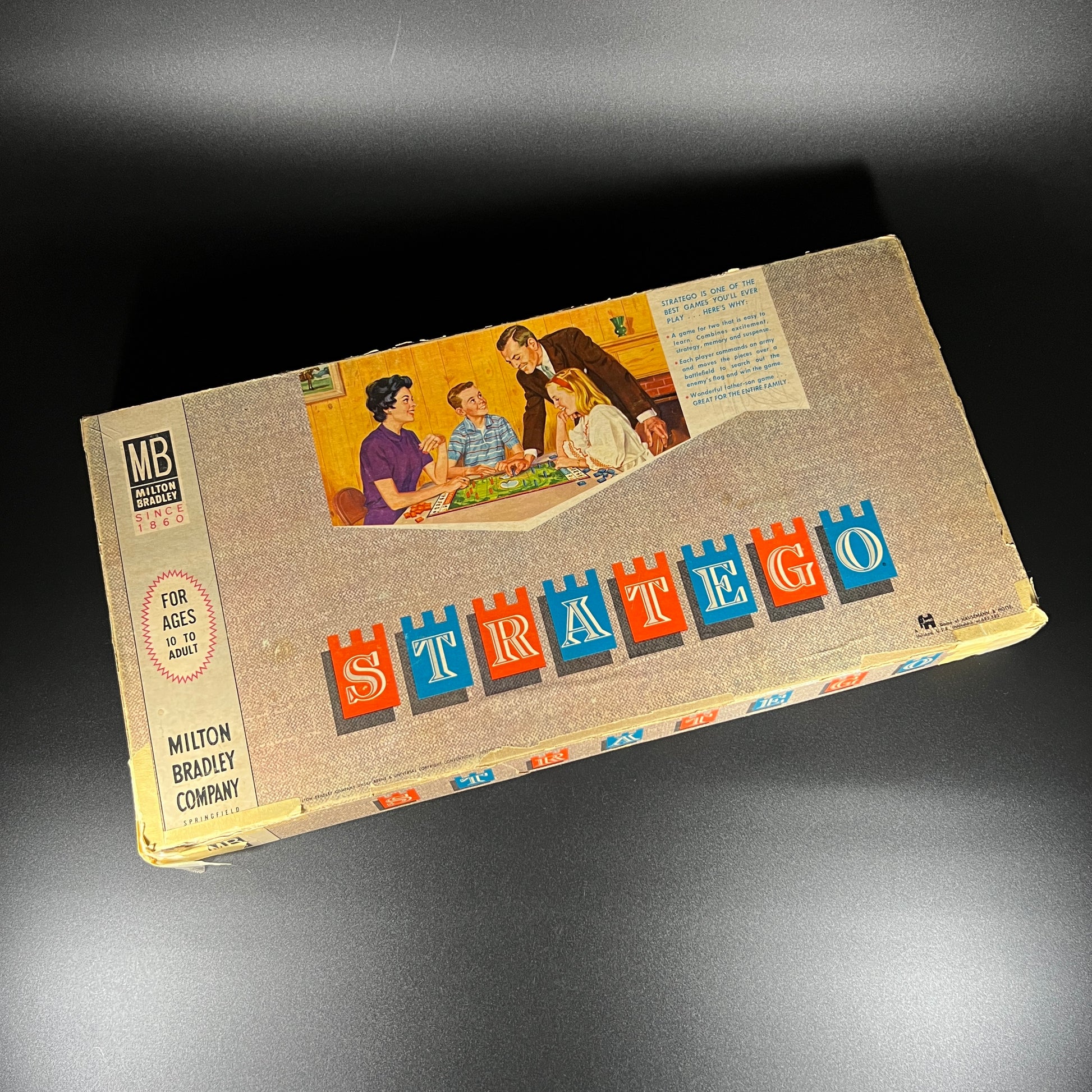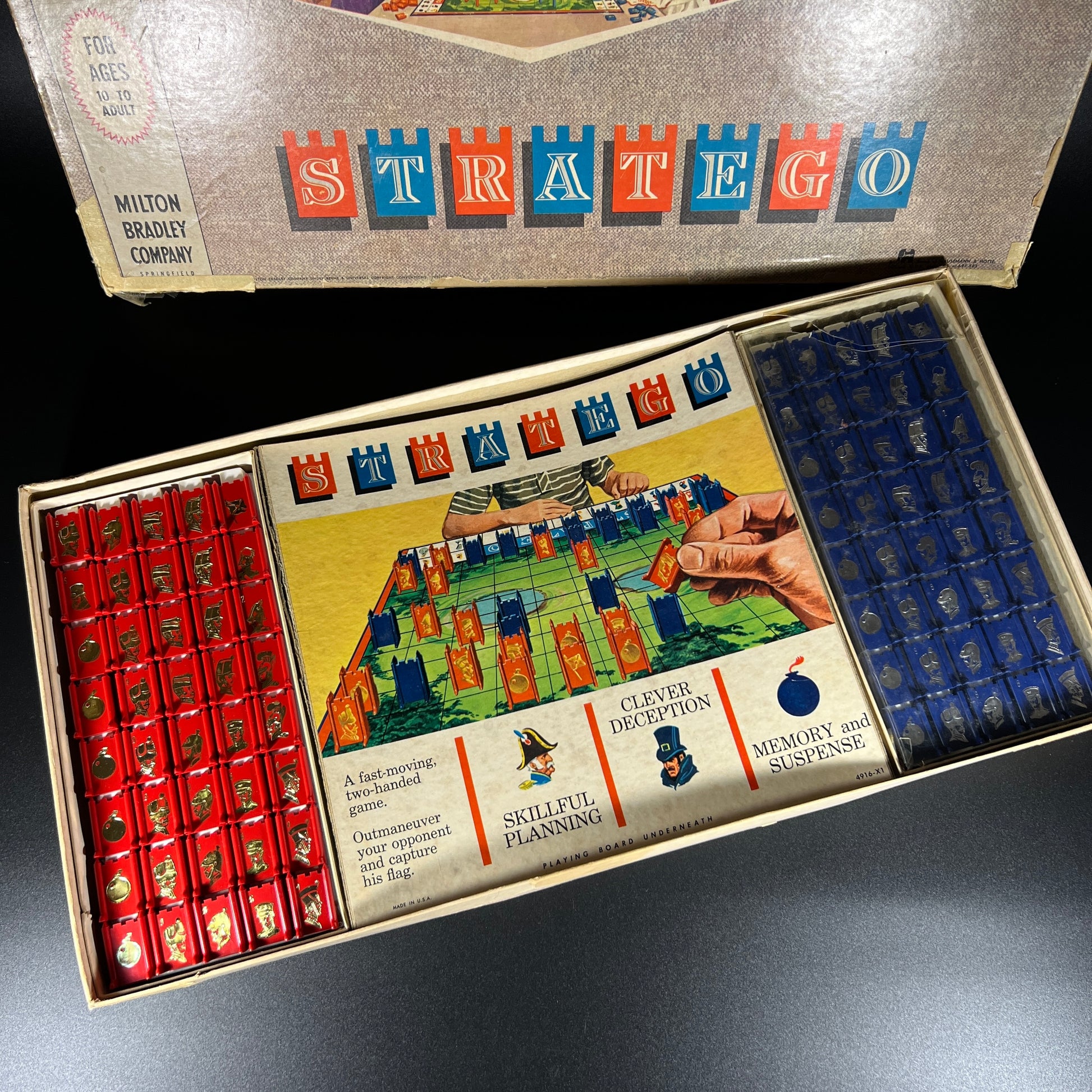 This is a vintage 1962 Stratego board game by Milton Bradley—an excellent choice for retro game nights or collectors of classic games. This edition includes all original plastic playing pieces and is complete. The set is in good vintage condition overall; however, the box shows some wear and has been taped in certain areas. Please review the photos closely, as they provide the best representation of the item’s condition. The box measures approximately 19" x 9.75" x 1.75".