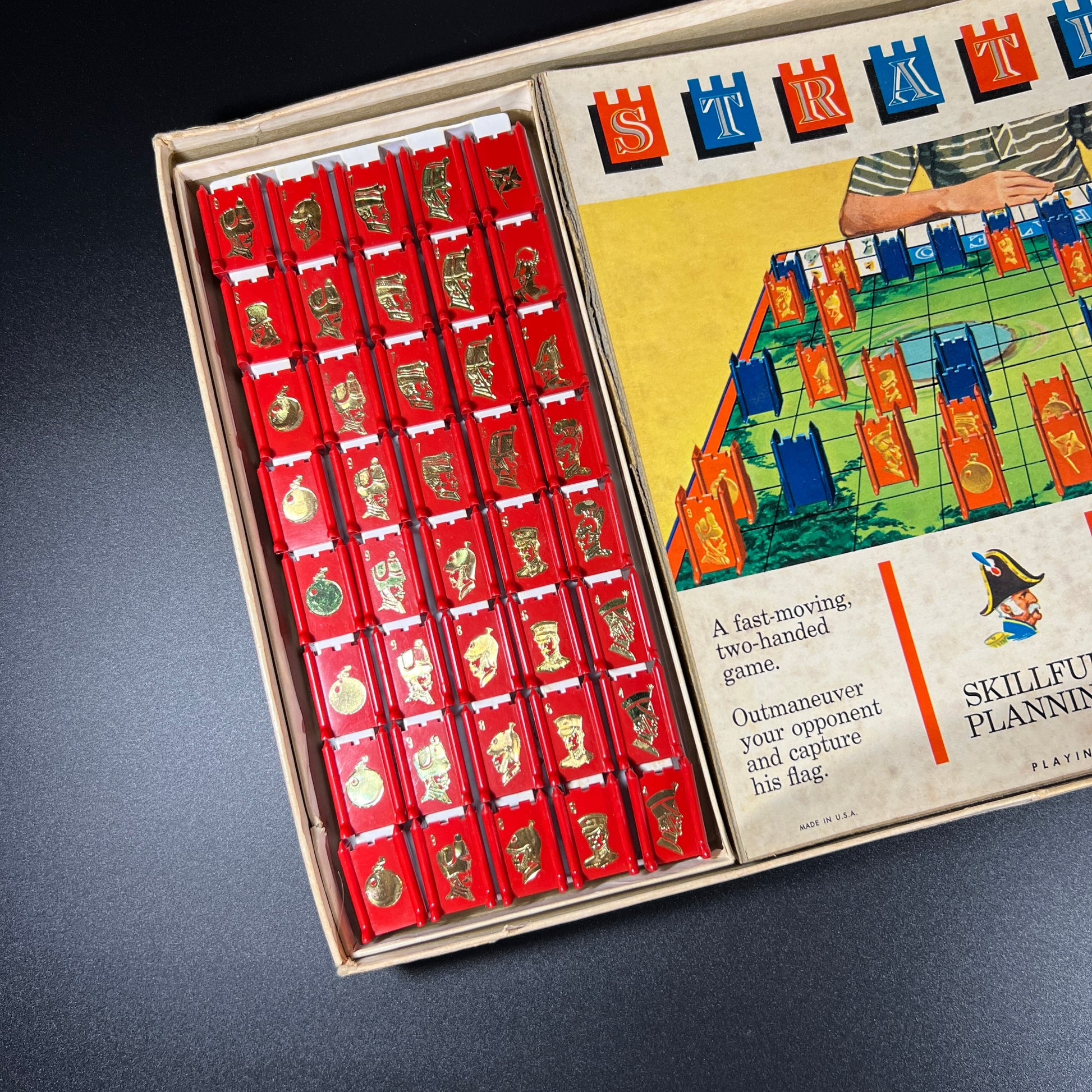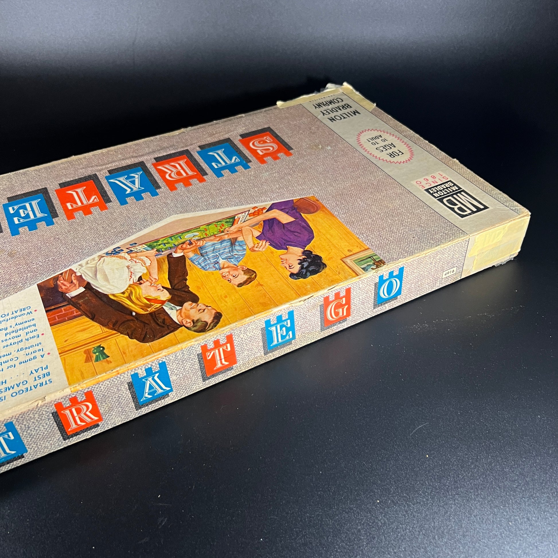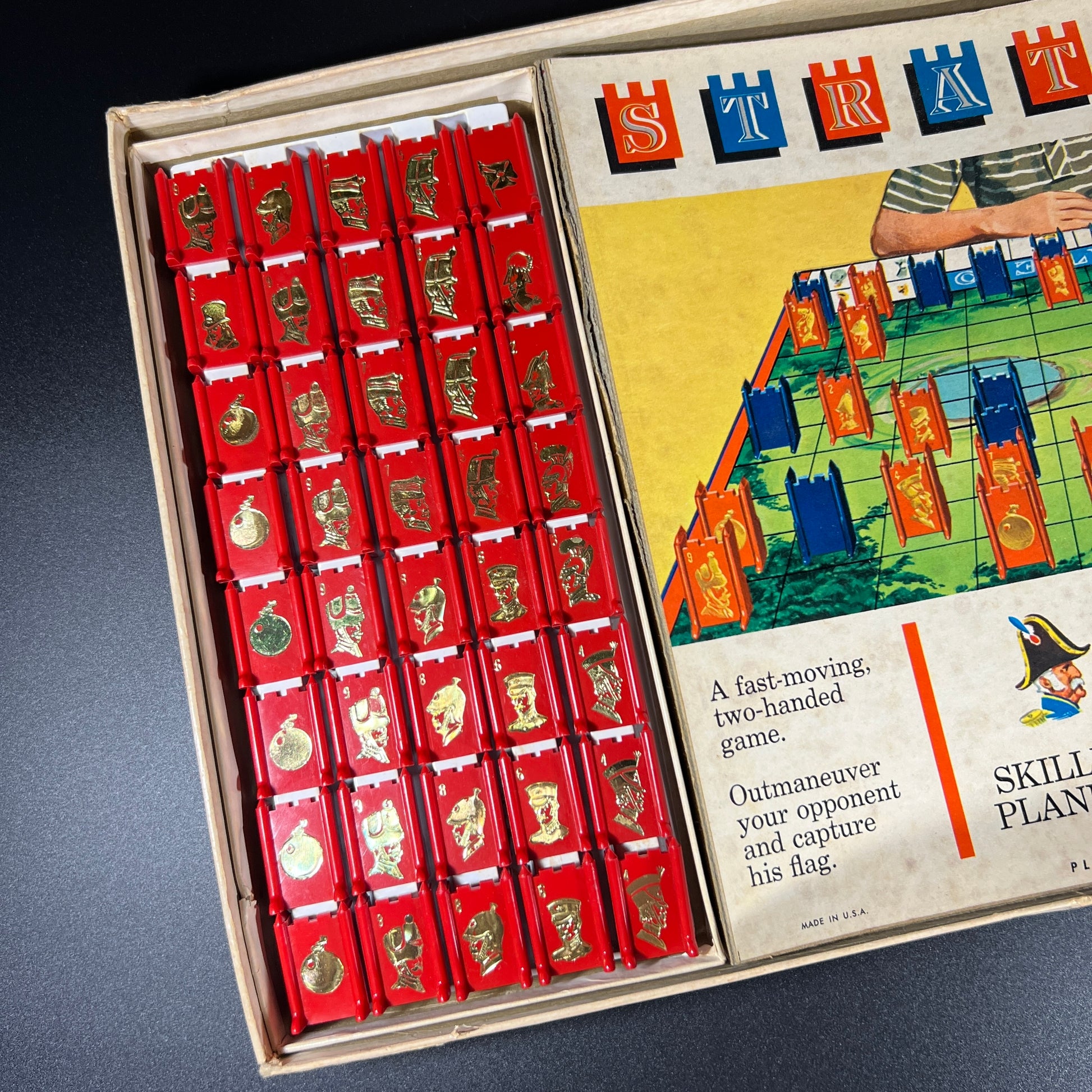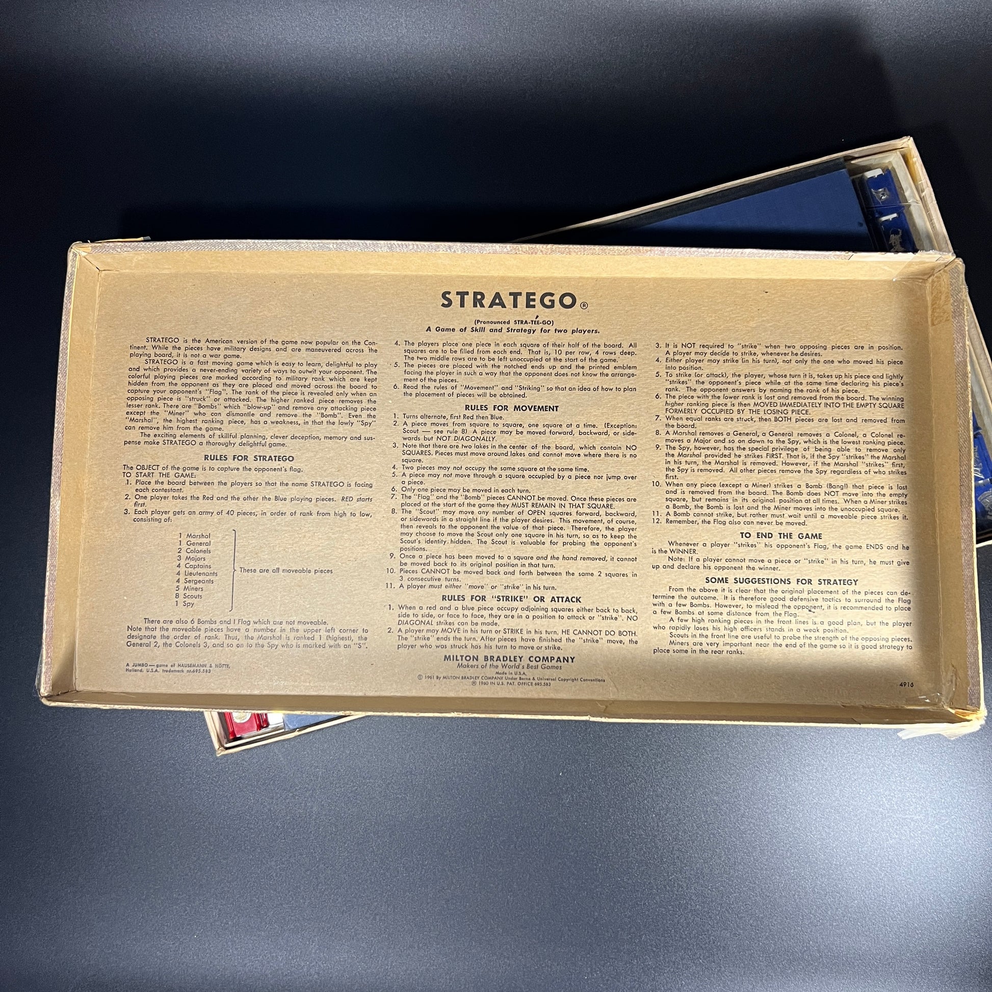 This is a vintage 1962 Stratego board game by Milton Bradley—an excellent choice for retro game nights or collectors of classic games. This edition includes all original plastic playing pieces and is complete. The set is in good vintage condition overall; however, the box shows some wear and has been taped in certain areas. Please review the photos closely, as they provide the best representation of the item’s condition. The box measures approximately 19" x 9.75" x 1.75".