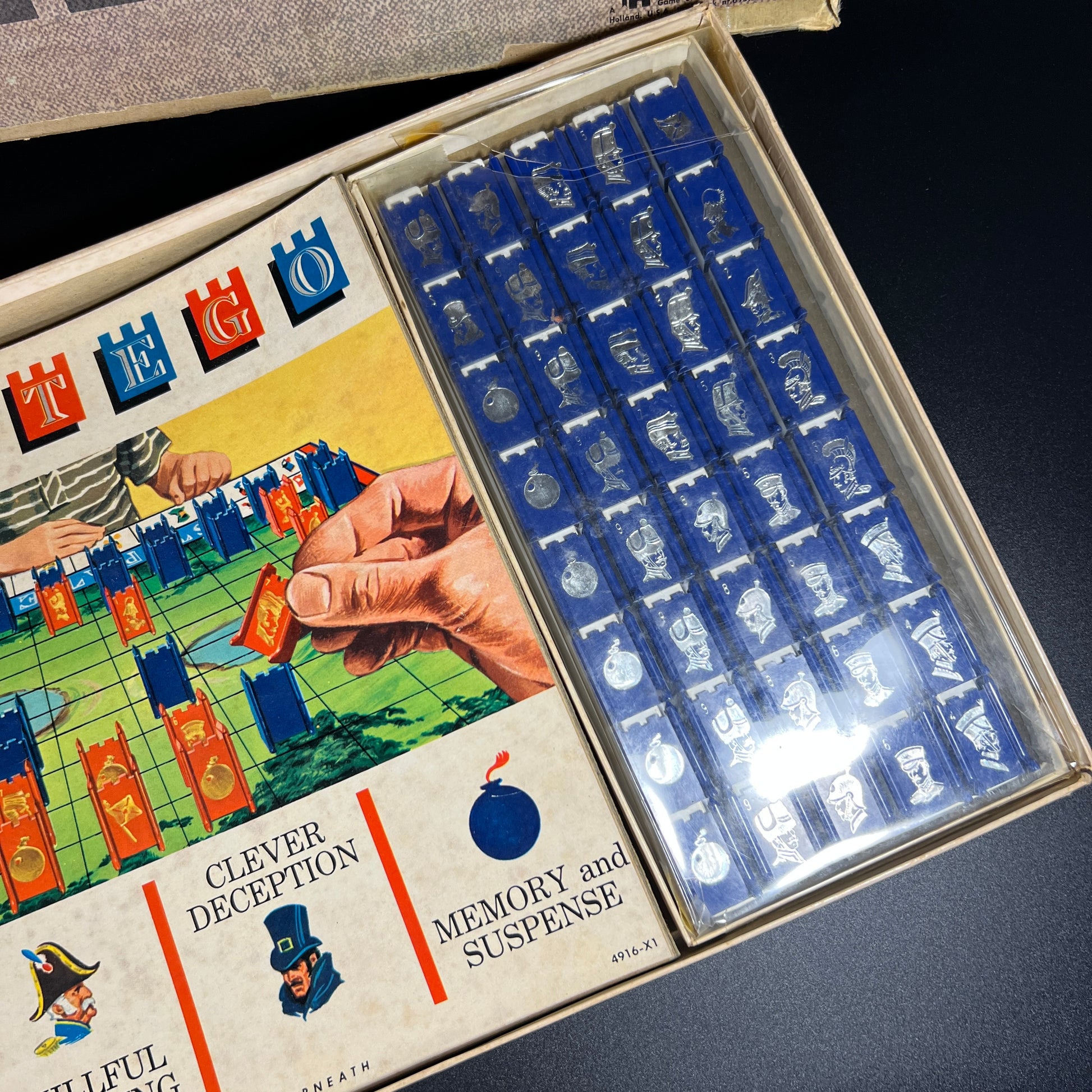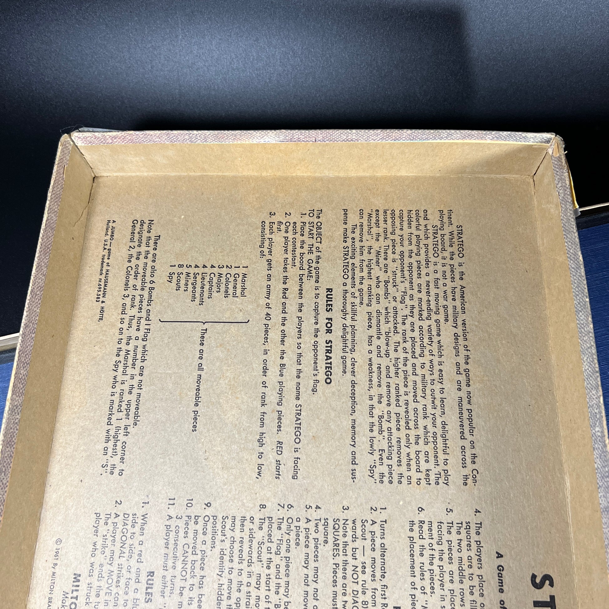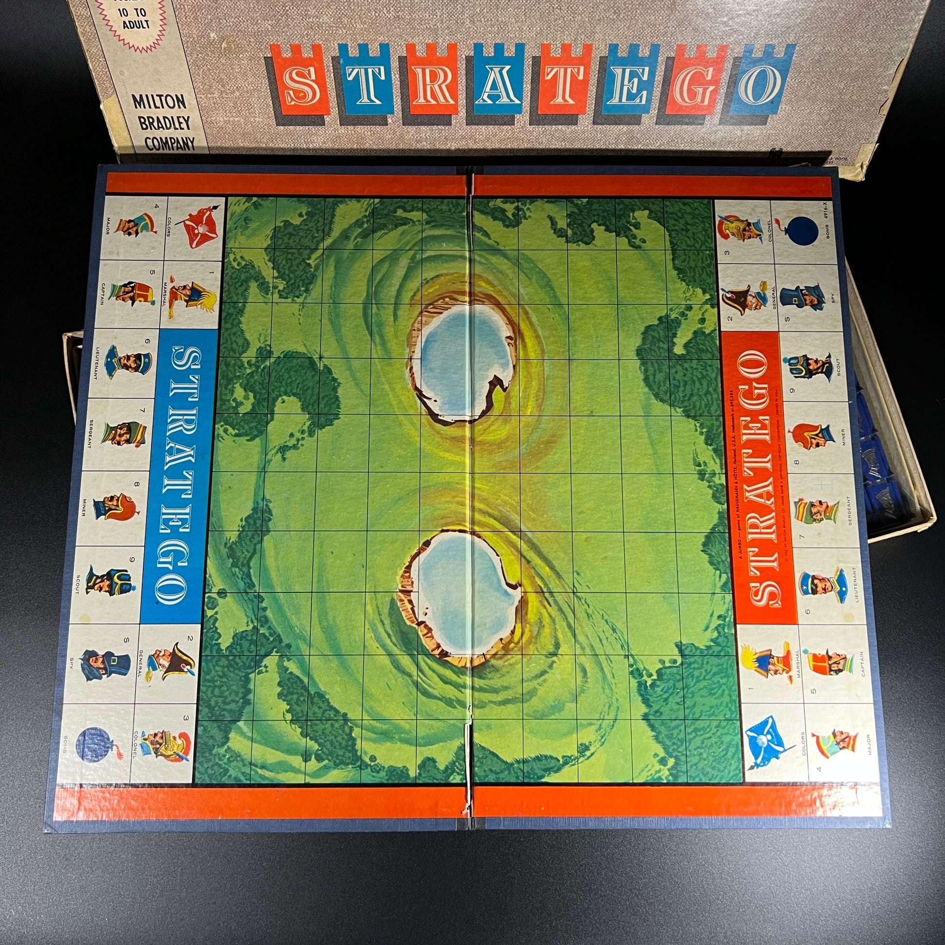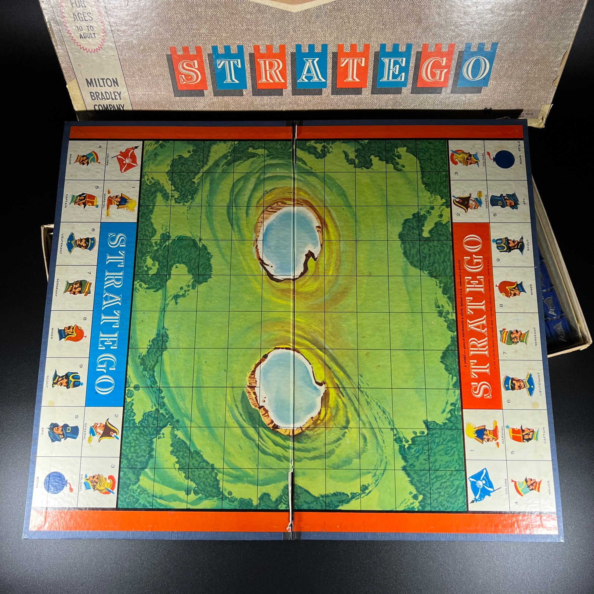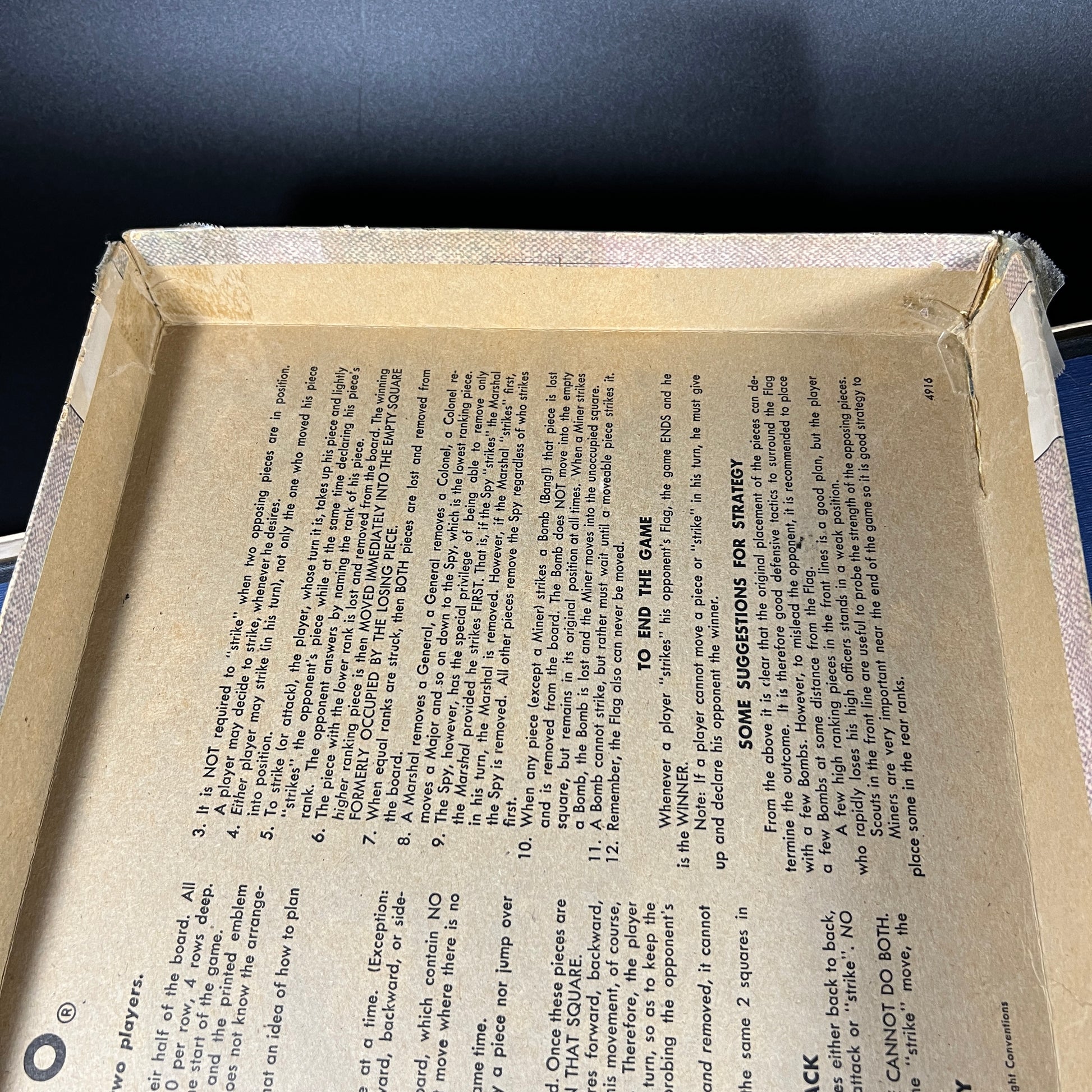 This is a vintage 1962 Stratego board game by Milton Bradley—an excellent choice for retro game nights or collectors of classic games. This edition includes all original plastic playing pieces and is complete. The set is in good vintage condition overall; however, the box shows some wear and has been taped in certain areas. Please review the photos closely, as they provide the best representation of the item’s condition. The box measures approximately 19" x 9.75" x 1.75".