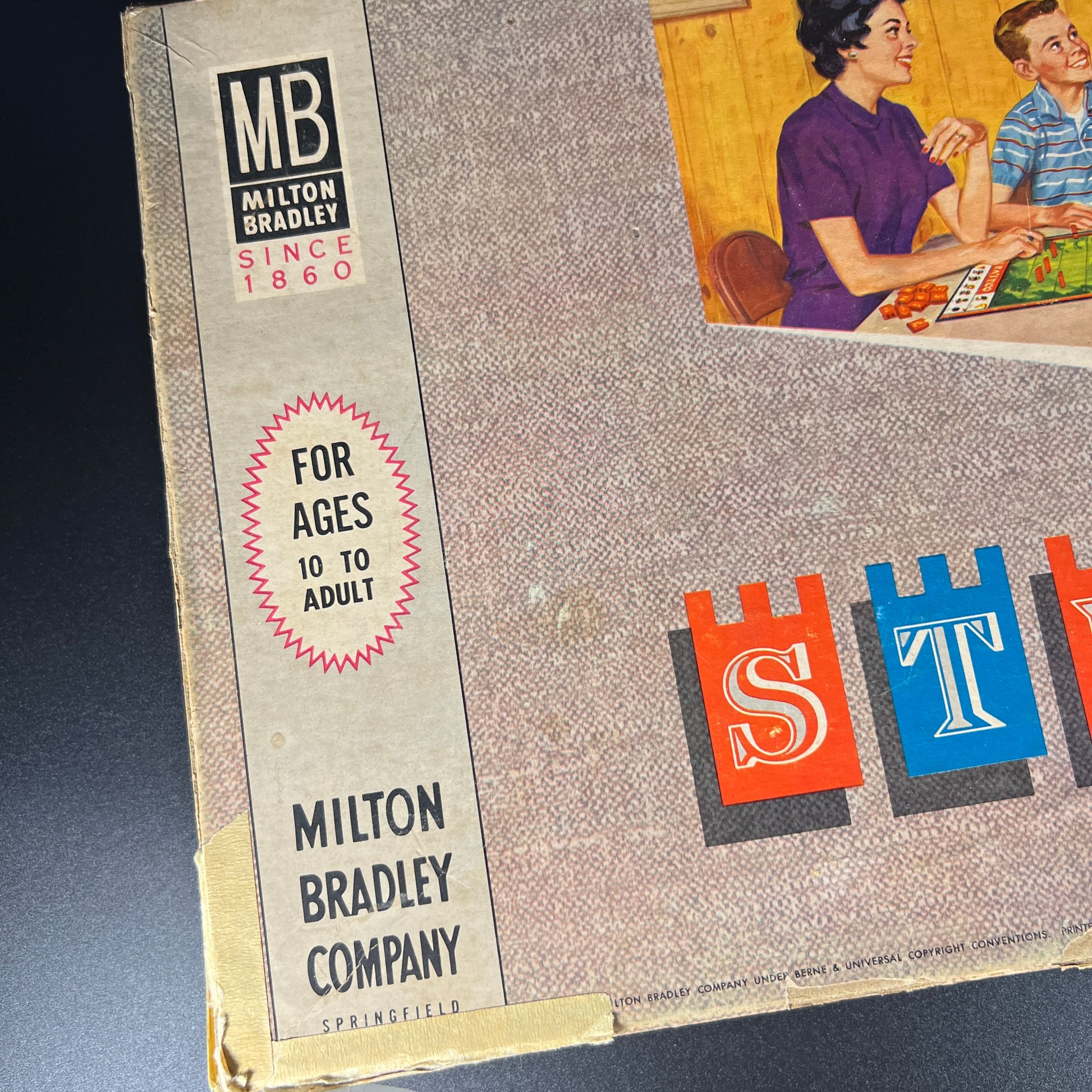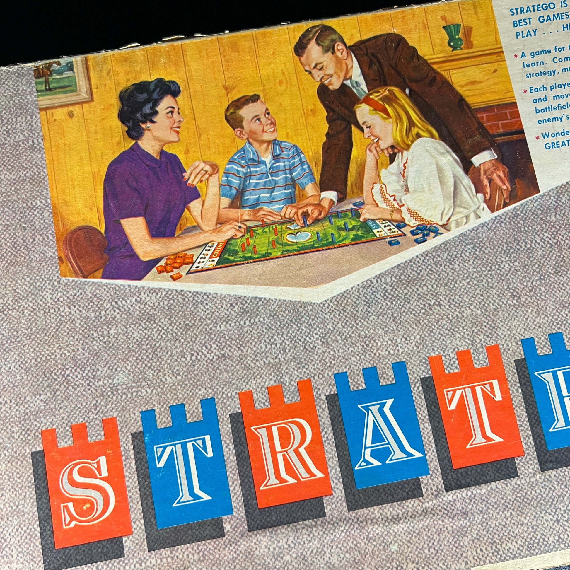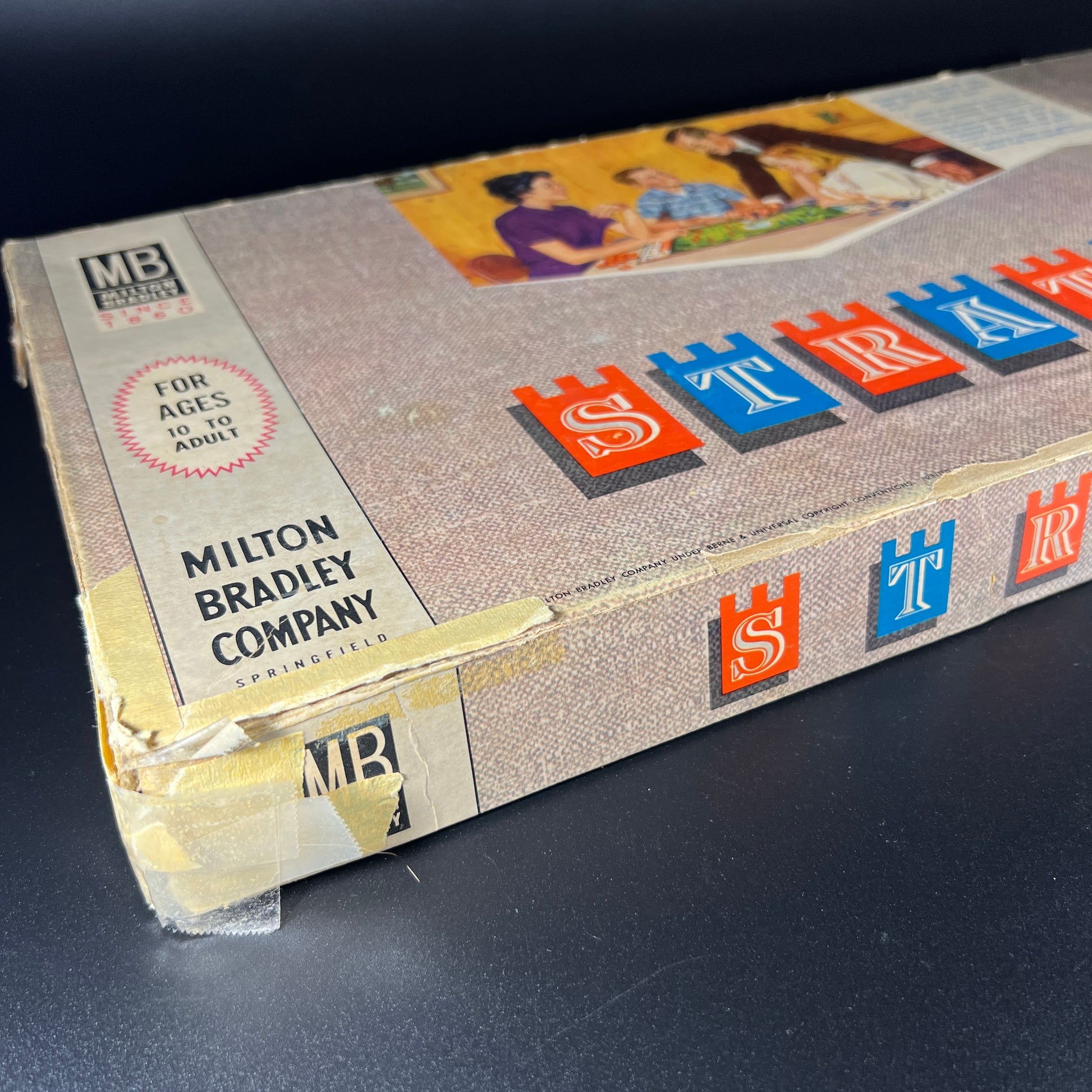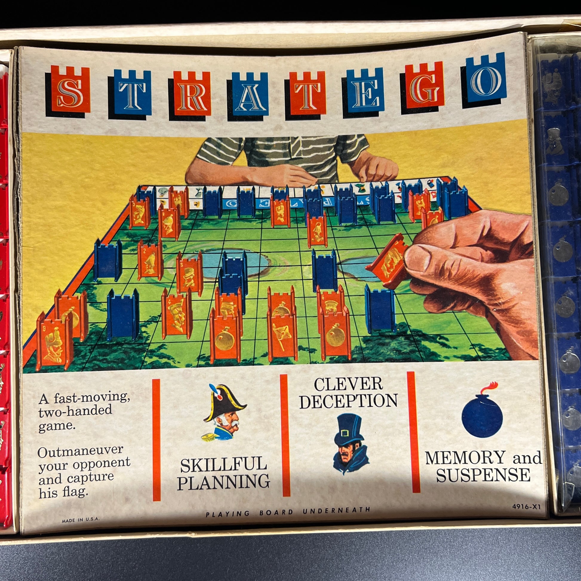 This is a vintage 1962 Stratego board game by Milton Bradley—an excellent choice for retro game nights or collectors of classic games. This edition includes all original plastic playing pieces and is complete. The set is in good vintage condition overall; however, the box shows some wear and has been taped in certain areas. Please review the photos closely, as they provide the best representation of the item’s condition. The box measures approximately 19" x 9.75" x 1.75".
