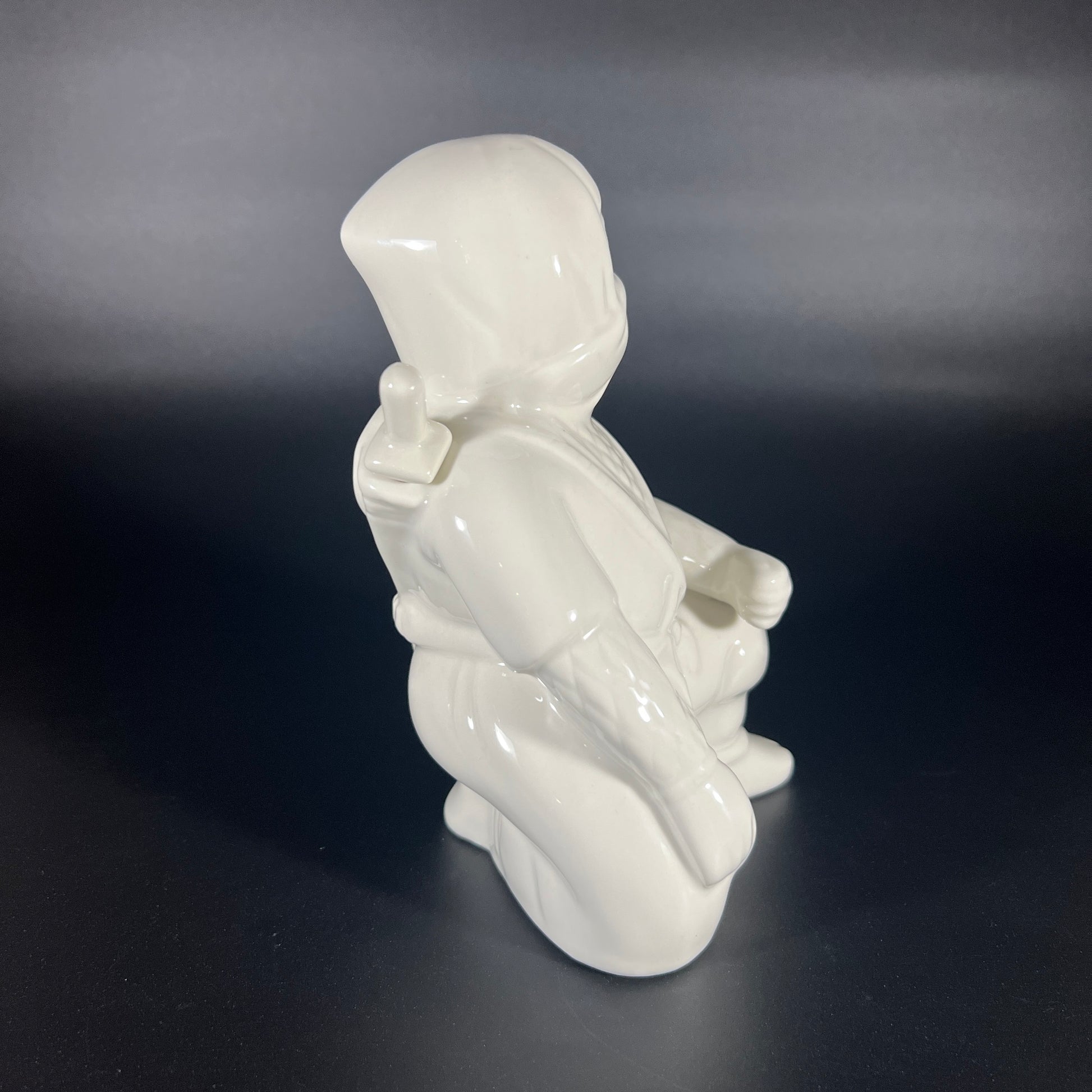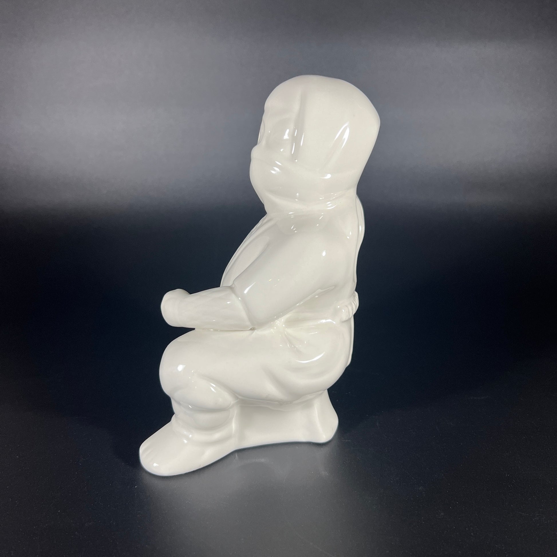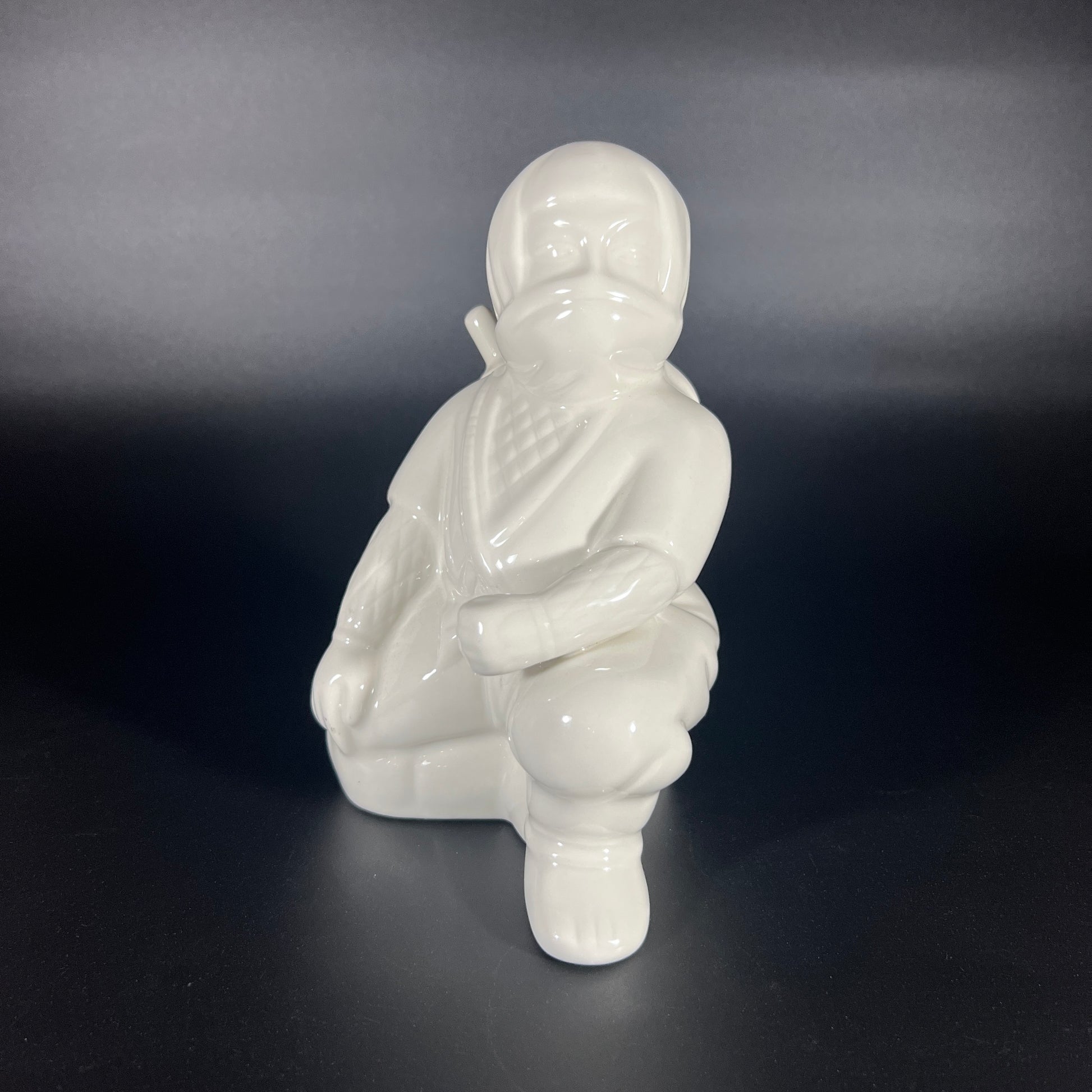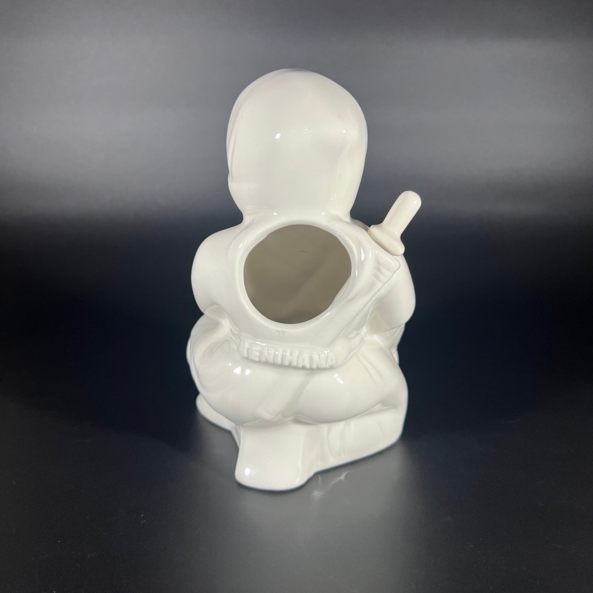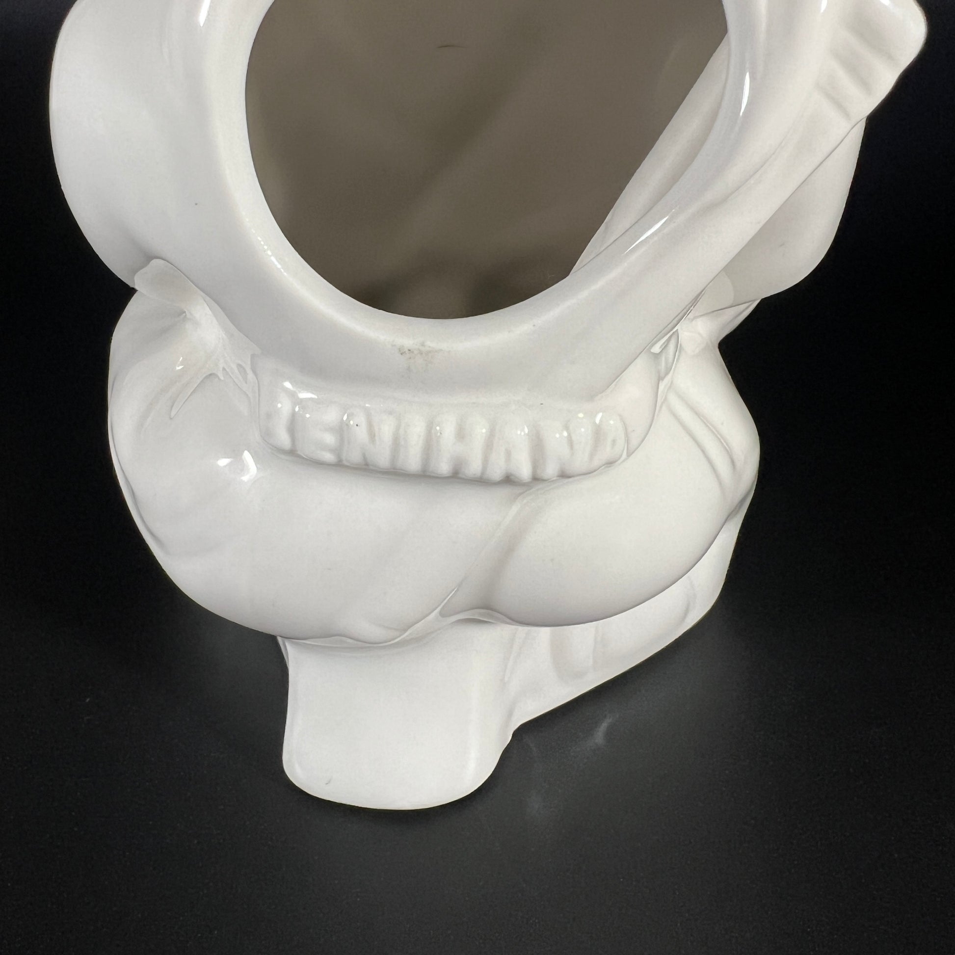 Vintage Benihana Tokyo Ninja Porcelain Cocktail Mug – a must-have for tiki cocktail enthusiasts and Japan collectors! From the 1970s, this rare and quirky white ninja mug features a shiny finish and is in excellent condition with no chips or cracks. It comes complete with the original sword, which is a hard-to-find feature. The mug has a larger hole on the back for filling with your favorite drink and a small hole on the side to hold the ninja’s sword. It stands at 7.25" high, 4.5" wide, and 5.5" deep, making it a fun and functional addition to any collection.