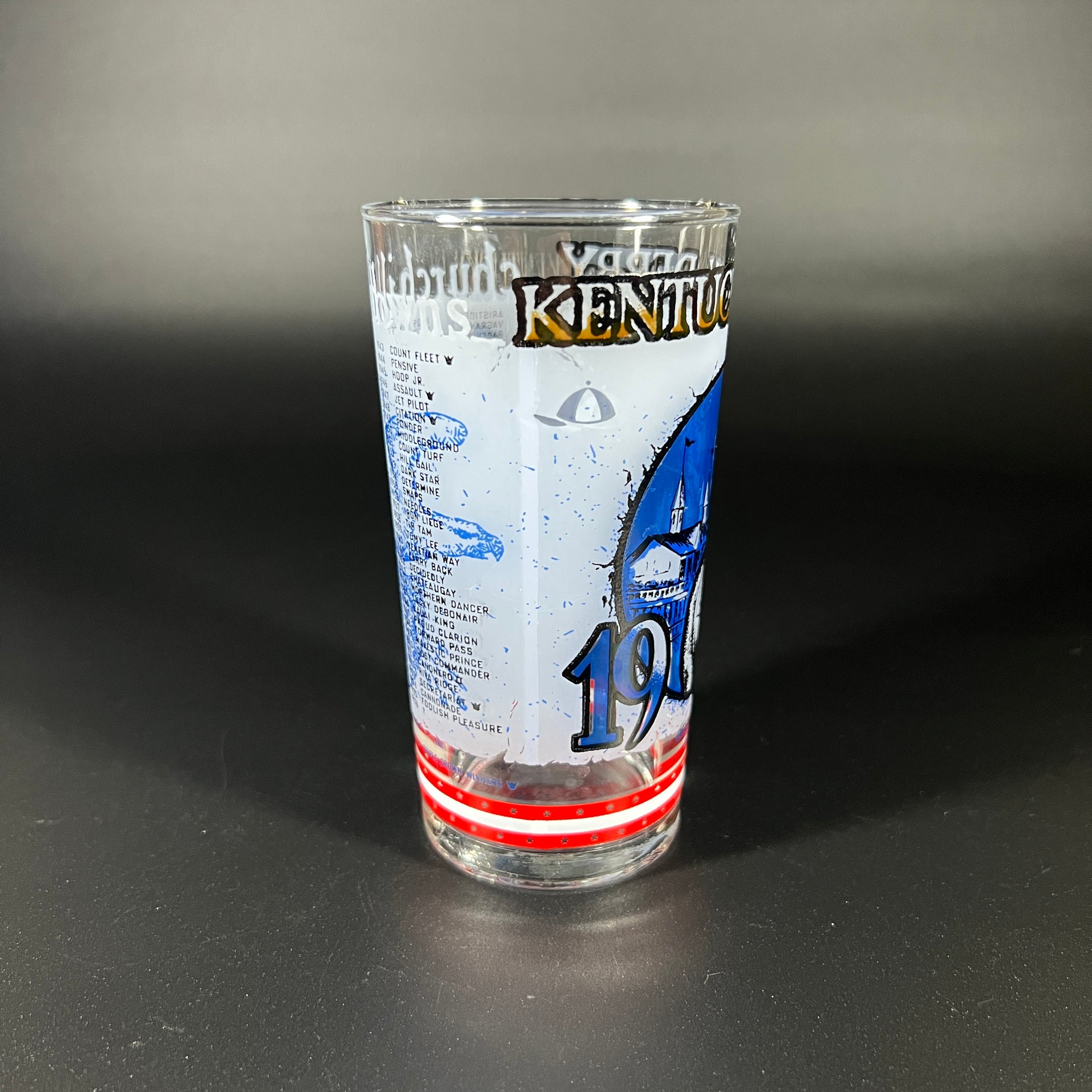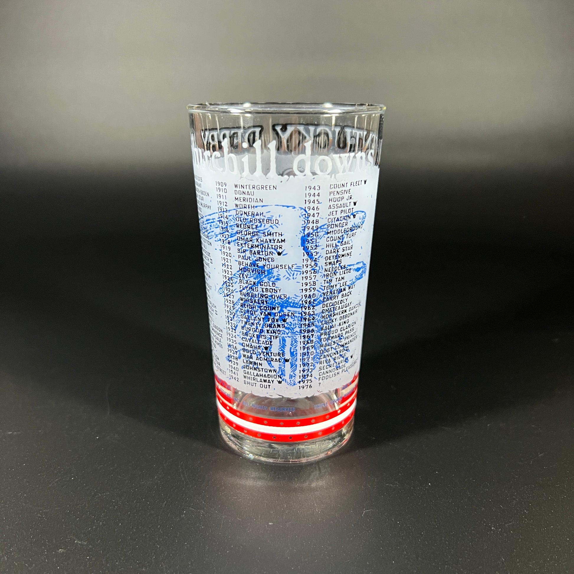 This 1976 Official Kentucky Derby Glass commemorates the 102nd running of the legendary race. Featuring the iconic Twin Spires and a list of past race winners, this mint julep glass is both a timeless collectible and a must-have piece for any Derby party. The tradition of releasing a new design each year dates back to 1938 when Churchill Downs first began offering commemorative glasses for their signature drink, the mint julep. In good vintage condition, this glass measures approximately 5.25" H with a 2.75" diameter—perfect for display or enjoying your favorite cocktail in Derby style.