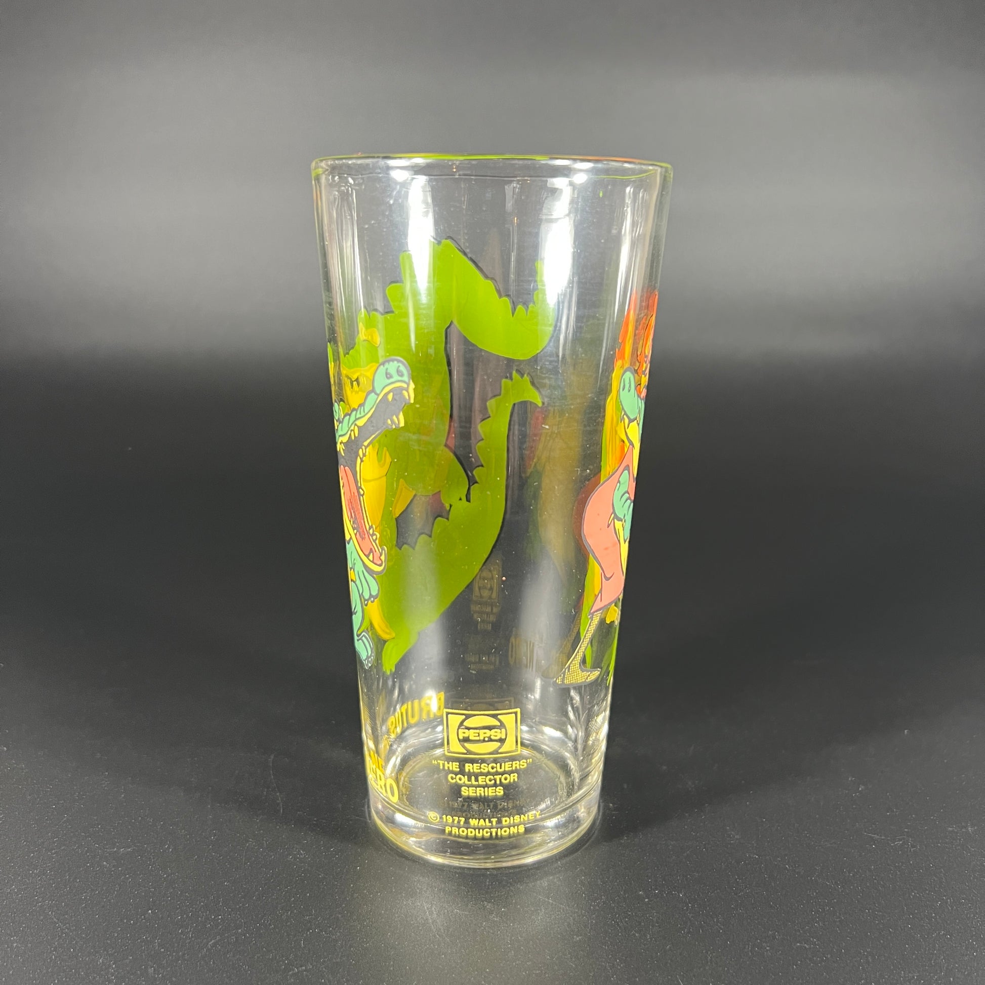 1977 Pepsi Walt Disney The Rescuers Brutus and Nero Tumbler Glass. This collectible glass features the mischievous Brutus and Nero from the beloved Disney film. In good vintage condition with minimal signs of wear. It stands approximately 7 inches in height and has a diameter of 3 inches, making it a great addition to any Disney or glassware collection.