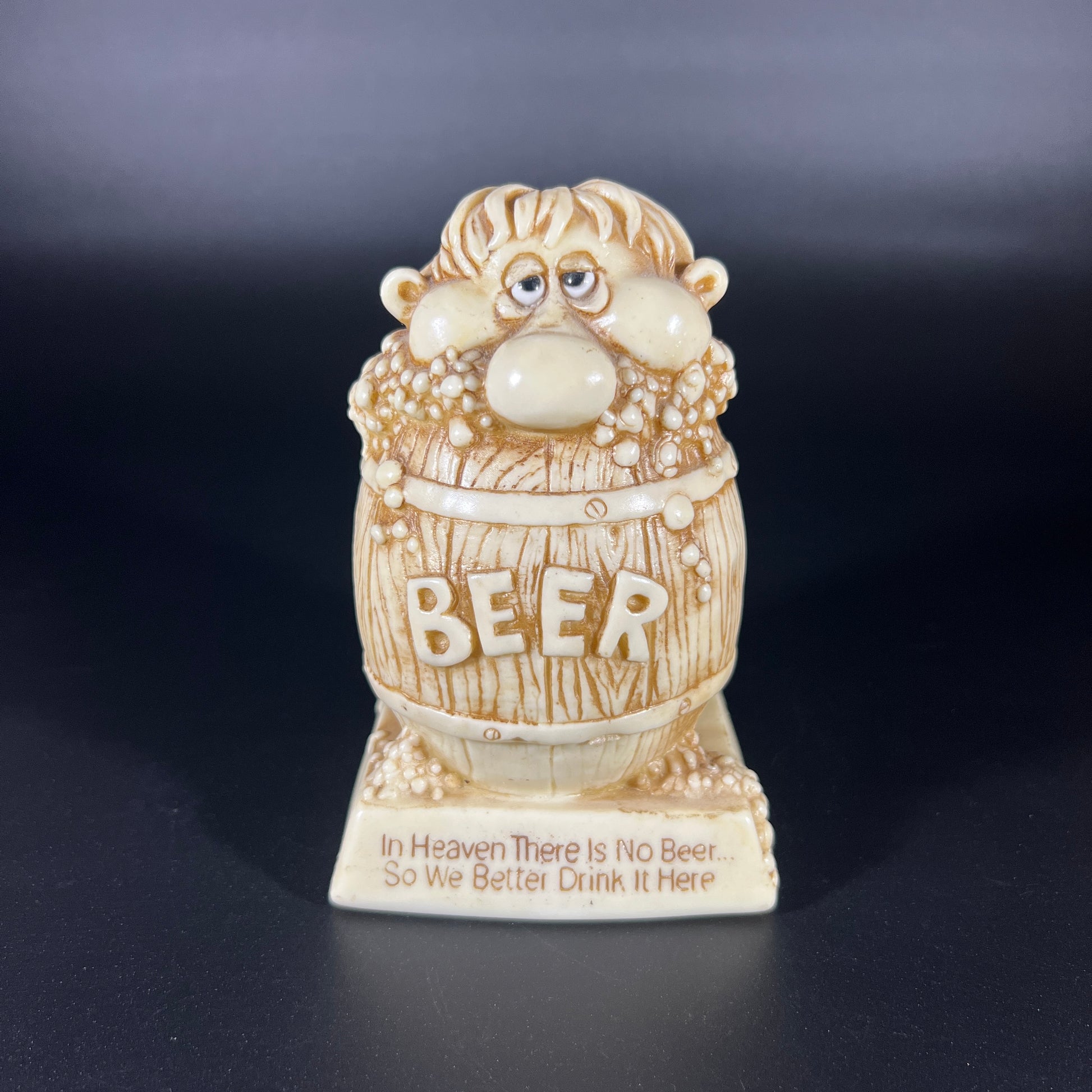 Vintage 1978 Russ Berrie & Co. "In Heaven There Is No Beer, So We Better Drink It Here" Statue. This humorous and charming piece is in good vintage condition. It measures 5" high, 3.5" wide, and 3.25" deep, making it a fun addition to any collection or bar decor.