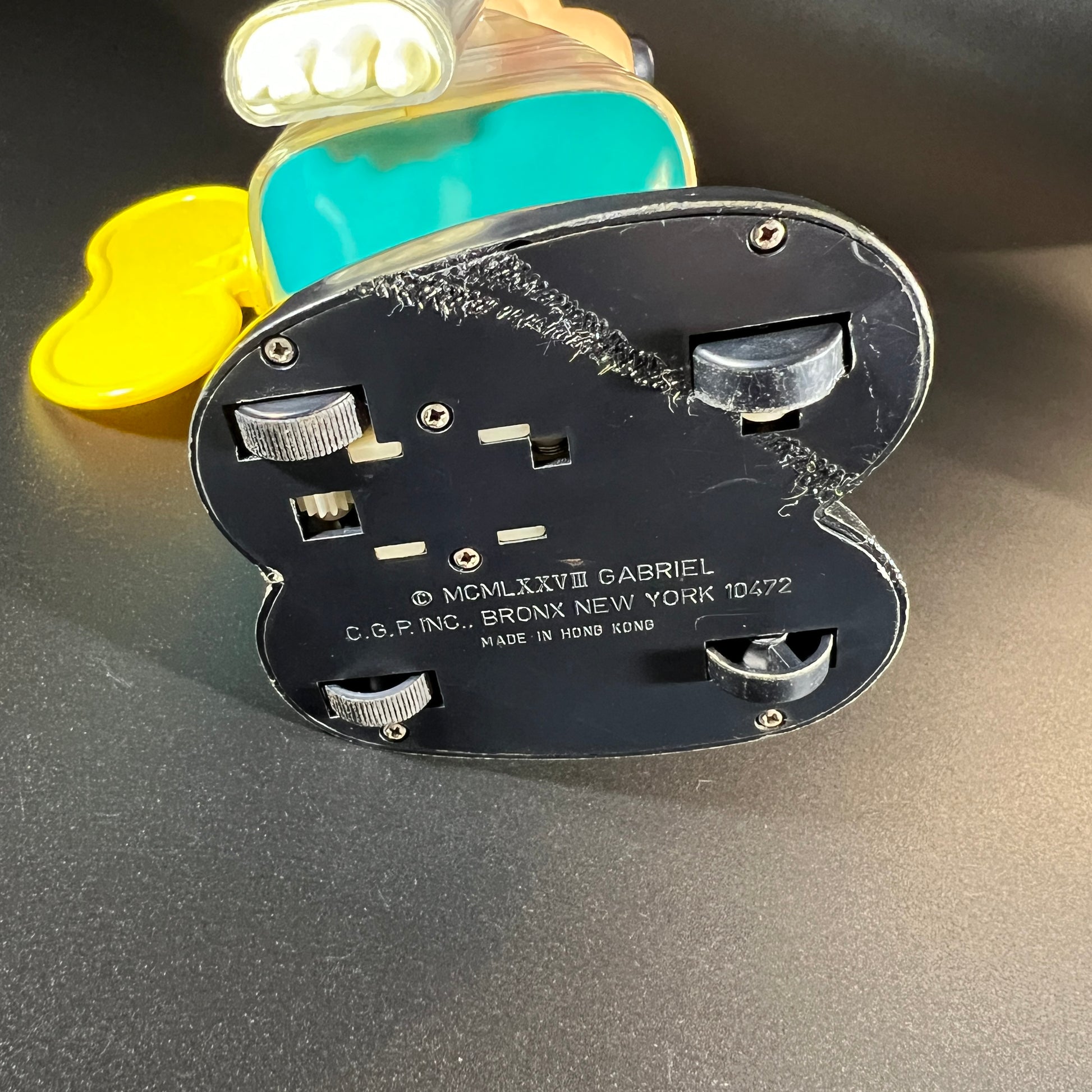 The bottom is marked with the copyright: ©MCMLXXVIII (1978) Gabriel C.G.P. Inc., Bronx, NY 10472. Dimensions: 9" H x 4.5" W x 5.5" D (with wind-up key).