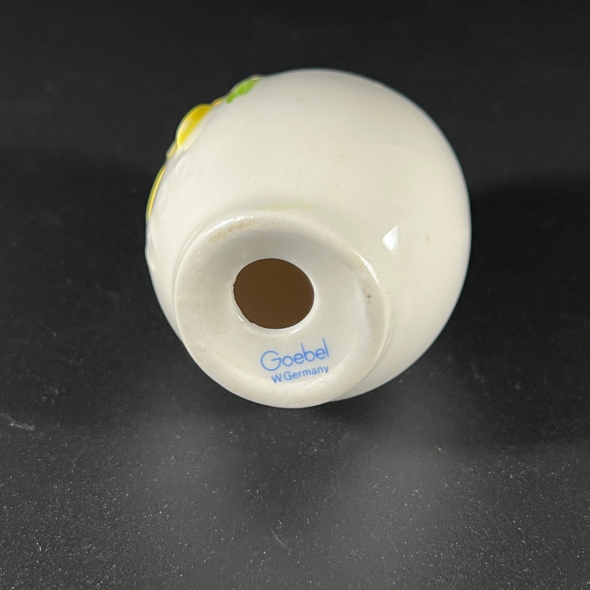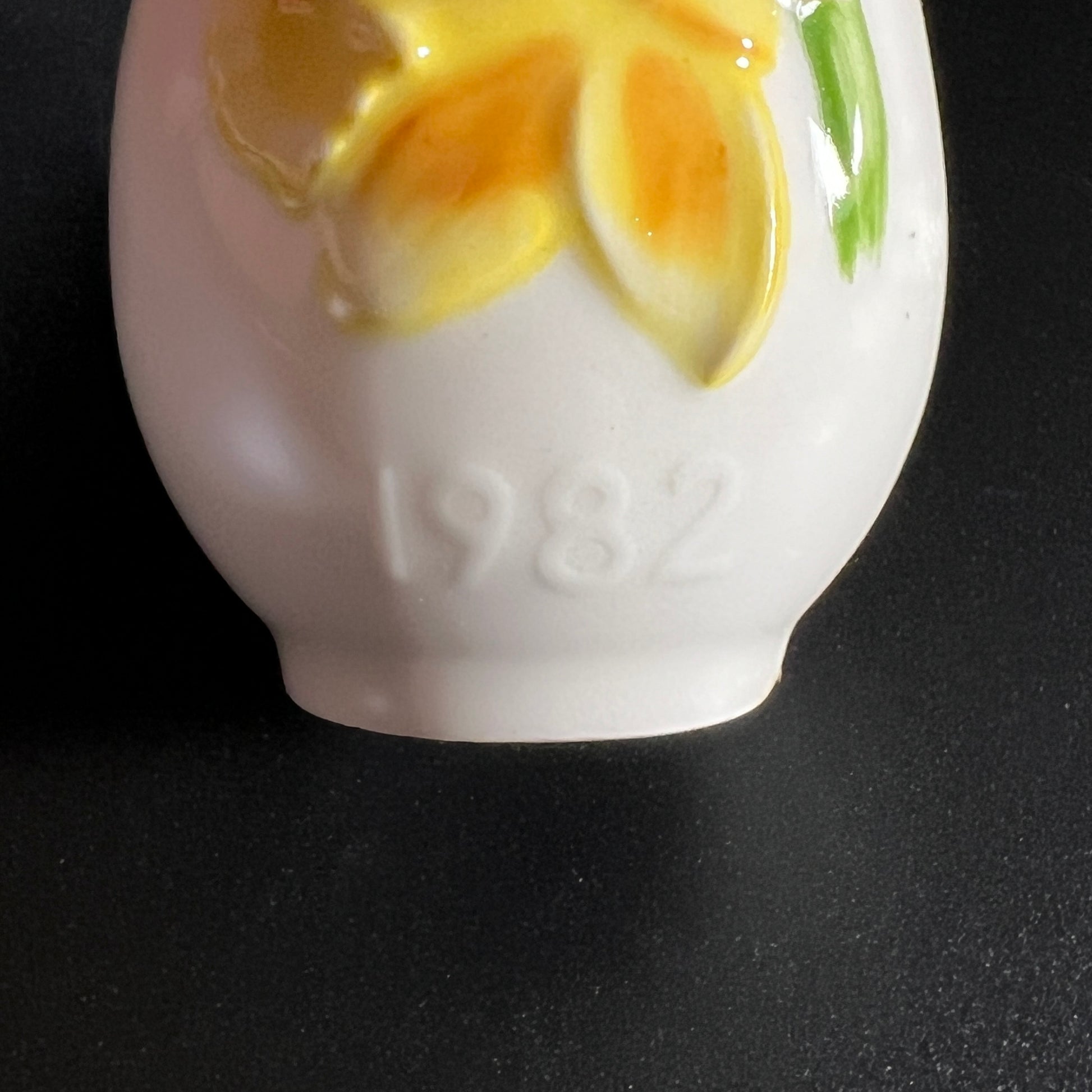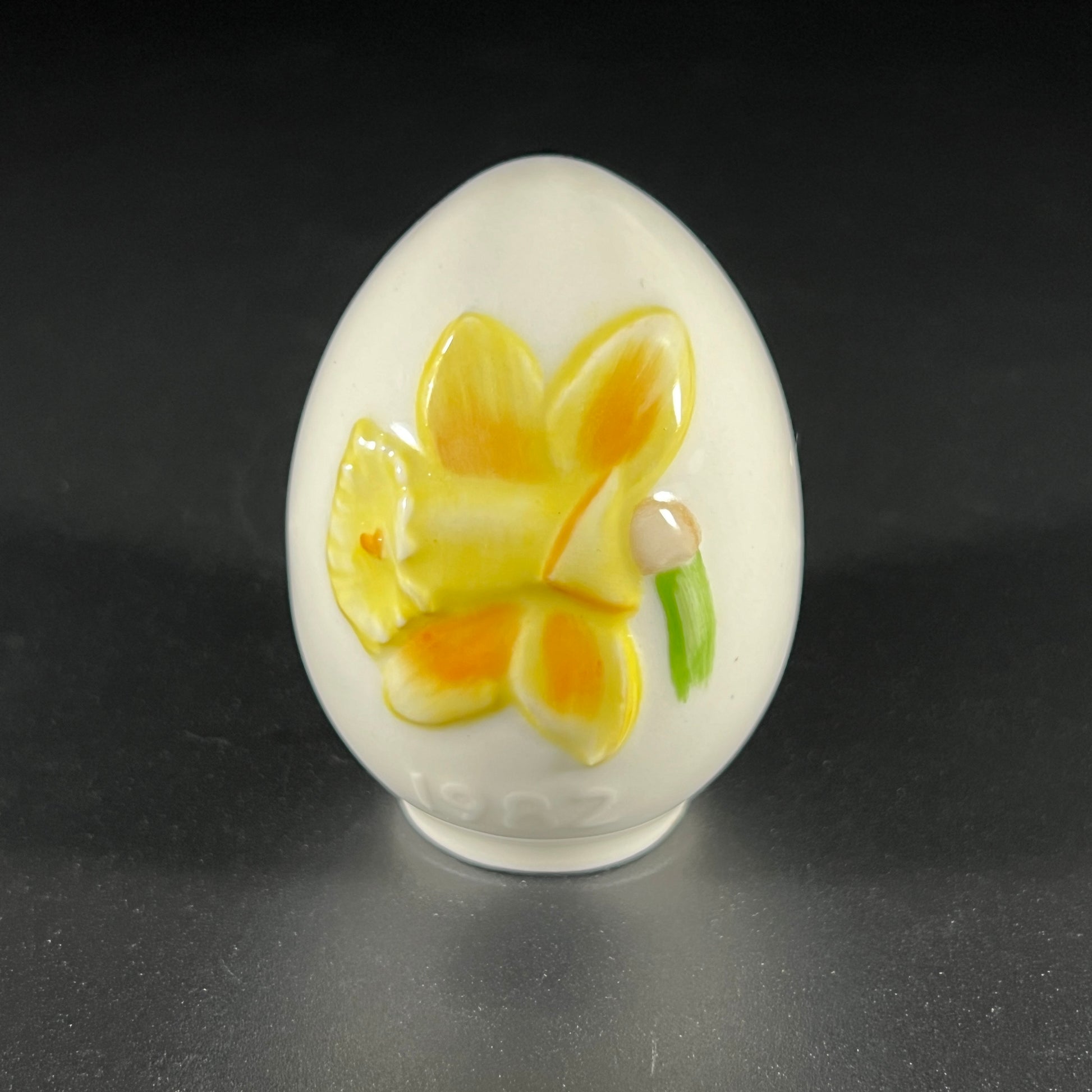 This vintage Goebel West Germany 1982 Fifth Annual porcelain Easter egg features a hand-painted bright yellow daffodil flower, symbolizing the spirit of Spring. The front of the egg is marked "1982" beneath the flower, and the bottom is stamped with "Goebel W. Germany."