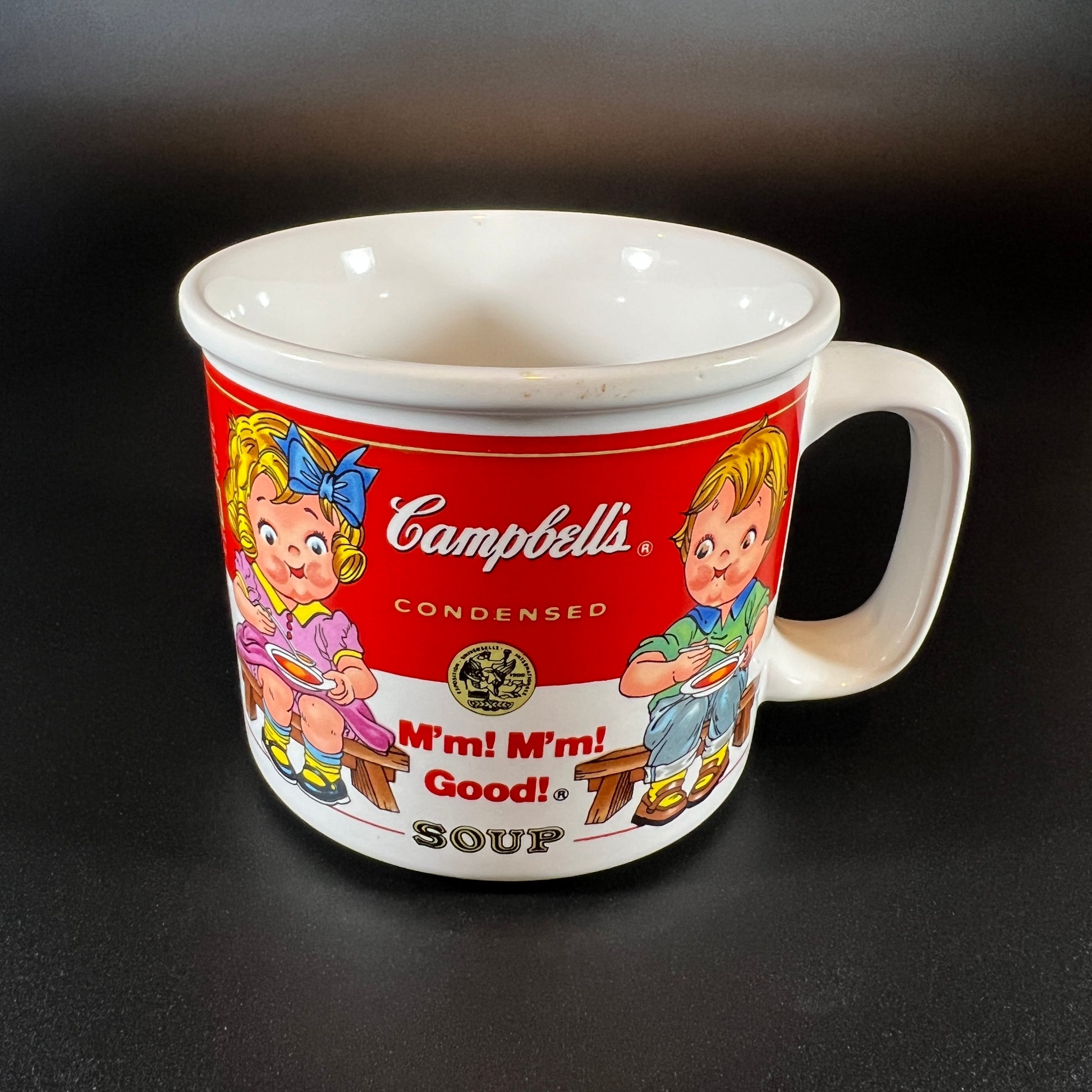 This charming Campbell's Soup Mug by West Wood, crafted in 1993, features a delightful illustration of kids on benches, evoking a nostalgic, playful scene. The mug measures 4 inches in diameter and stands 3.5 inches tall. Made with practicality in mind, this vintage mug is both microwave-safe and dishwasher-safe, making it easy to enjoy your meals without the hassle of handwashing. Plus, it’s designed to withstand detergent use, ensuring lasting durability and enjoyment for years to come. Whether you're a collector of Campbell's Soup memorabilia or simply appreciate a unique, fun mug, this piece is a wonderful blend of whimsy and functionality.