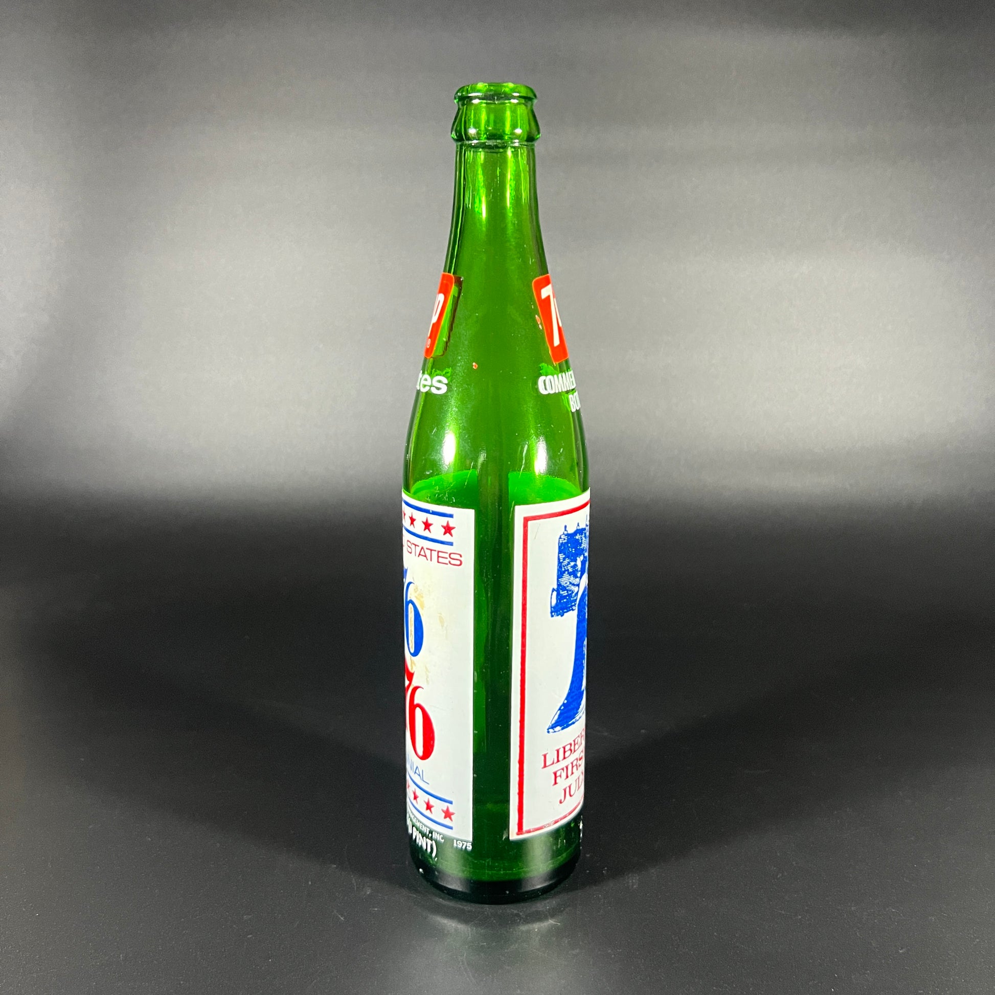 This vintage 1976 7UP Commemorative U.S. Bicentennial green glass 16 oz. bottle features bright, vibrant colors that have been well-preserved. It’s in good vintage condition, with wear consistent with age. Please refer to the photos for more details. The item measures approximately 10.75" H x 2.75" in diameter.