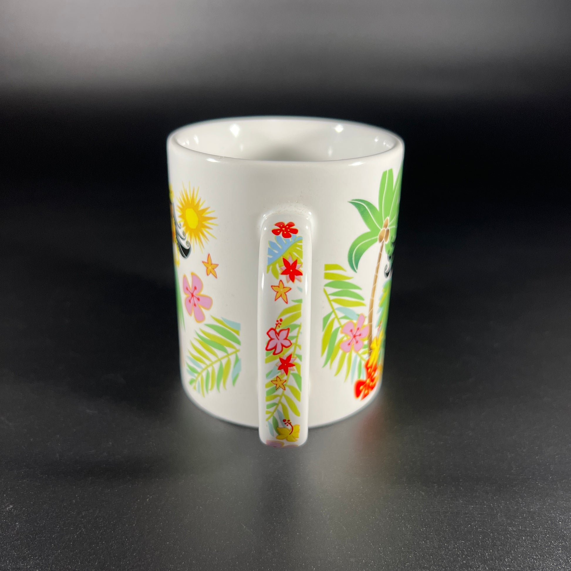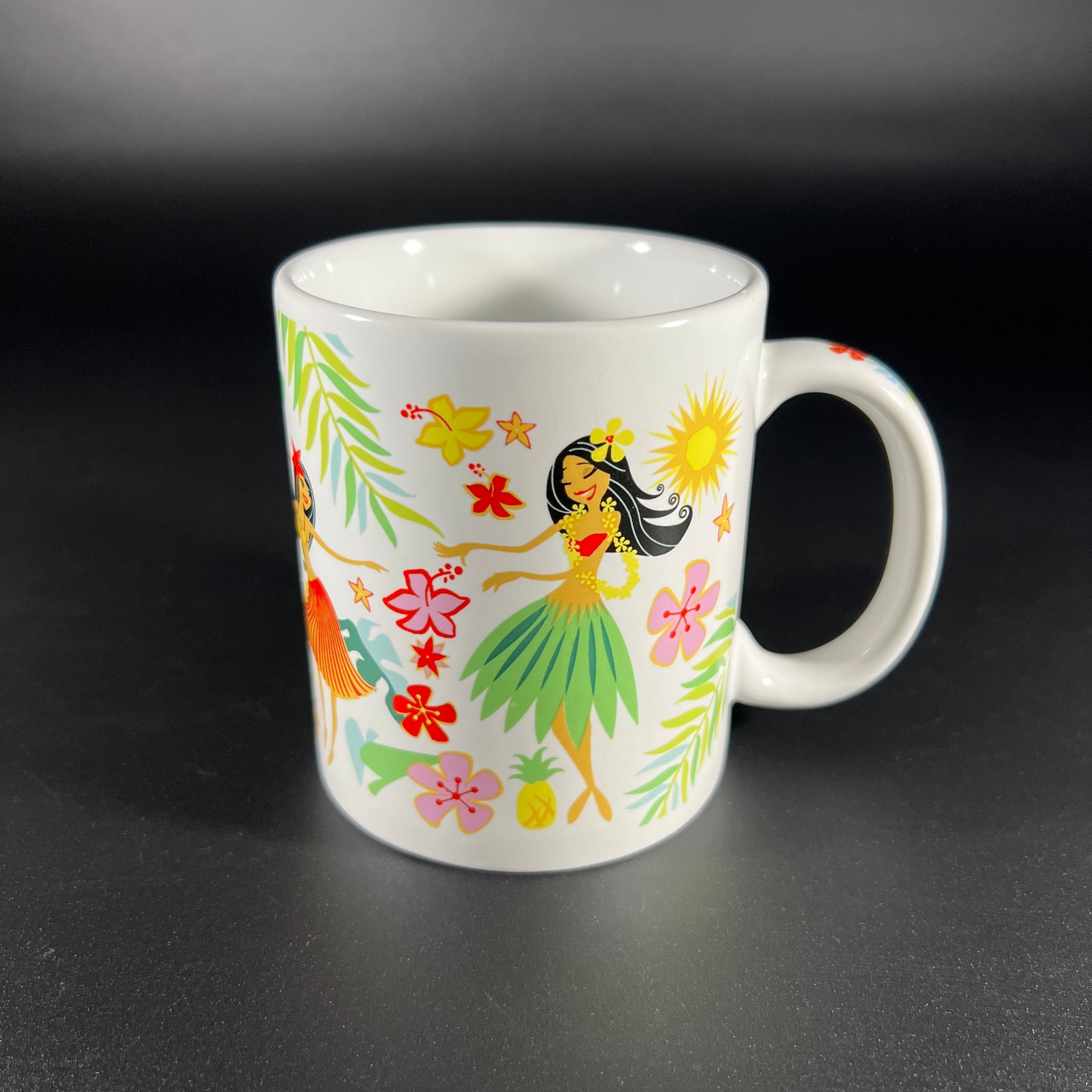This Island Hula Honeys Mug was designed for and sold exclusively at ABC Stores in Hawaii. In good pre-owned condition, it boasts vibrant colors that capture the spirit of the islands. The mug measures approximately 3.75" in height, 4.75" wide (with handle), and has a 3.25" opening. A charming souvenir or addition to any collection!