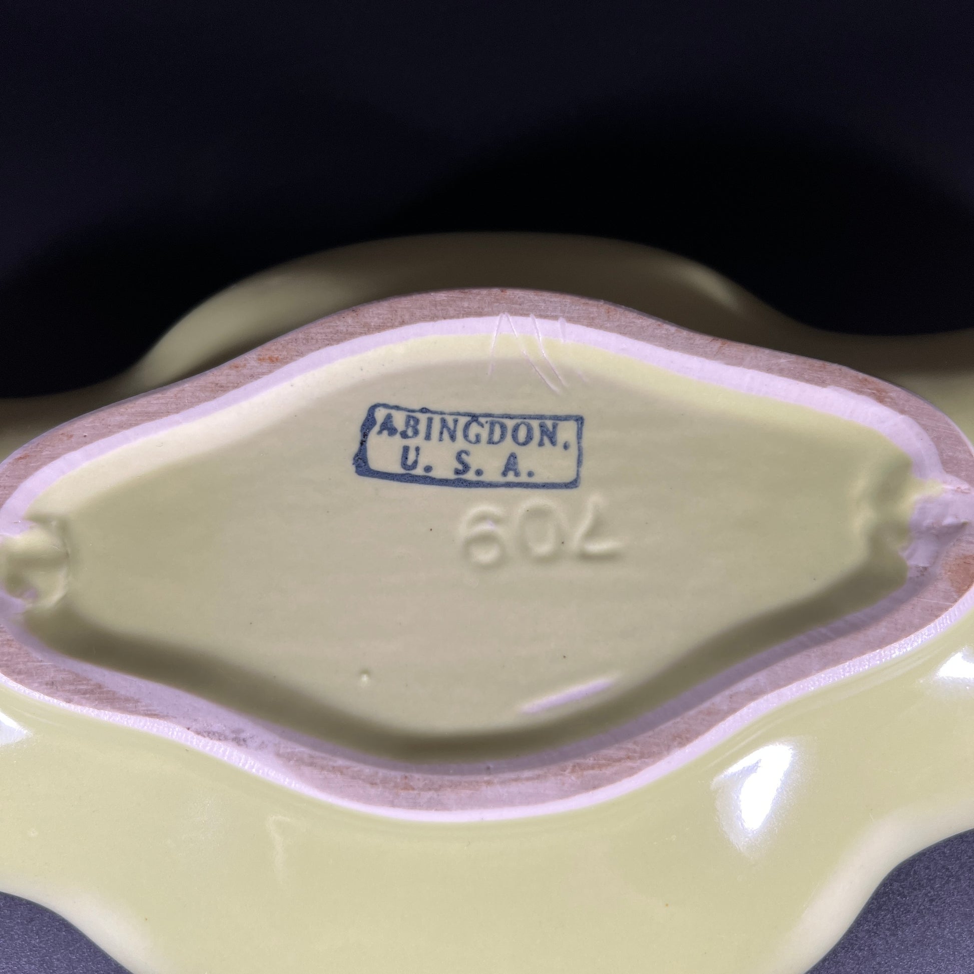 This vintage 1940s pale green Abingdon USA Pottery #709 centerpiece bowl is in excellent condition, with no chips or cracks. A beautiful piece that adds a soft touch of color and elegance, it measures 6.75" W x 13.5" L x 3" H. Perfect for displaying fruit, flowers, or simply as a decorative accent.