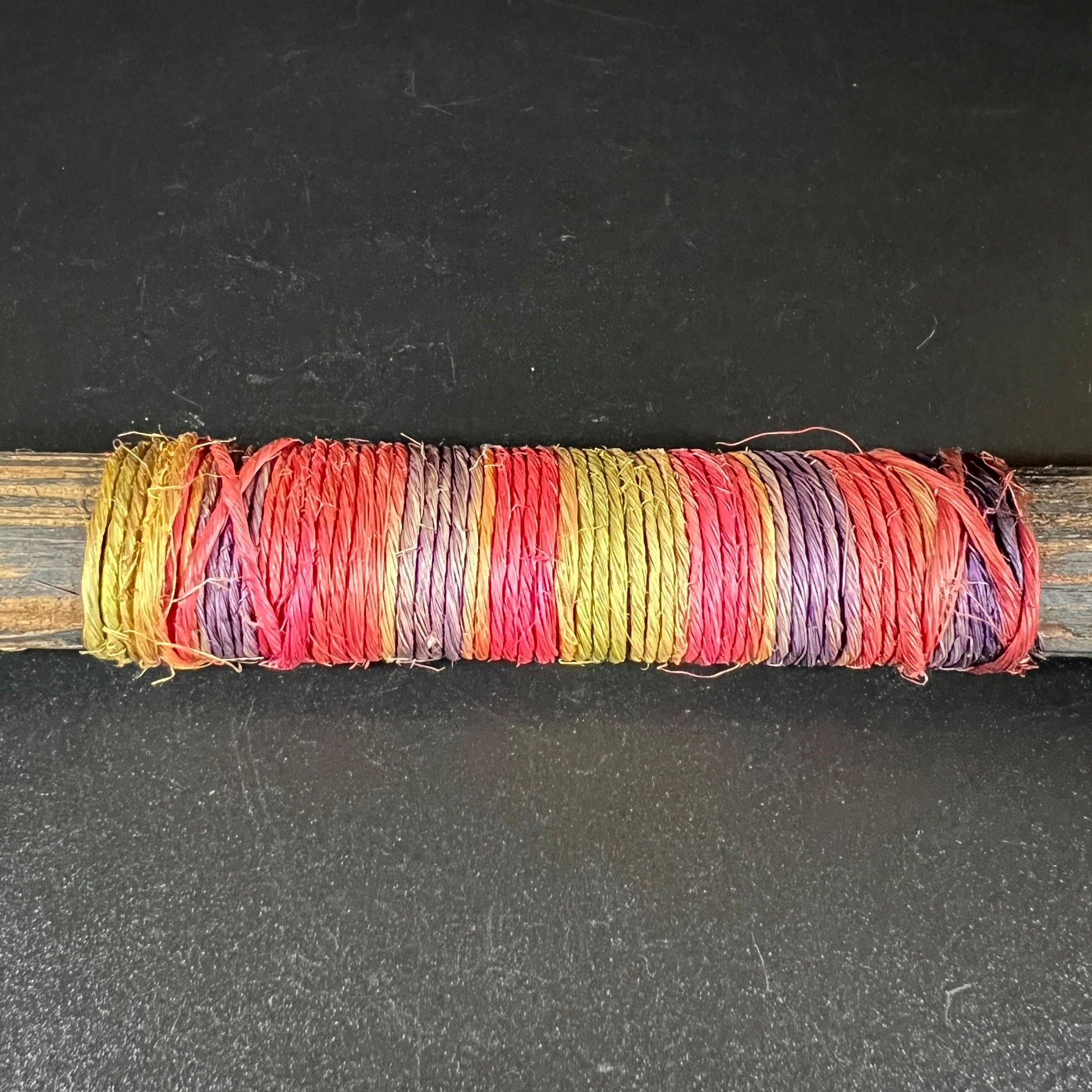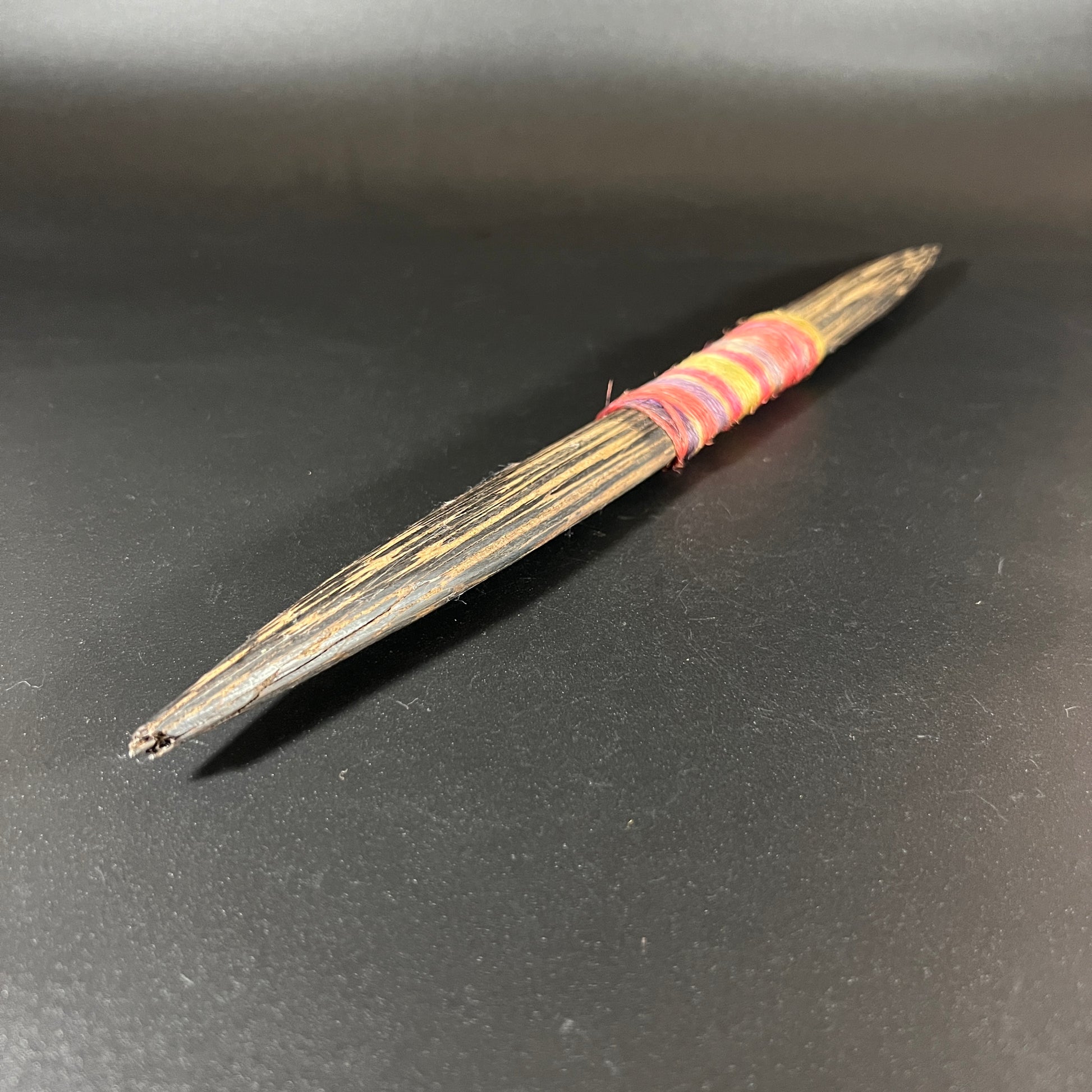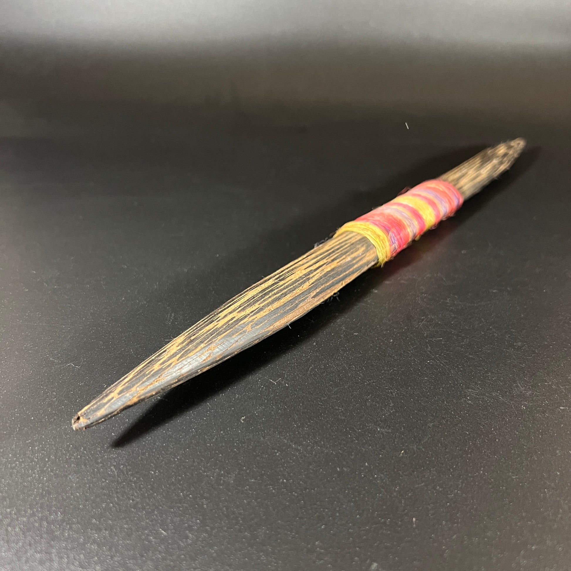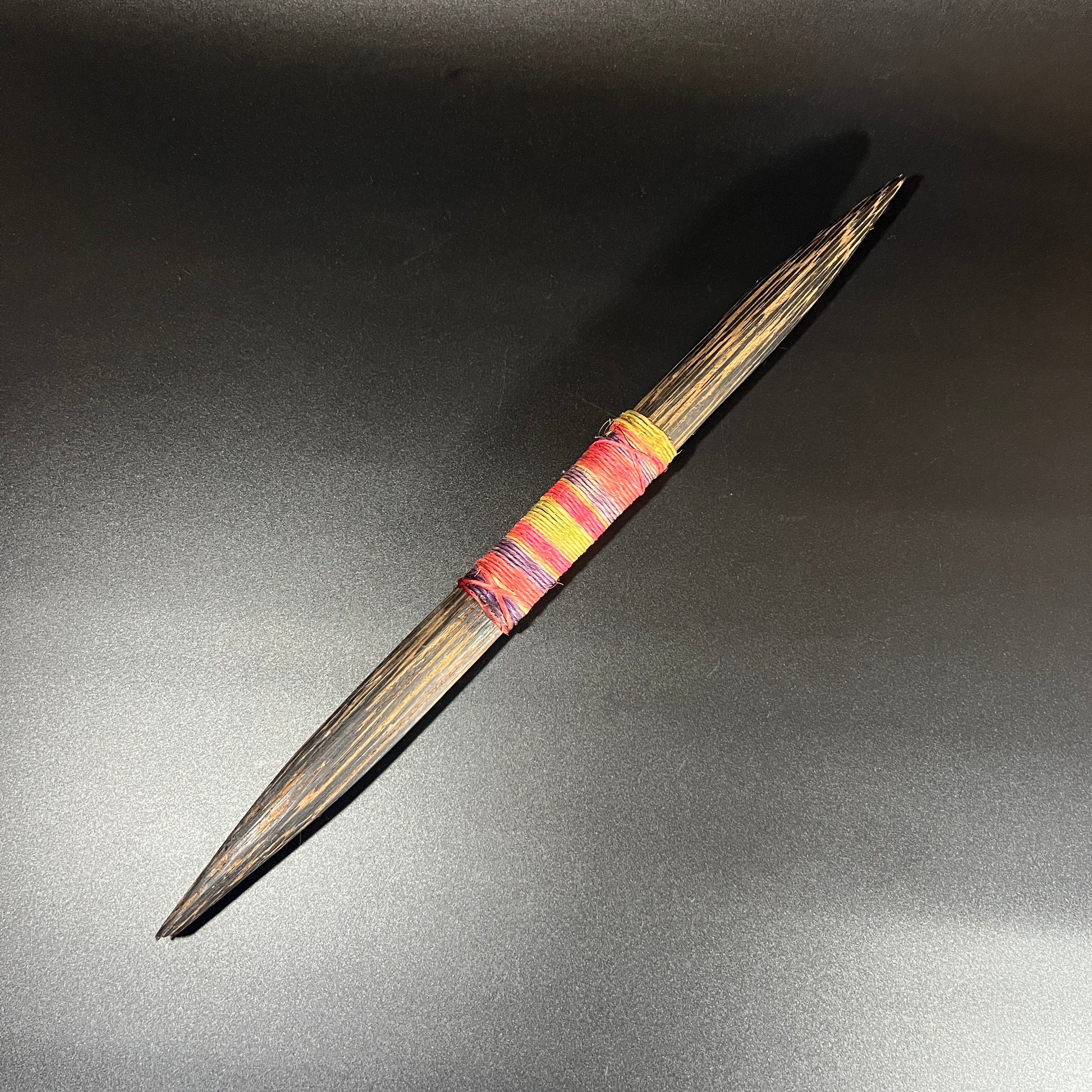 This is a replica headhunter's knife from the Jivaro Tribe of Ecuador. Crafted from wood, the double-sided blade is complemented by a colorful string textile wrap on the grip. In good vintage condition, it shows wear consistent with age, adding to its unique character. Please refer to the photos for more details. The knife measures approximately 16.5" L x 1" W x .75" D.