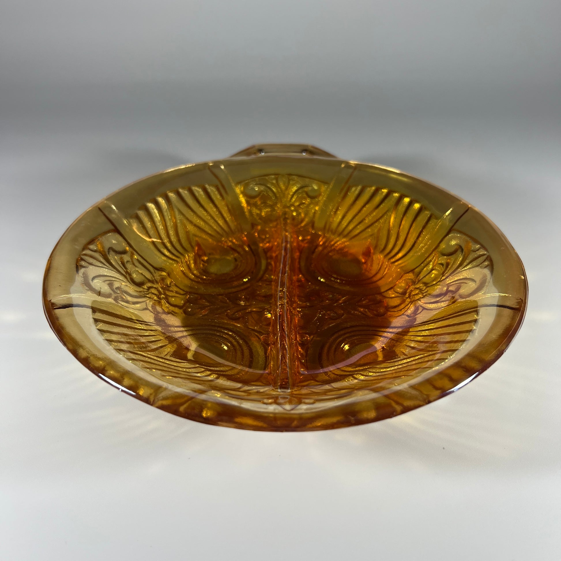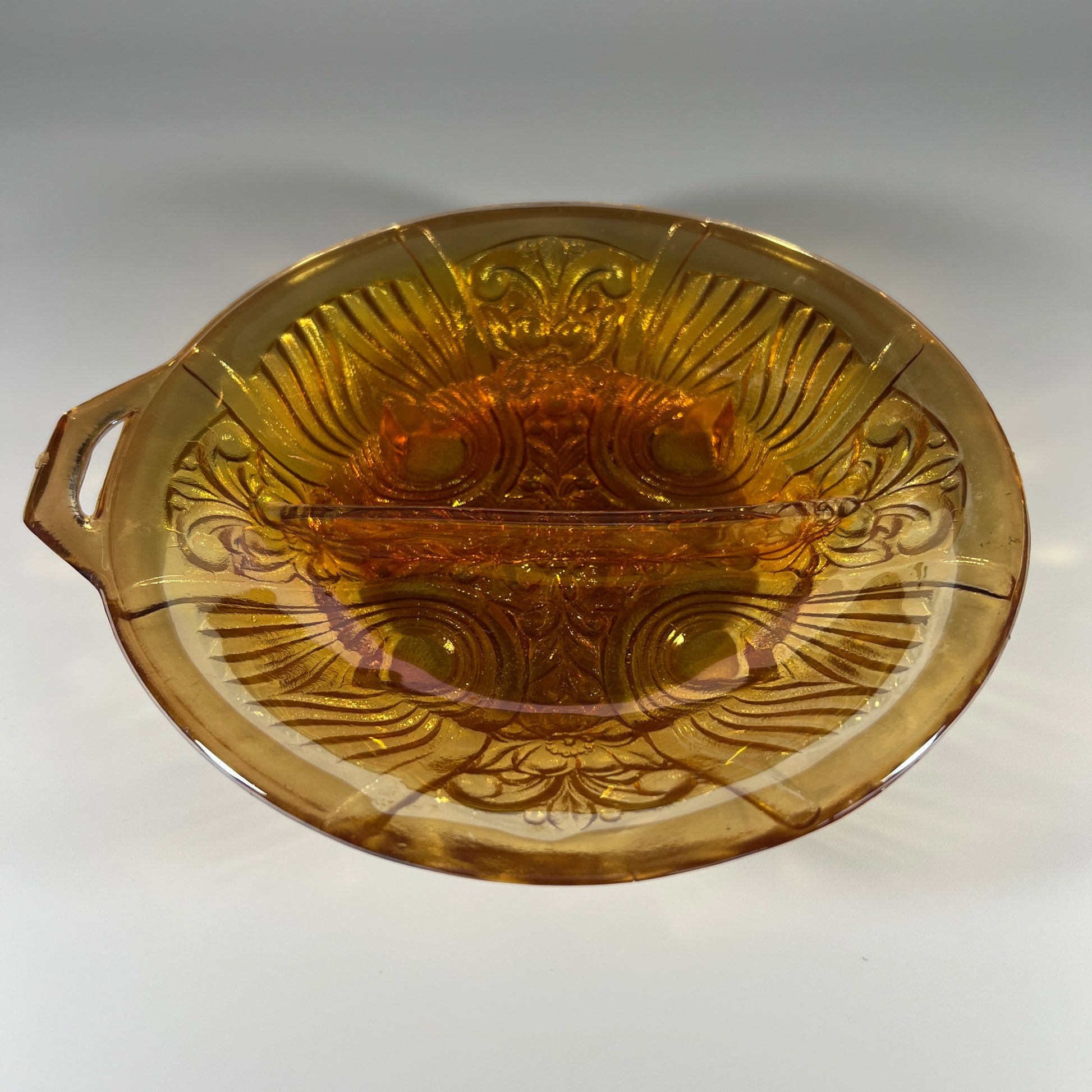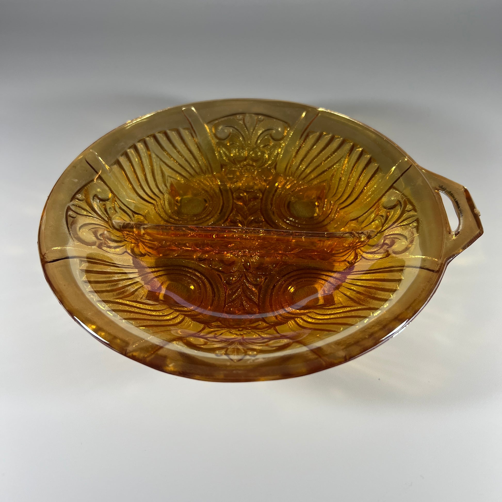 This vintage Amber Carnival Glass divided dish is a versatile piece, perfect for use as a jewelry tray, trinket holder, or relish dish. In good vintage condition, it displays the vibrant, iridescent glow characteristic of carnival glass. Please review the photos for further details. The dish measures approximately 5" H x 7.75" W x 8.5" D. A lovely addition to any glassware collection!