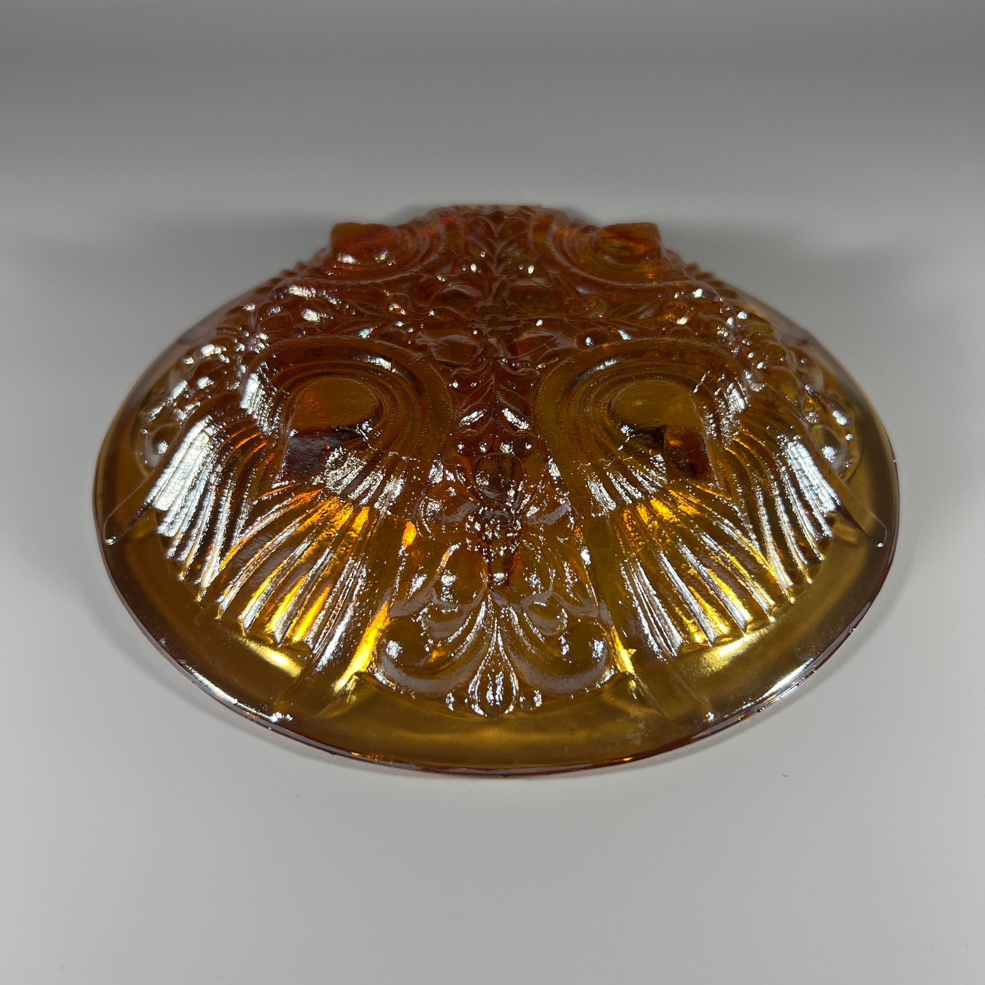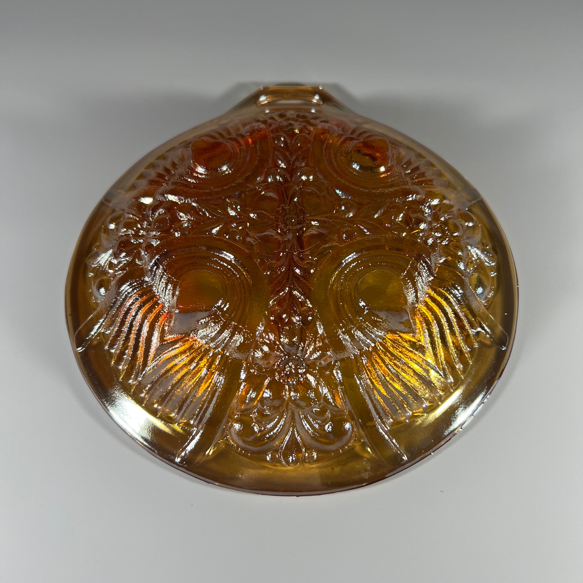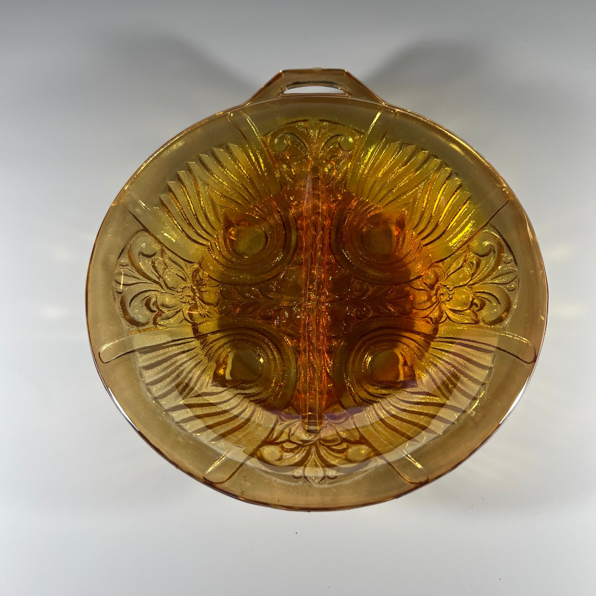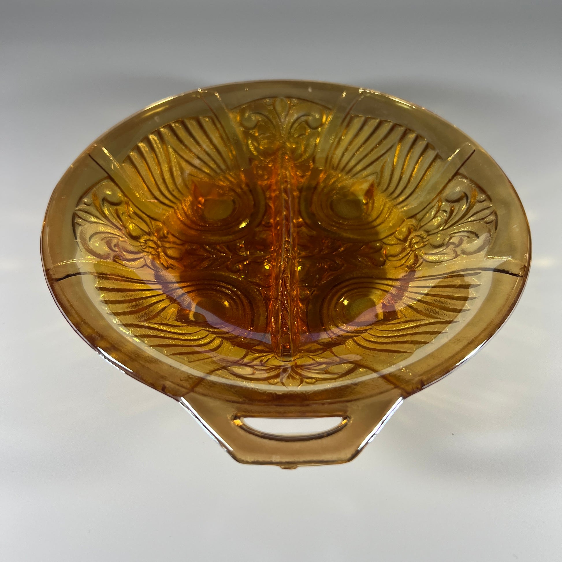 This vintage Amber Carnival Glass divided dish is a versatile piece, perfect for use as a jewelry tray, trinket holder, or relish dish. In good vintage condition, it displays the vibrant, iridescent glow characteristic of carnival glass. Please review the photos for further details. The dish measures approximately 5" H x 7.75" W x 8.5" D. A lovely addition to any glassware collection!