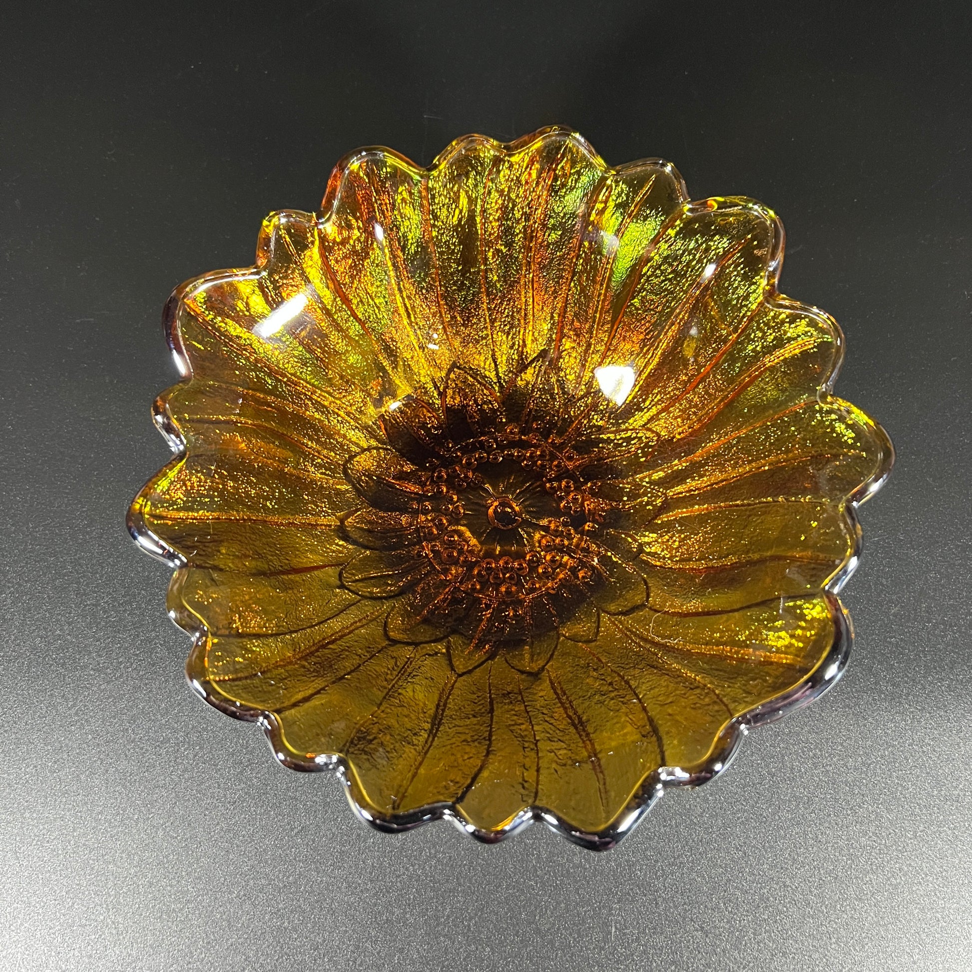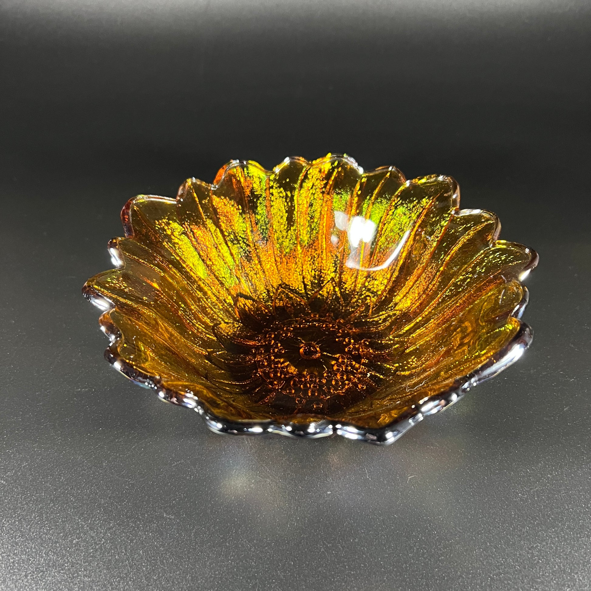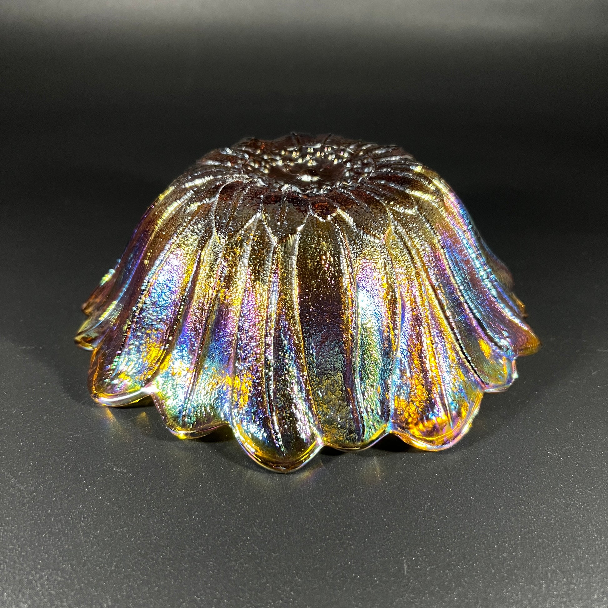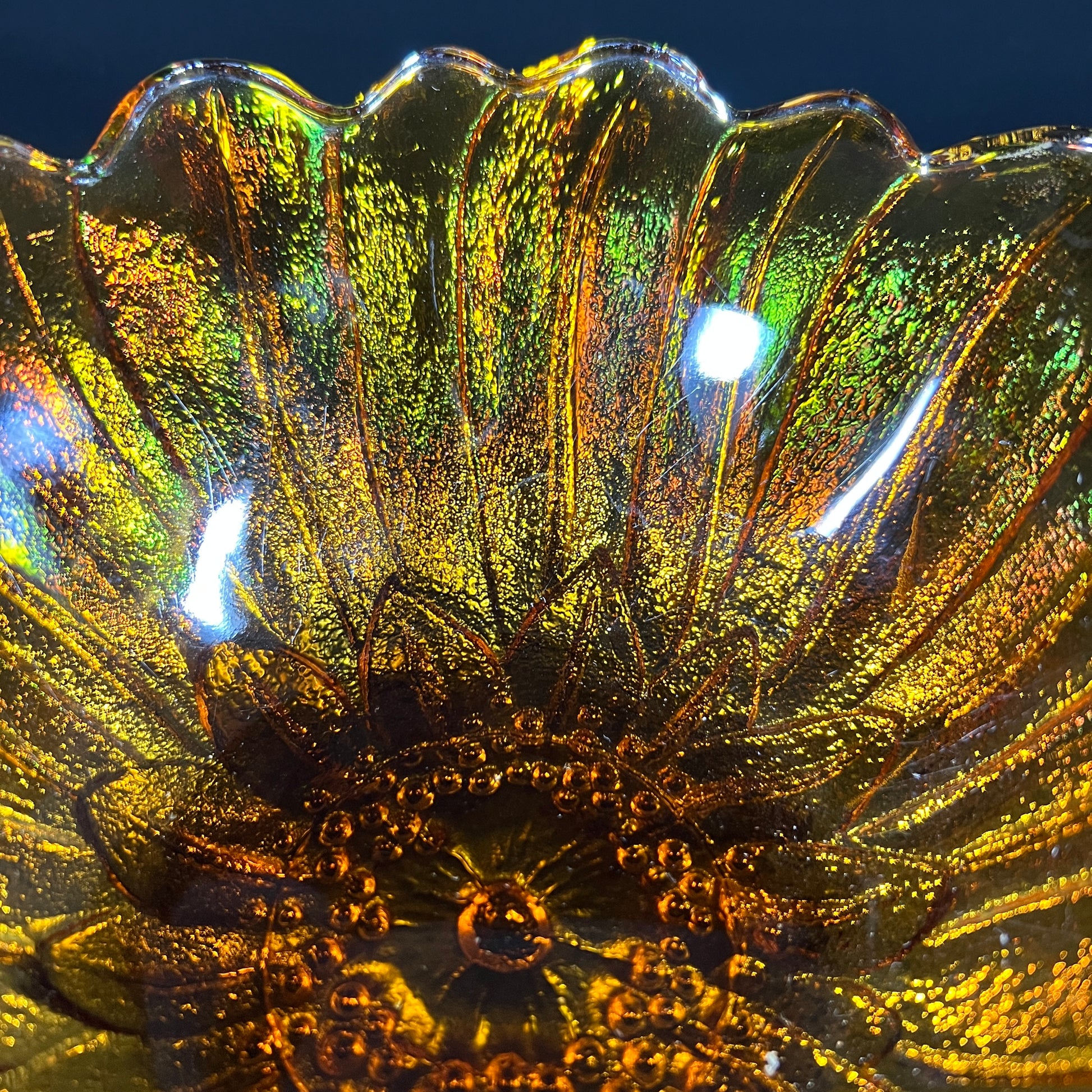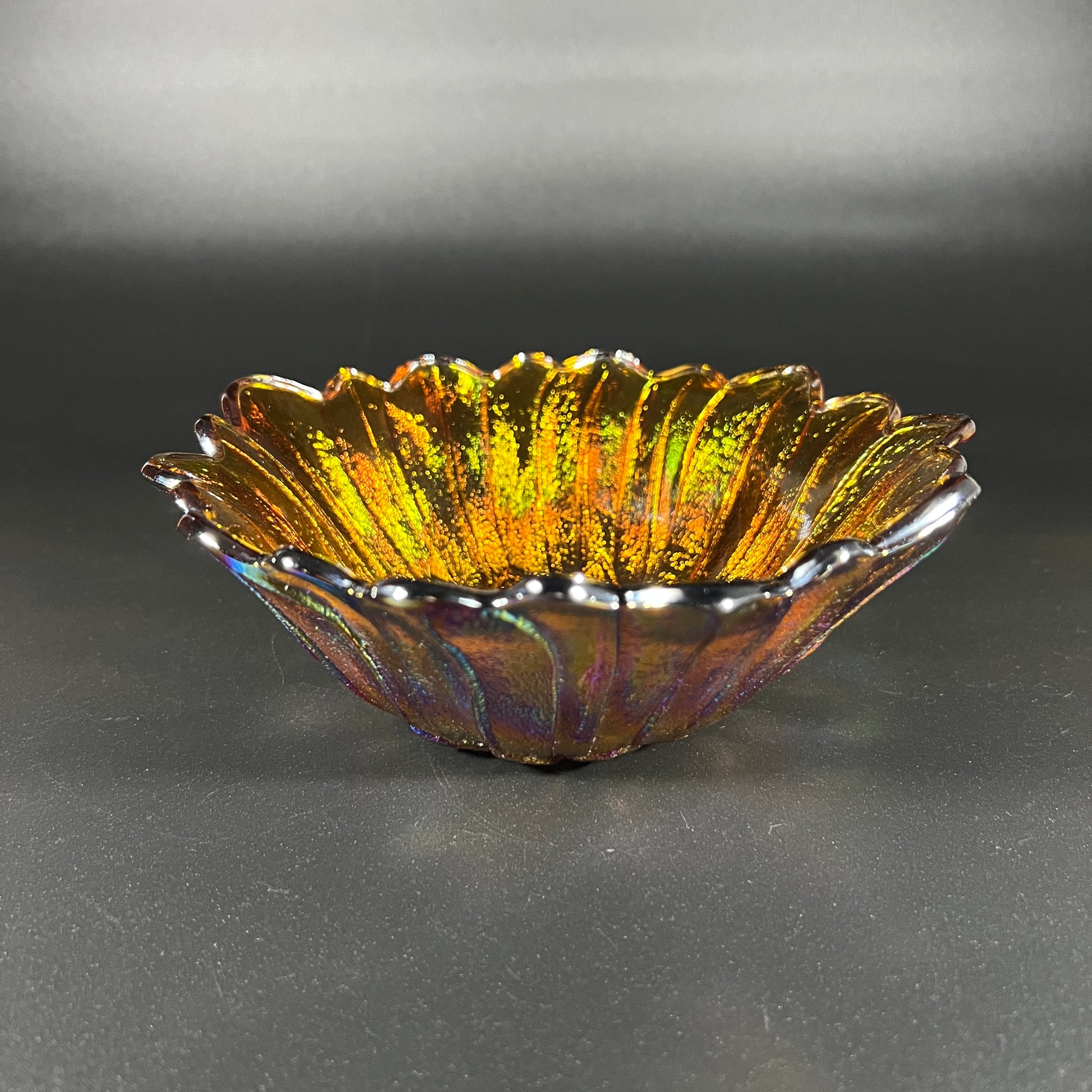 Stunning amber iridescent carnival glass candy dish or nut bowl, designed in the shape of a sunflower or marigold. This vintage piece is in good condition and measures approximately 2.75" H x 7.5" in diameter.