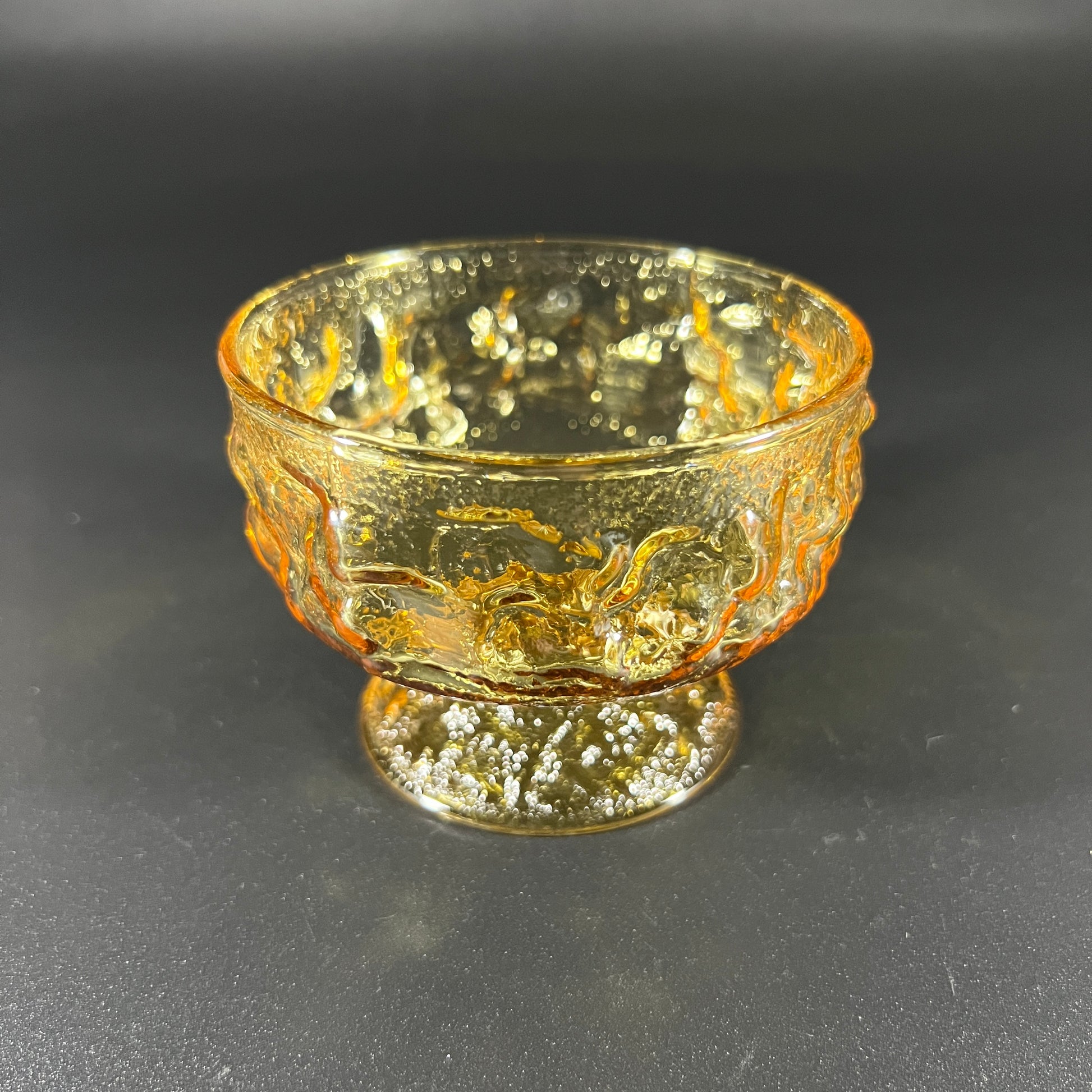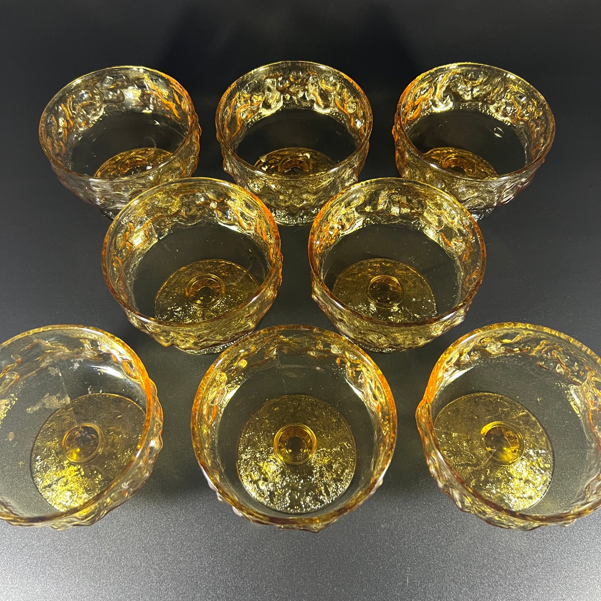 This sleek ten-piece set of Mid-Century Modern Anchor Hocking Milano Honey Gold dessert dishes, produced in the 1960s, exudes timeless style and sophistication. The warm honey gold hue adds a touch of vintage charm, making them a perfect complement to any dining table or collection. These dishes are in excellent vintage condition, showing only minimal wear consistent with their age. Please refer to the photos for further details. Each dish measures approximately 3" H x 3.75" in diameter. Whether for everyday use or as a stylish display piece, this set is sure to elevate any occasion with its mid-century allure.