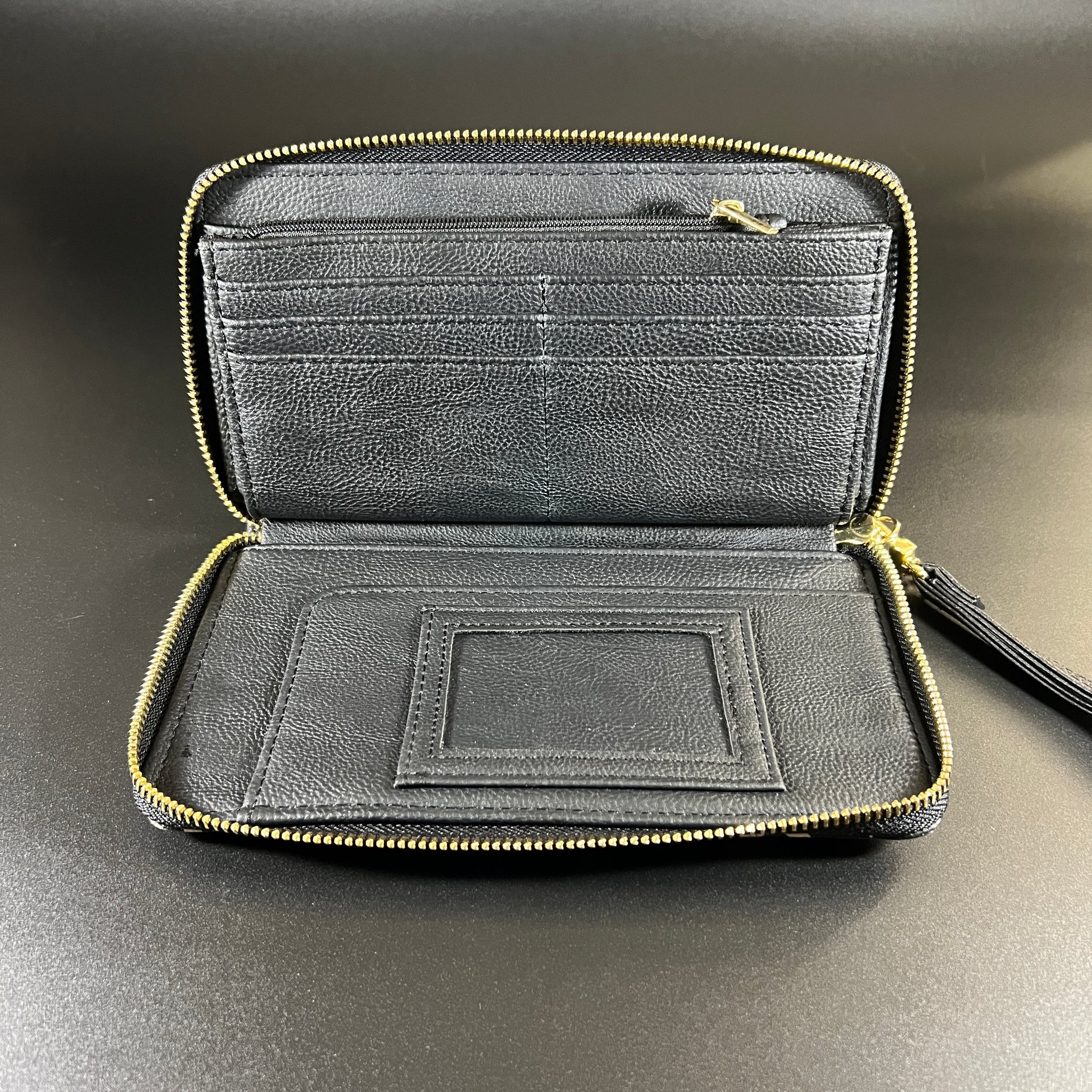 Betsey Johnson Skull & Crossbones Print Zip-Around Wallet with a detachable wristlet strap. Crafted from stunning black faux leather, the wallet features a bold white Skull & Crossbones print on both the front and back, with skulls designed with heart-shaped cutouts for the eyes. The gold-tone logo and hardware add a touch of glamour. Inside, the wallet has a sleek black faux leather interior with black lining. The wallet measures approximately 8.5" long and 4.5" high, with a wrist strap drop of about 7". A stylish and functional accessory that’s perfect for any edgy fashionista.