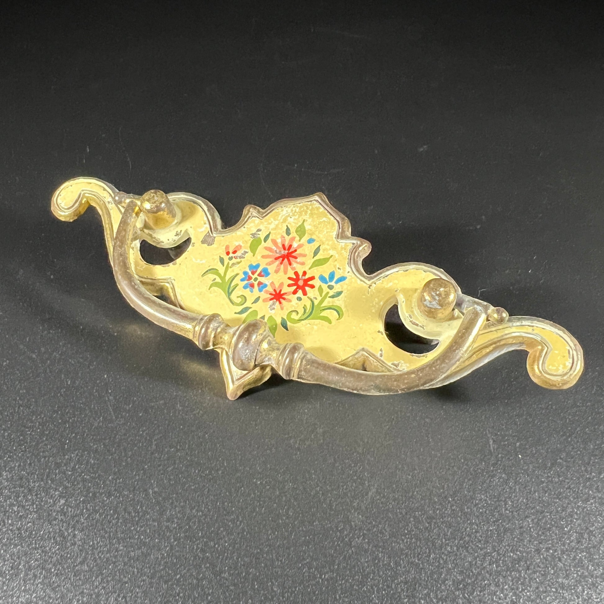 A set of five antique brass drop bail drawer pulls, featuring brass with white enamel and delicate flower details. These salvaged pulls include moveable handles, adding both functionality and vintage charm. Each pull measures approximately 2.5 inches in height and 5.75 inches in width, with a hole spacing of 3 inches. A beautiful set for restoring or updating furniture with a touch of antique elegance.
