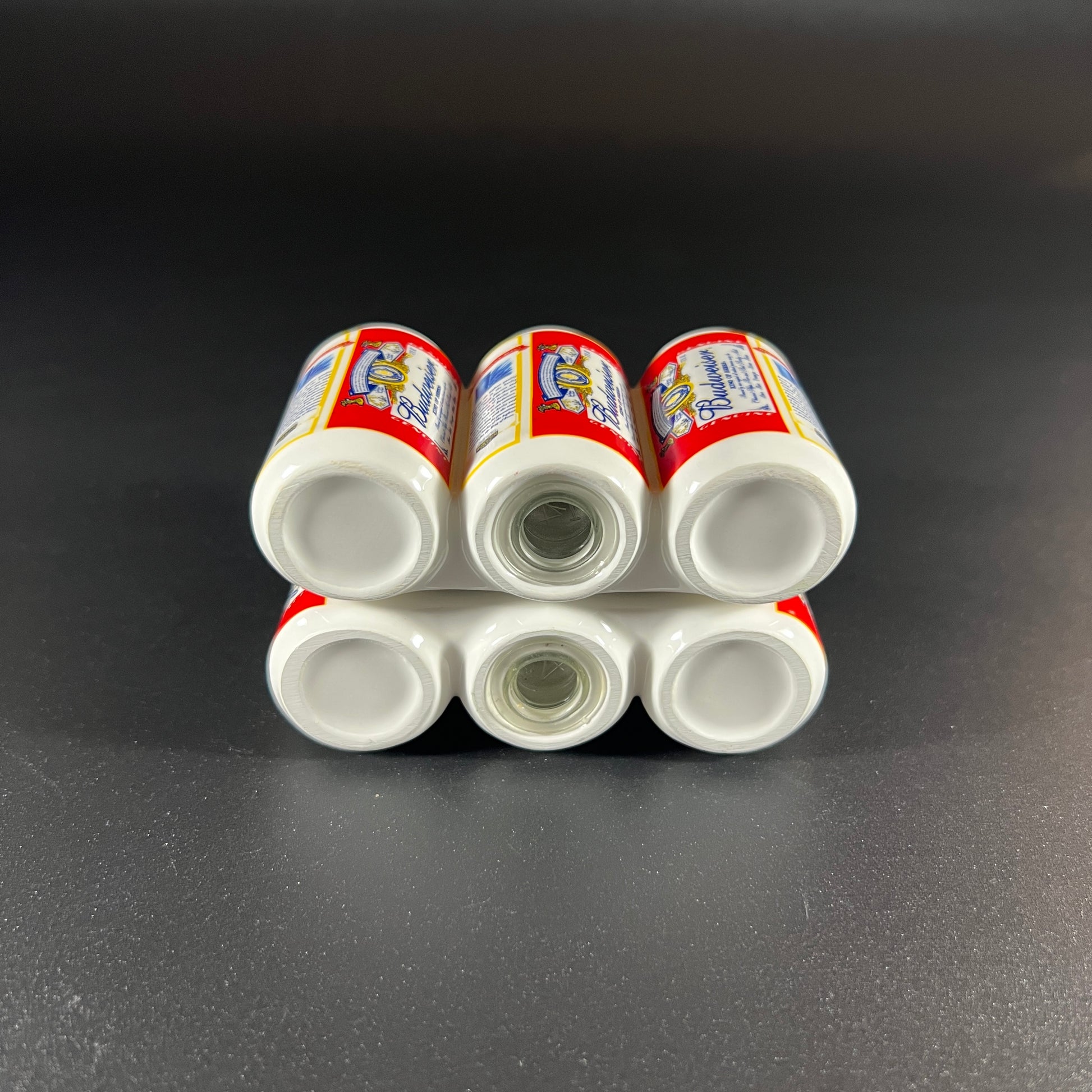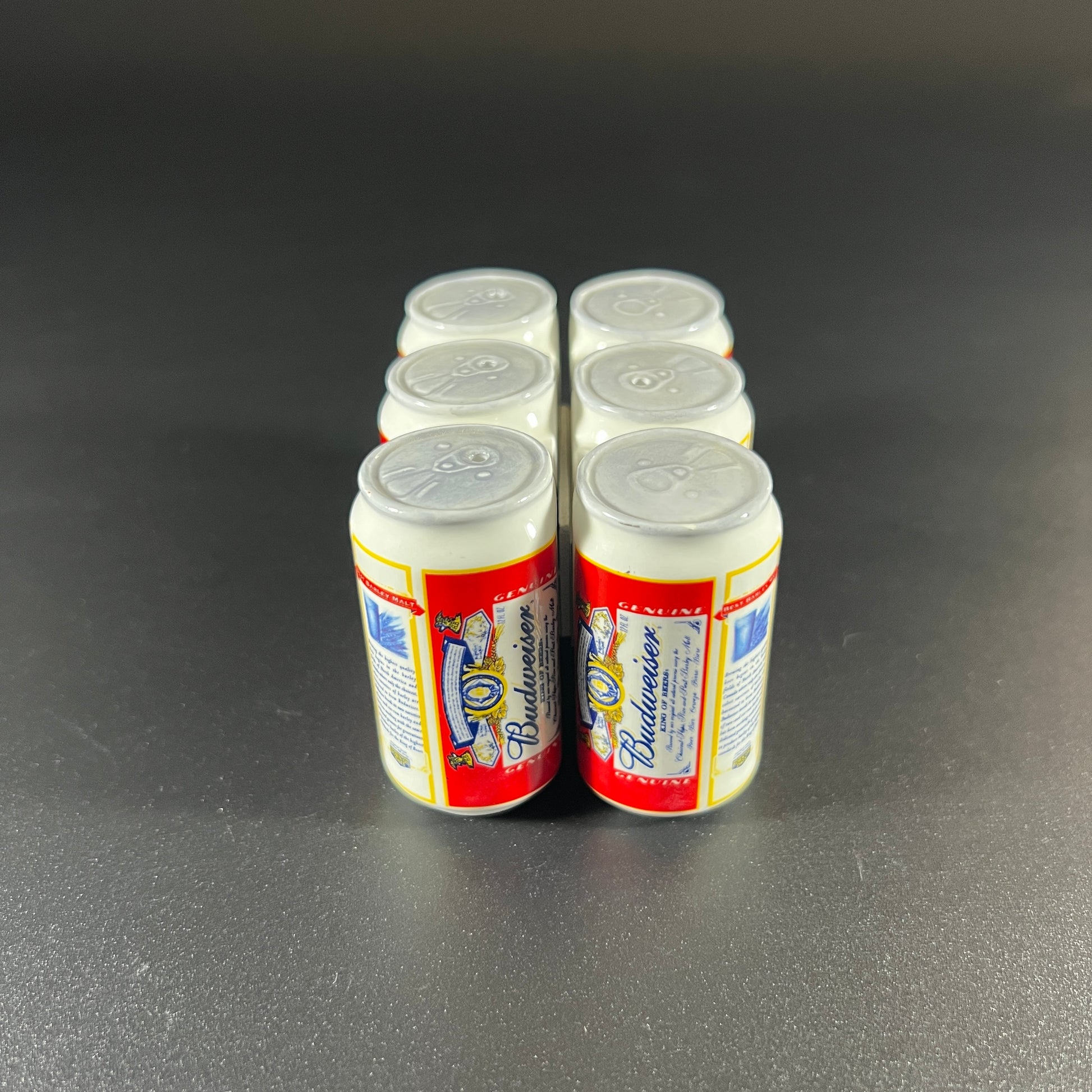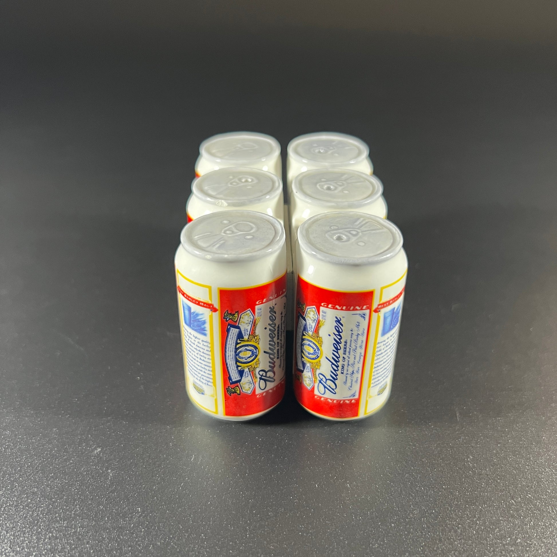 Set of Budweiser 6-Pack Salt and Pepper Shakers. These shakers magnetically connect back-to-back for easy storage. In excellent, like-new condition with original stoppers intact. See photos for details. Each shaker measures approximately 2.25" W x 3.25" L x 2" H.