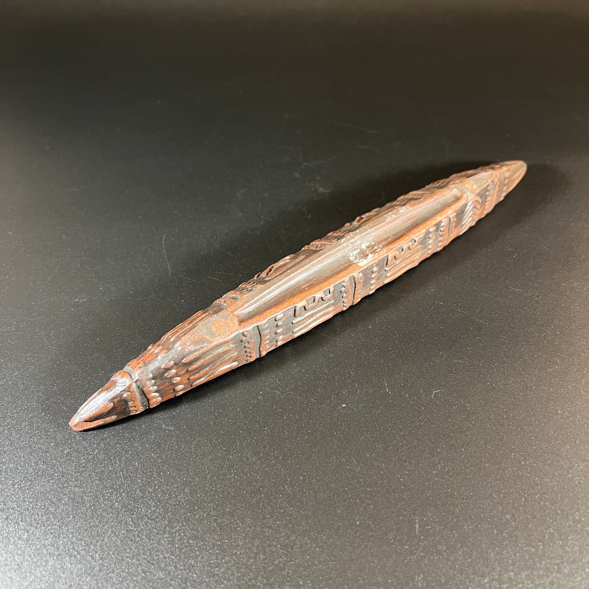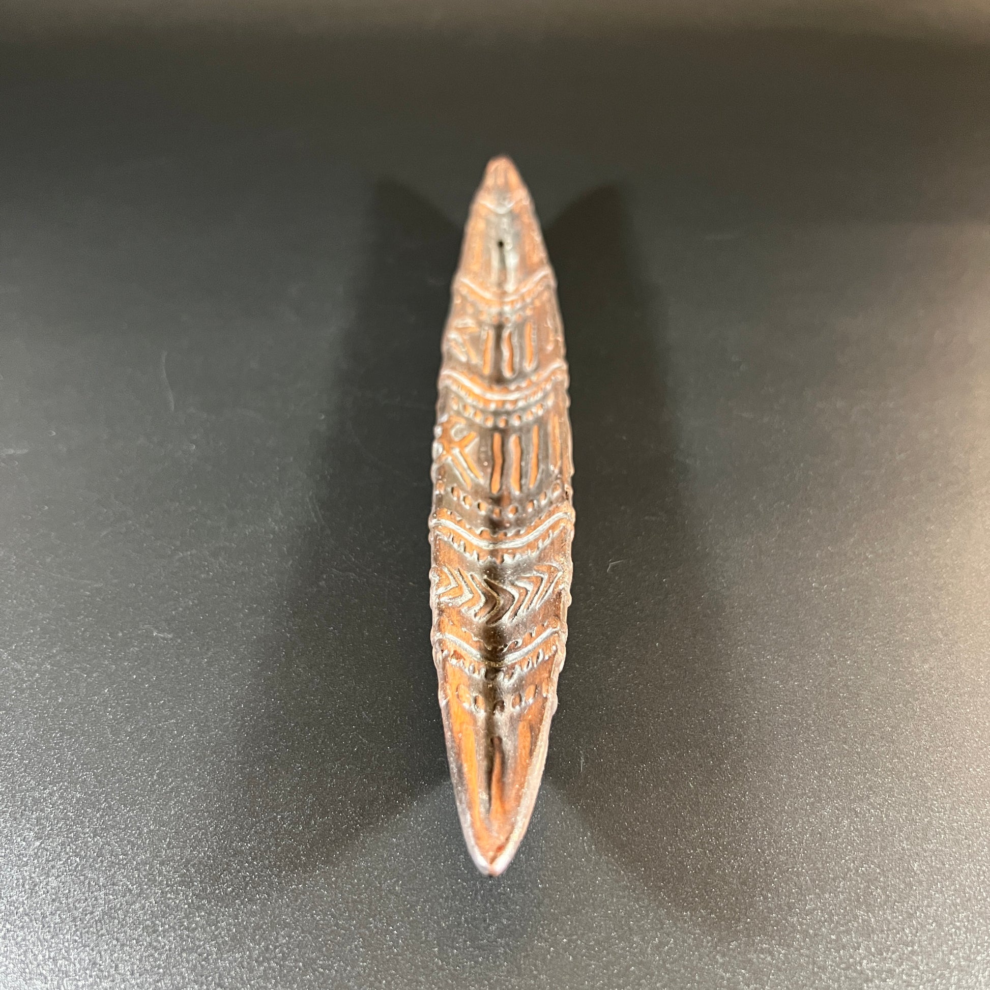 This clay or terracotta canoe-shaped incense burner is a charming and functional piece. In good vintage condition, it measures approximately 10" L x 1.25" W x 1" D, making it a unique addition to any home or collection.