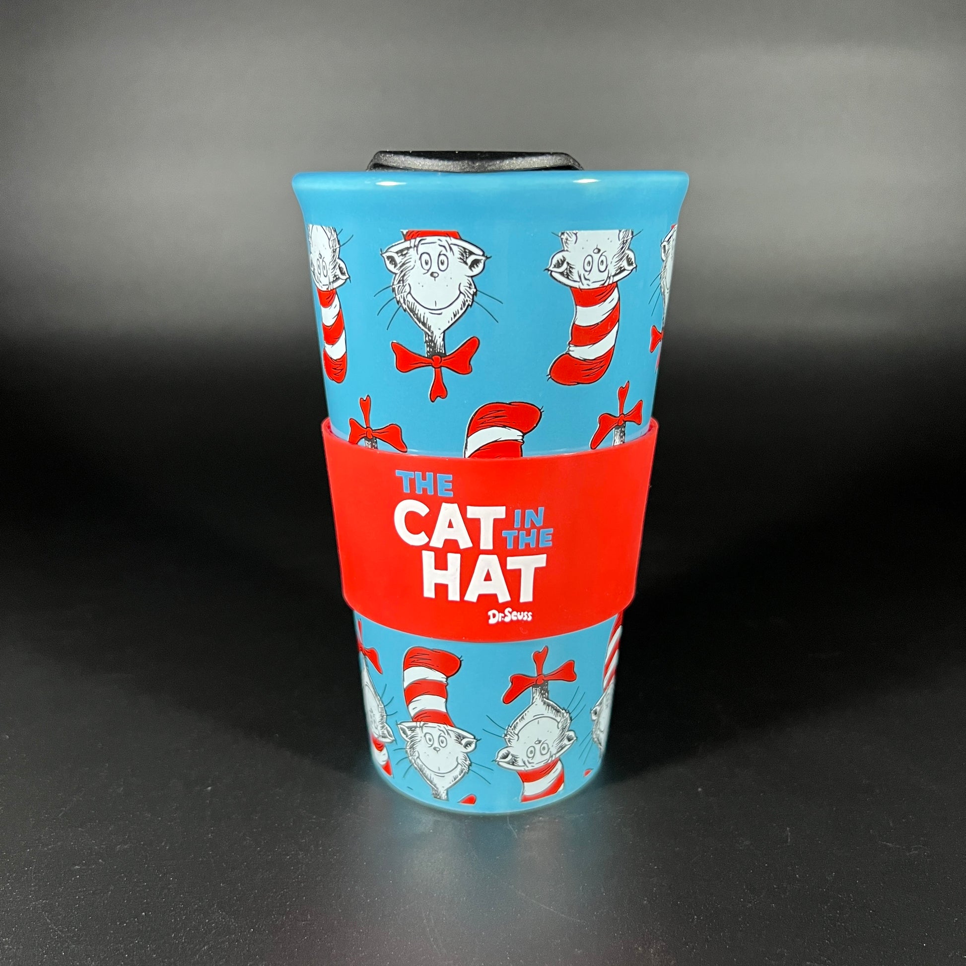Cat in the Hat Ceramic Tumbler Mug with Lid and Removable Heat Guard. This charming mug appears to be unused despite being preowned, and is in excellent preowned condition. It measures 6" high with a 3" diameter, making it a fun and functional addition for fans of Dr. Seuss and whimsical kitchenware.