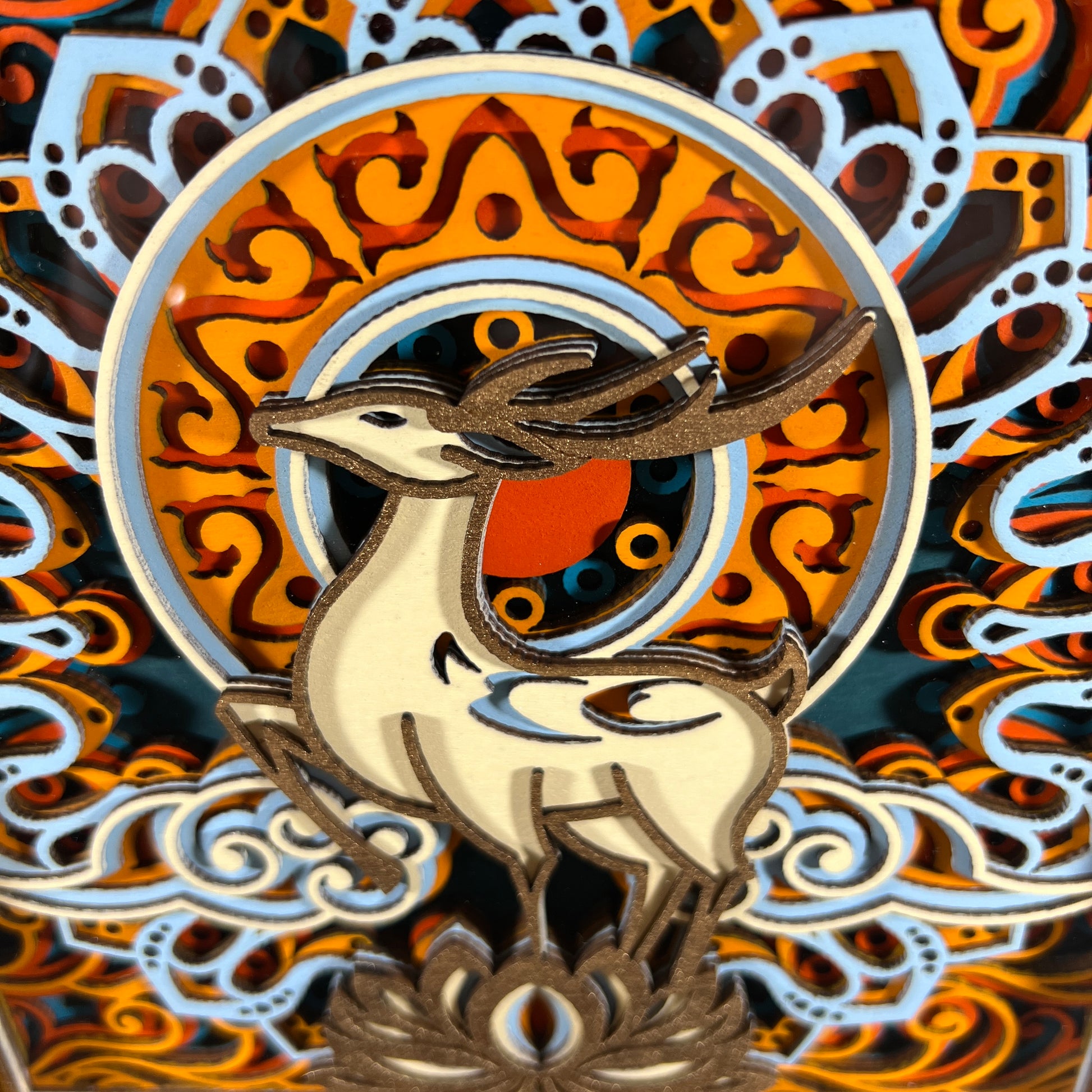 Introducing the Celestial Deer, a beautifully crafted 3D wood art piece that adds a touch of mystique and elegance to your home. Inspired by symbols of prosperity and longevity, it features a graceful deer, representing good fortune and long life, surrounded by lotus flowers and vibrant flame patterns symbolizing purity, vitality, and inner passion.
