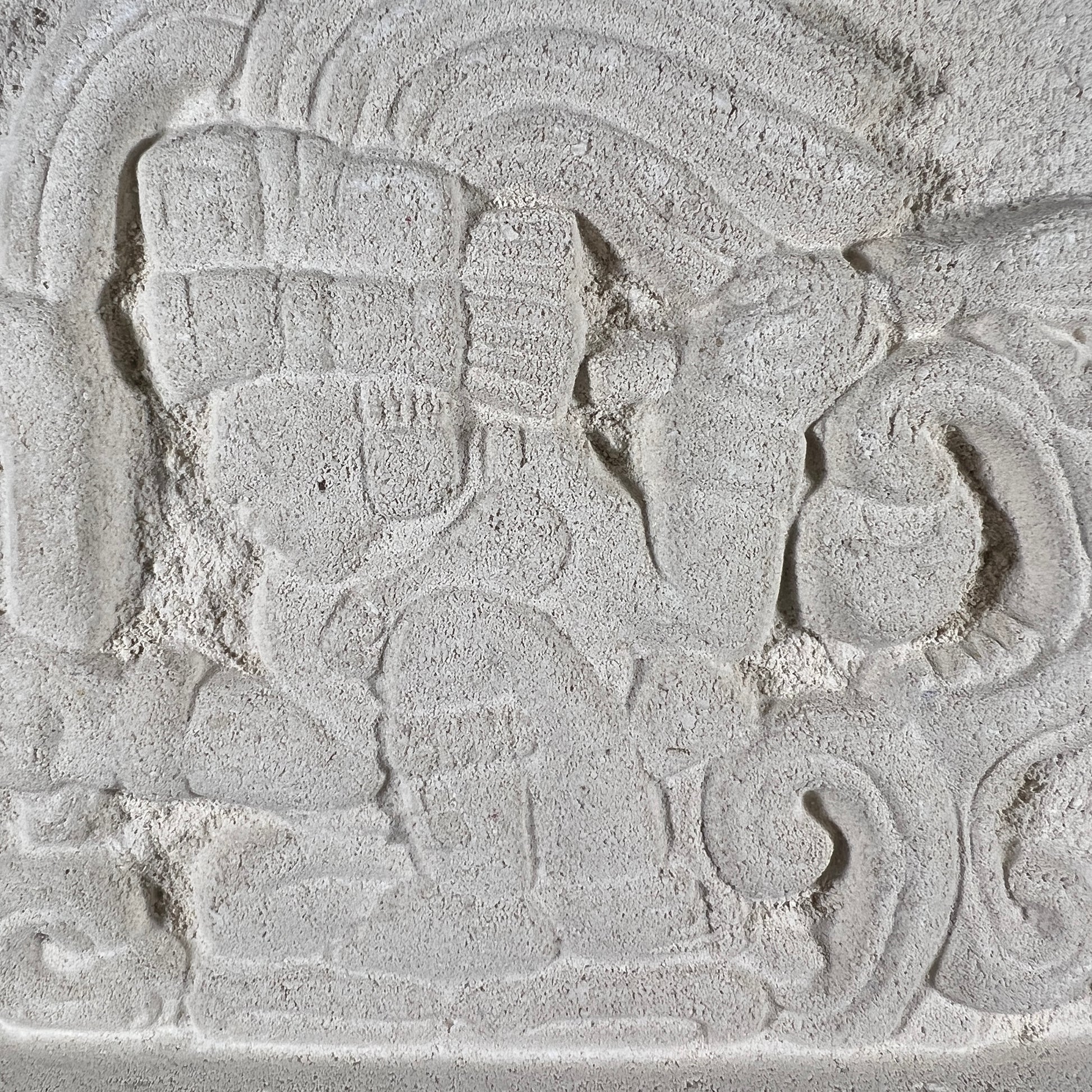Handcrafted from white stone by local artisans, this decorative piece portrays Chaman, the Mayan wizard and guardian of wisdom and knowledge. Although it is missing the embedded hook on the back, it remains in very good vintage condition.