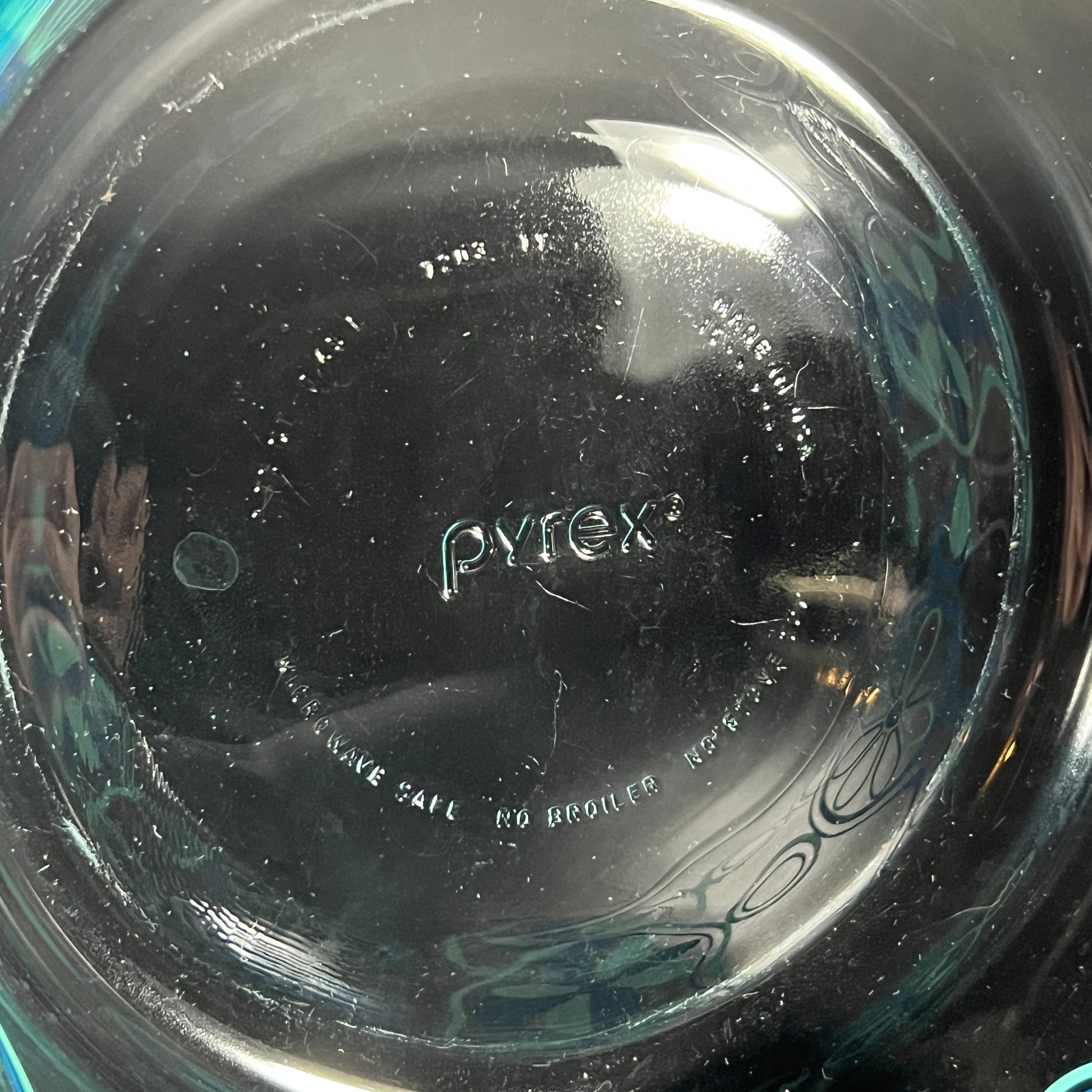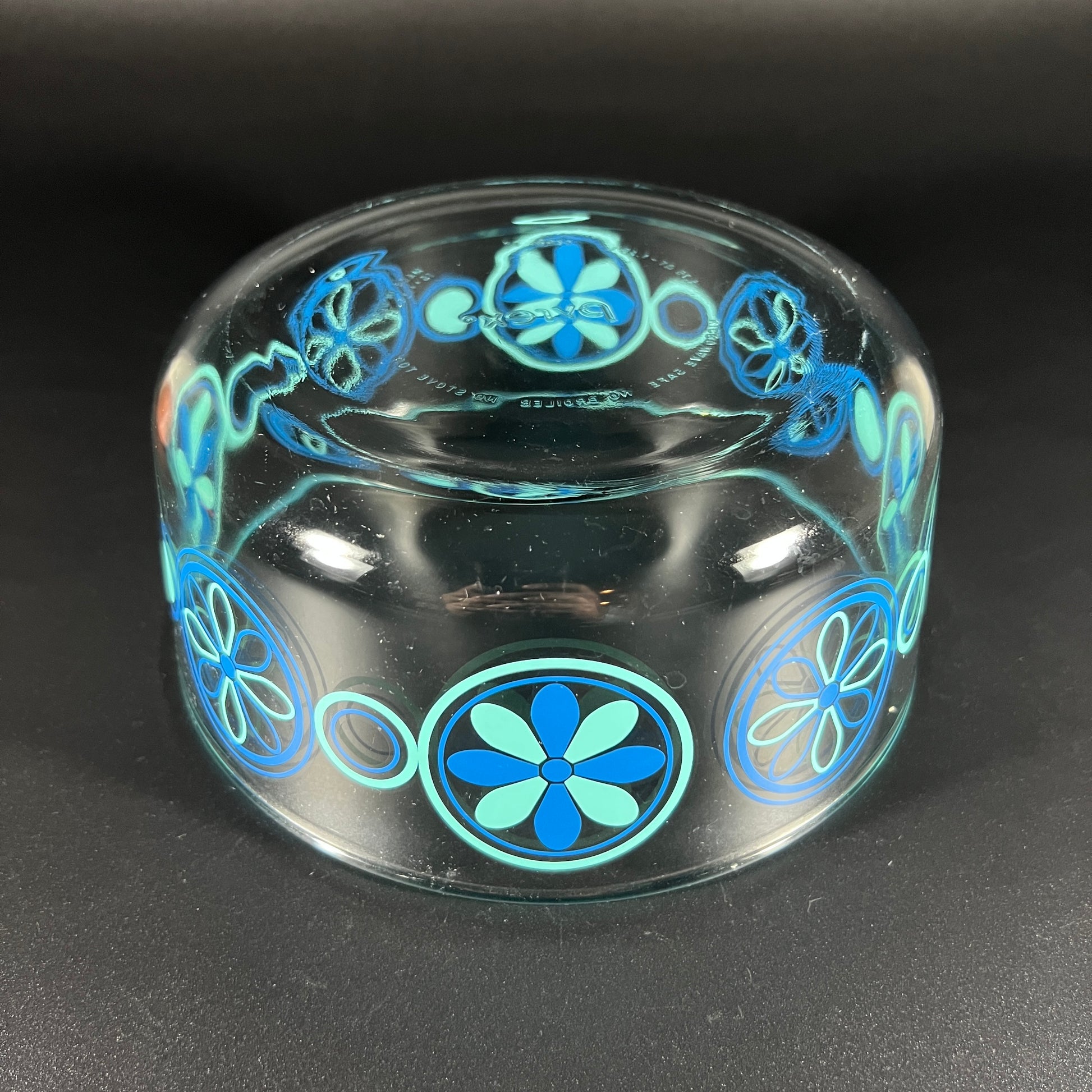 This vintage Pyrex serving bowl features a charming blue and turquoise circle flower design. It’s in excellent condition, with vibrant colors that have stood the test of time. Please check out the photos for more details. The bowl measures approximately 3.25" H x 7.25" in diameter.