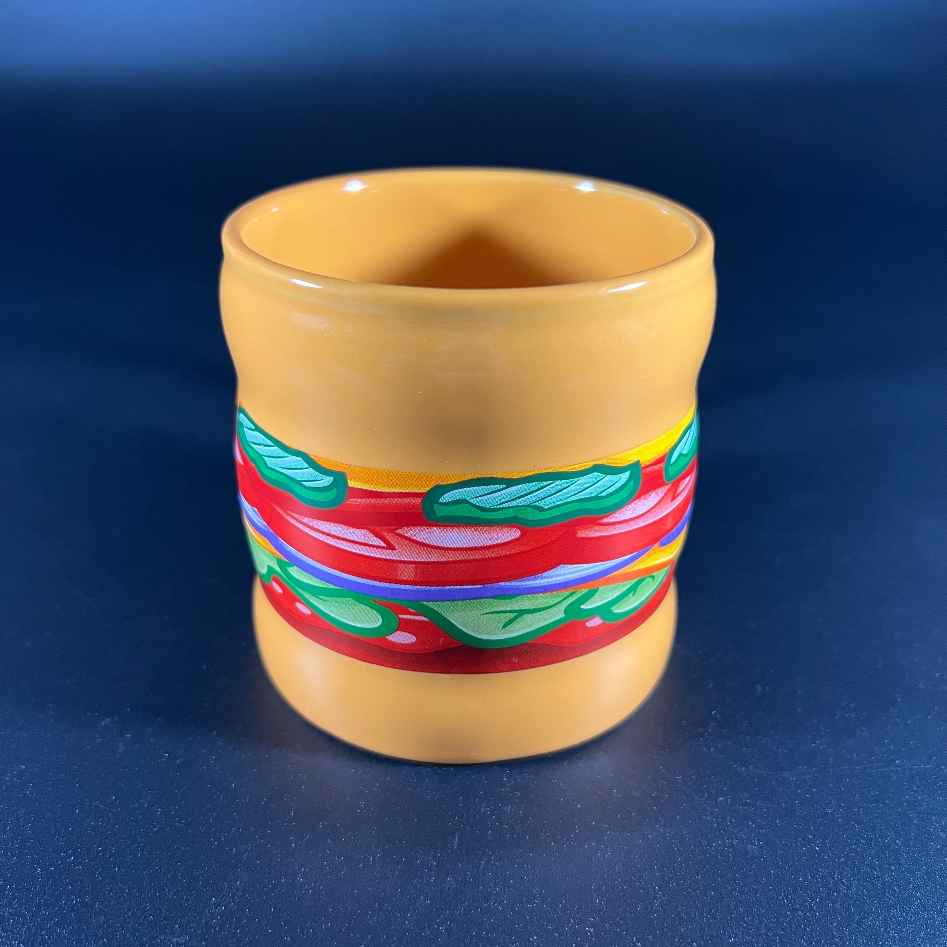 This fun and vibrant SpongeBob SquarePants mug is perfect for any fan of the beloved animated series. Featuring a colorful Krabby Patty burger pattern, this ceramic and porcelain mug holds up to 10 oz of your favorite hot or cold beverage. It's both microwave and dishwasher safe, making it as practical as it is playful. Ideal for everyday use or as a collectible, this mug adds a touch of Bikini Bottom charm to any kitchen. The mug is in good condition and measures approximately 3.5 inches high, 5.25 inches wide (including the handle), with a 3-inch opening. A must-have for SpongeBob fans and collectors alike!