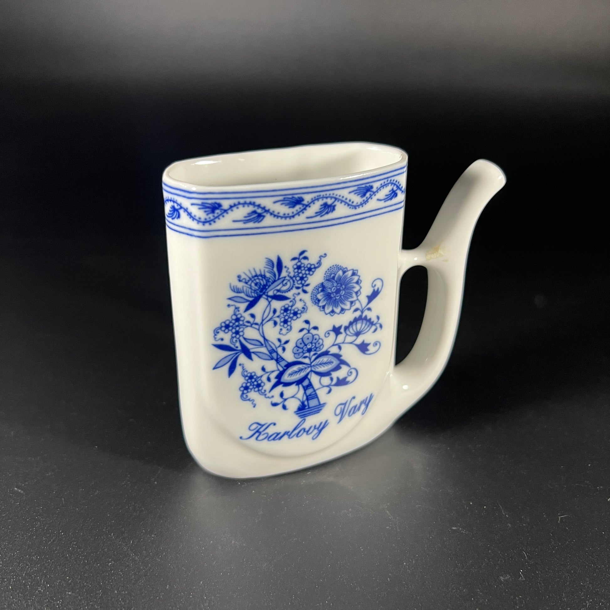 This vintage sipping cup from Karlovy Vary, Czech Republic, dates back to the 1970s. Featuring a delicate white base with a classic blue onion design and a straw handle, it was popular at sanitarium establishments and adored by tourists visiting for therapeutic mineral water. The cup is in good vintage condition, with wear consistent with age. Please refer to the photos for more details. It measures approximately 4" H x 4.25" W x 1.25" D.