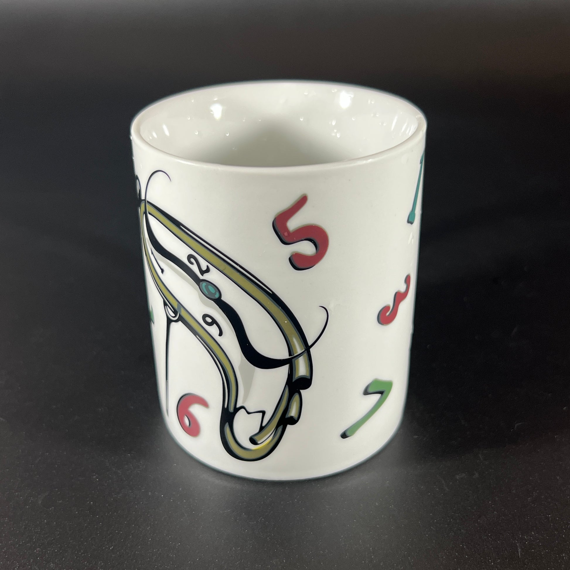Add a touch of surrealism to your coffee ritual with this coffee cup from The Salvador Dalí Museum in St. Petersburg, Florida. Featuring Dalí’s iconic melting clock and whimsical numbers design, this cup is not only visually striking—it also changes color when filled with a warm beverage, revealing more of the imaginative artwork. Both dishwasher and microwave safe, it combines artistic flair with everyday practicality. In excellent pre-owned condition, it measures approximately 3.75 inches high, 4.5 inches wide including the handle, with a 3-inch opening. A unique and interactive addition to any coffee lover’s collection.
