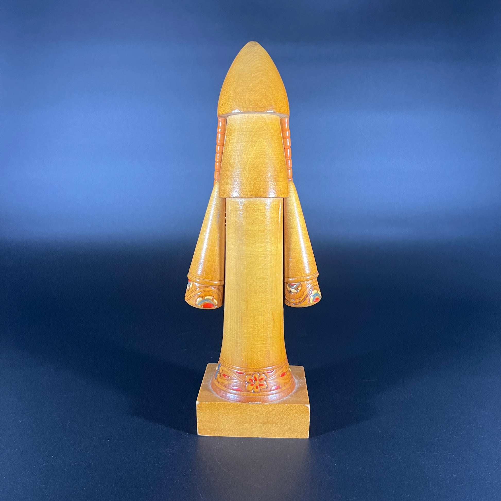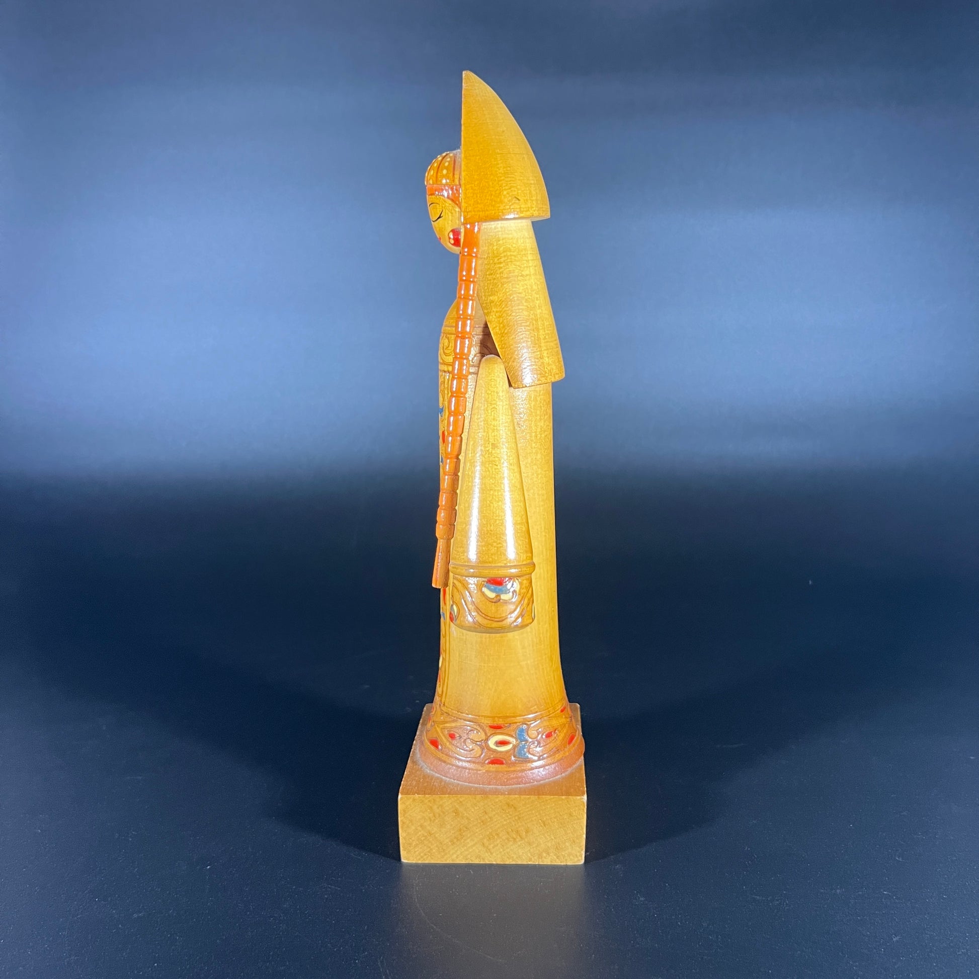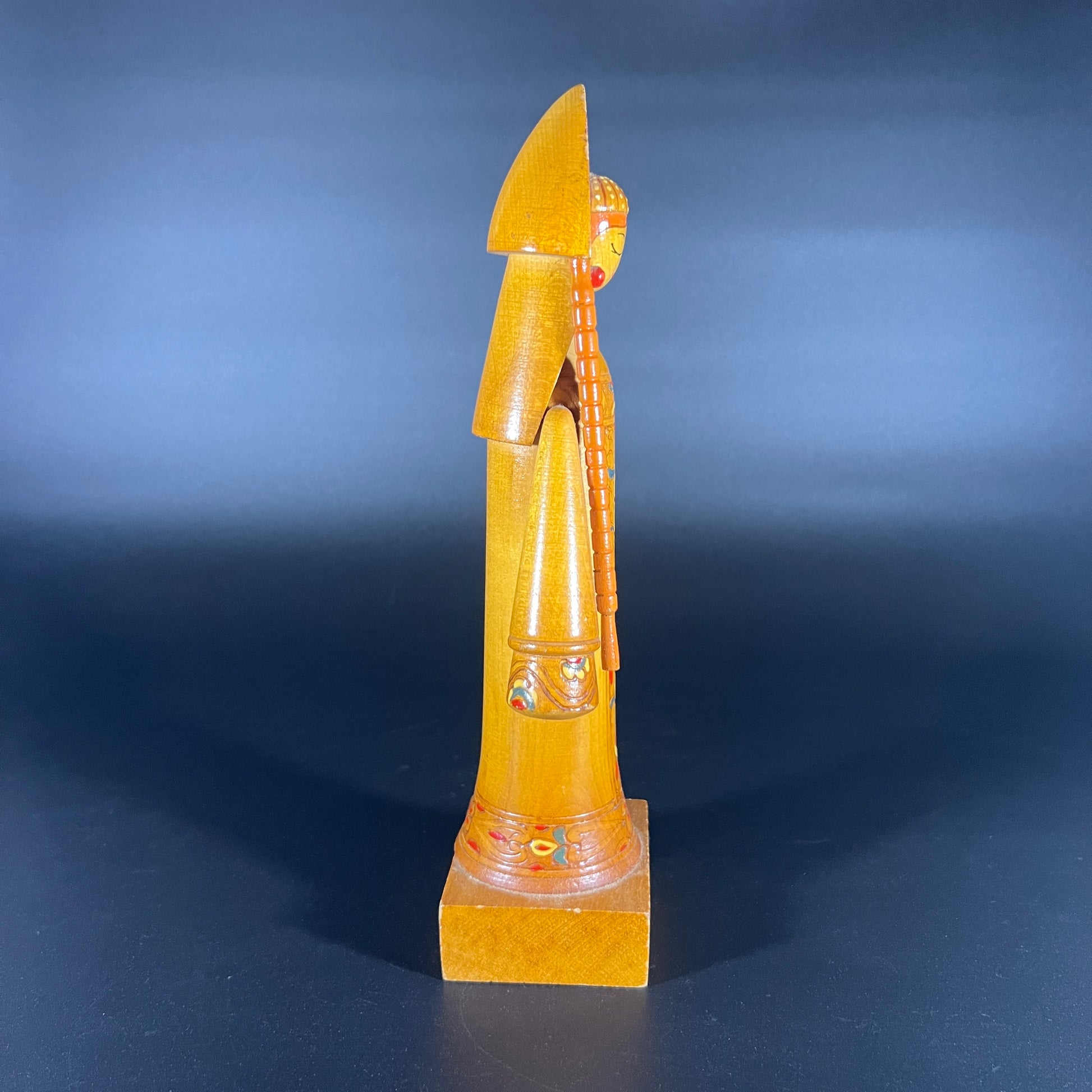 Vintage Devotchka Senora Russian Folk Doll. This charming hand-carved and hand-painted doll features vibrant green and red geometric patterns, showcasing traditional Russian folk art. In good vintage condition, it measures 9.75" high, 3.75" wide, and 2.5" deep, making it a delightful addition to any collection of folk art or vintage dolls.