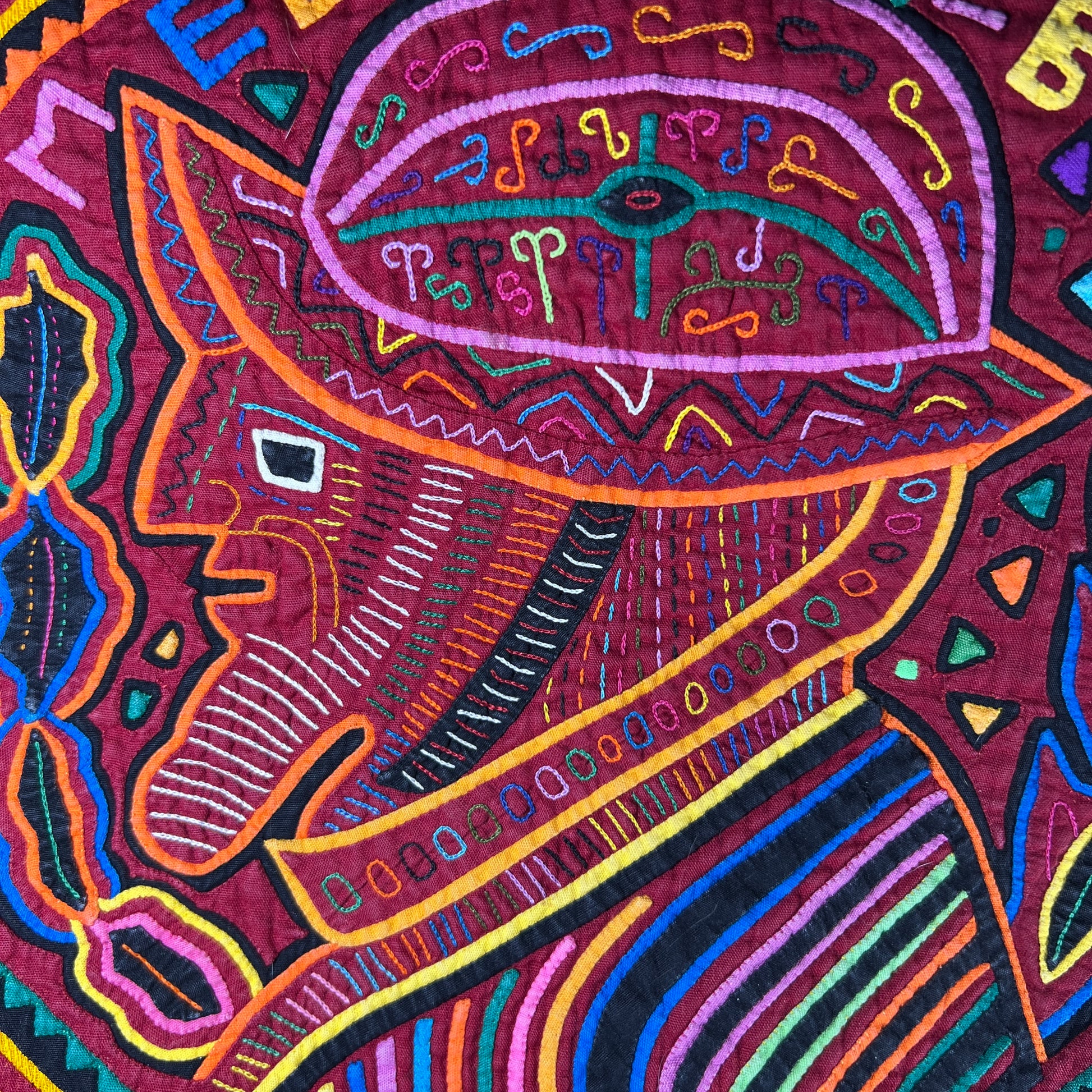 This vintage Kuna Indian Mola tote bag showcases intricate hand-stitched abstract art, featuring figures and a conquistador, all in beautiful, vibrant colors. Made in Panama, the bag captures the rich tradition of the Kuna people. In good vintage condition, with wear consistent with age. Please refer to the photos for more details. The bag measures approximately 18" H x 17" W x 4" D, plus the strap.