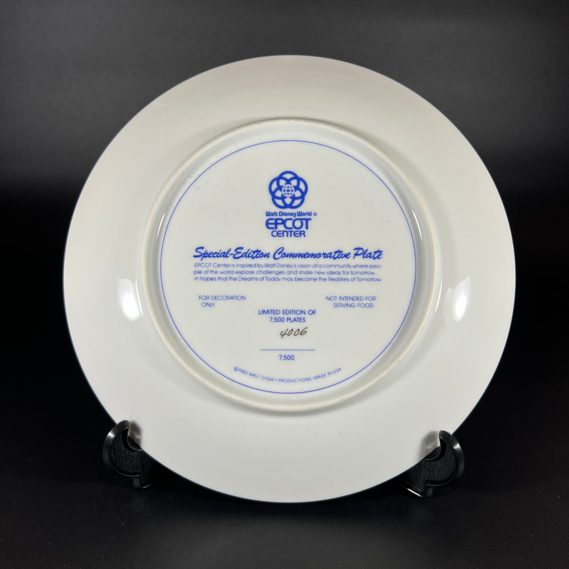 This rare and collectible Epcot Center Commemorative Plate Set captures the anticipation and excitement of the park's opening day in 1982. It is a limited edition treasure, numbered 4006 out of 7500. Housed in its original protective case, this set is in excellent condition, perfect for collectors or as a special gift. The plates are in pristine vintage condition, while the protective box has some minor wear from years of storage, but it has kept the plates safe and secure. Each plate measures 8.5" in diameter, and the box itself measures approximately 10" H x 10" W x 3.125" D. Please refer to the photos for more detailed views. A stunning piece of Disney history!