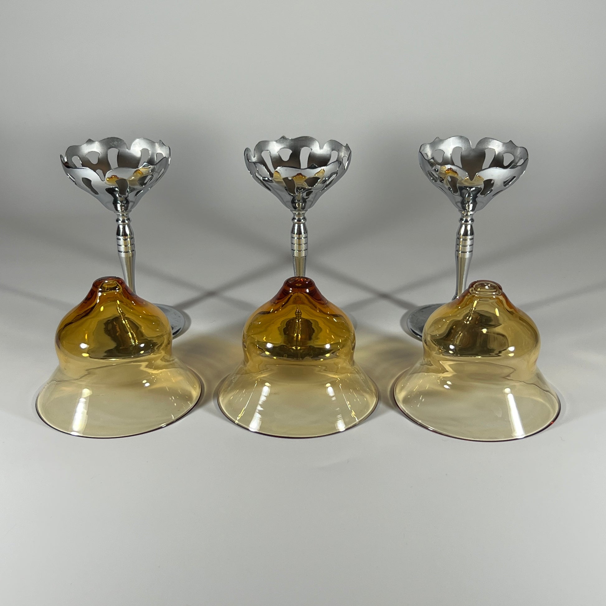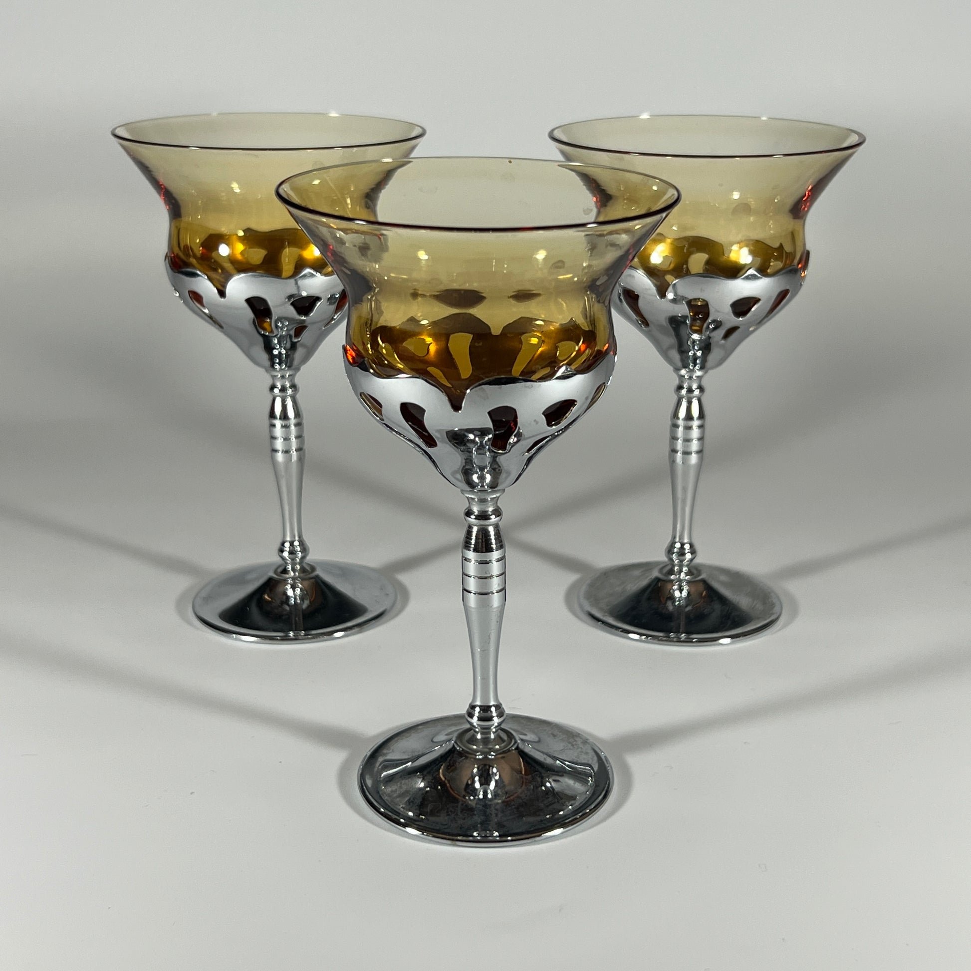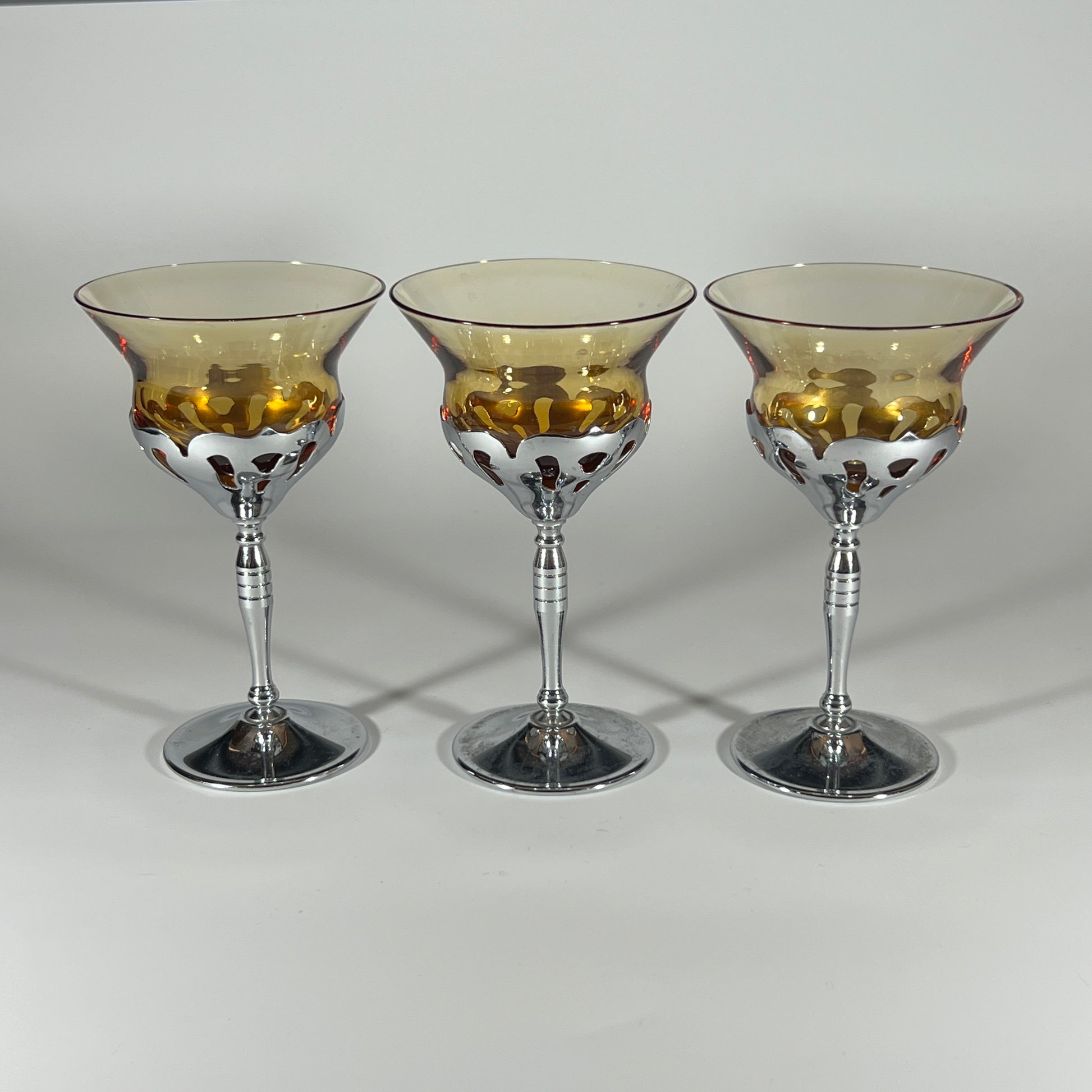 Add a touch of Art Deco elegance to your barware collection with this stunning set of 3 Farber Brothers Krome Kraft cocktail glasses. Each features a removable amber glass bowl seated in a sleek silver chrome base—both stylish and practical for easy cleaning. In excellent vintage condition, each glass measures approximately 5.5 inches tall and 3.5 inches in diameter. A perfect addition to any bar cart or vintage glassware display.