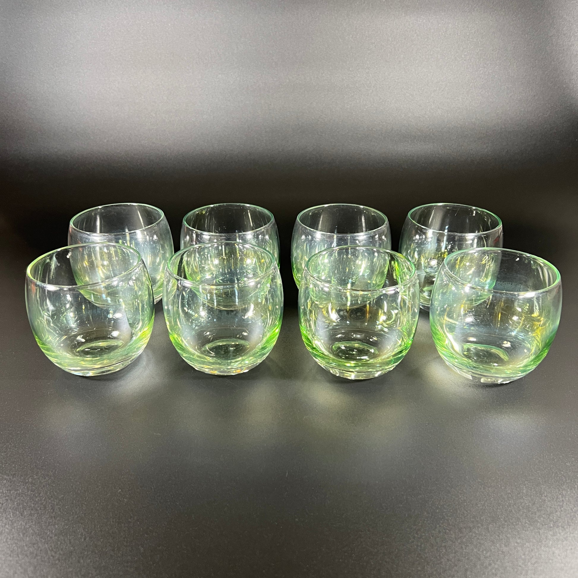 This is a set of 9 vintage round rocks glasses (one not shown) made from iridescent green glass by Federal Glass in the classic Mid-Century Modern (MCM) style. With an 8 oz capacity, these glasses are designed for cold beverages, making them perfect for cocktails, whisky, or any chilled drink. These retro bar glasses are original pieces and would make a great addition to any barware collection. They are in good vintage condition, showcasing the distinctive shimmer and style of the era.