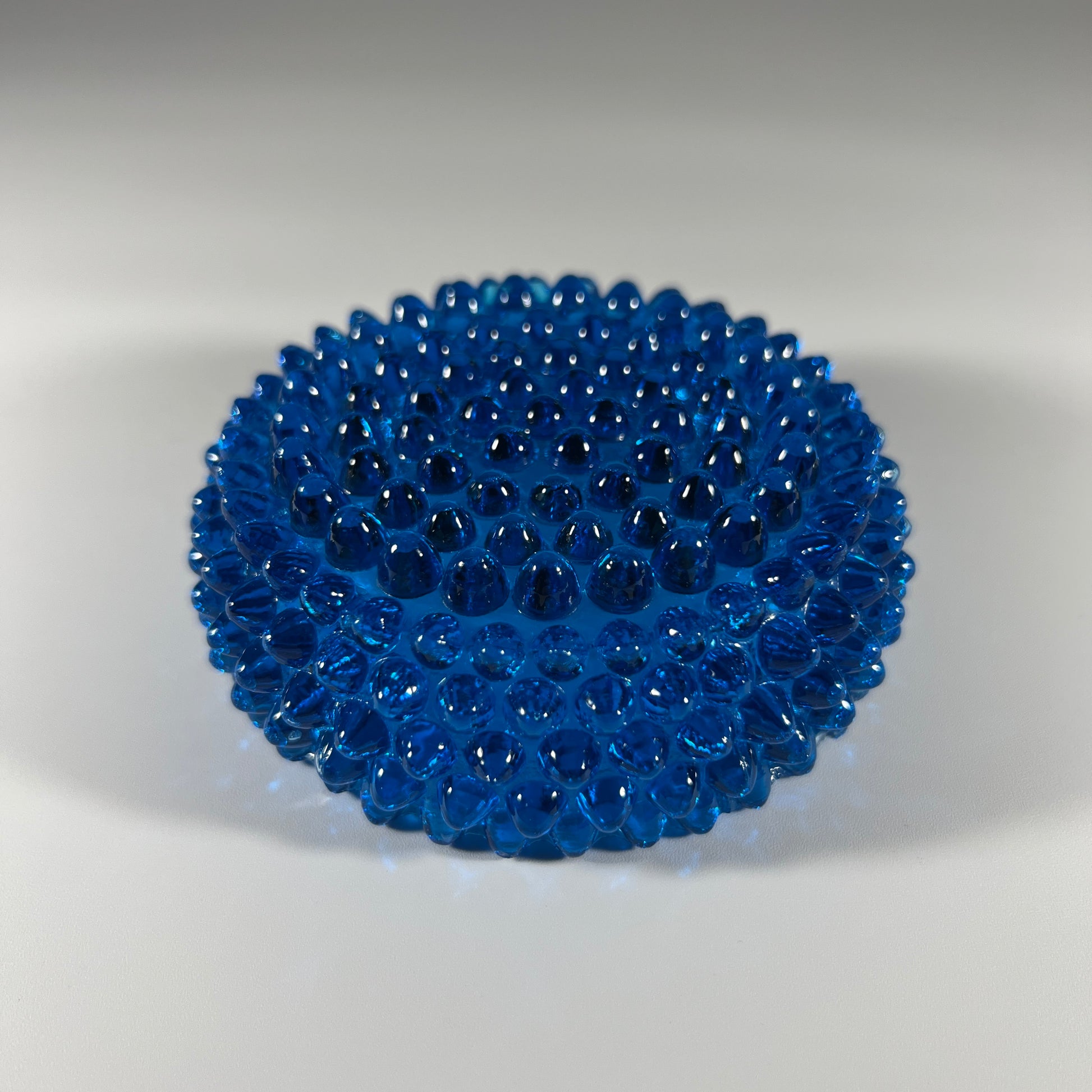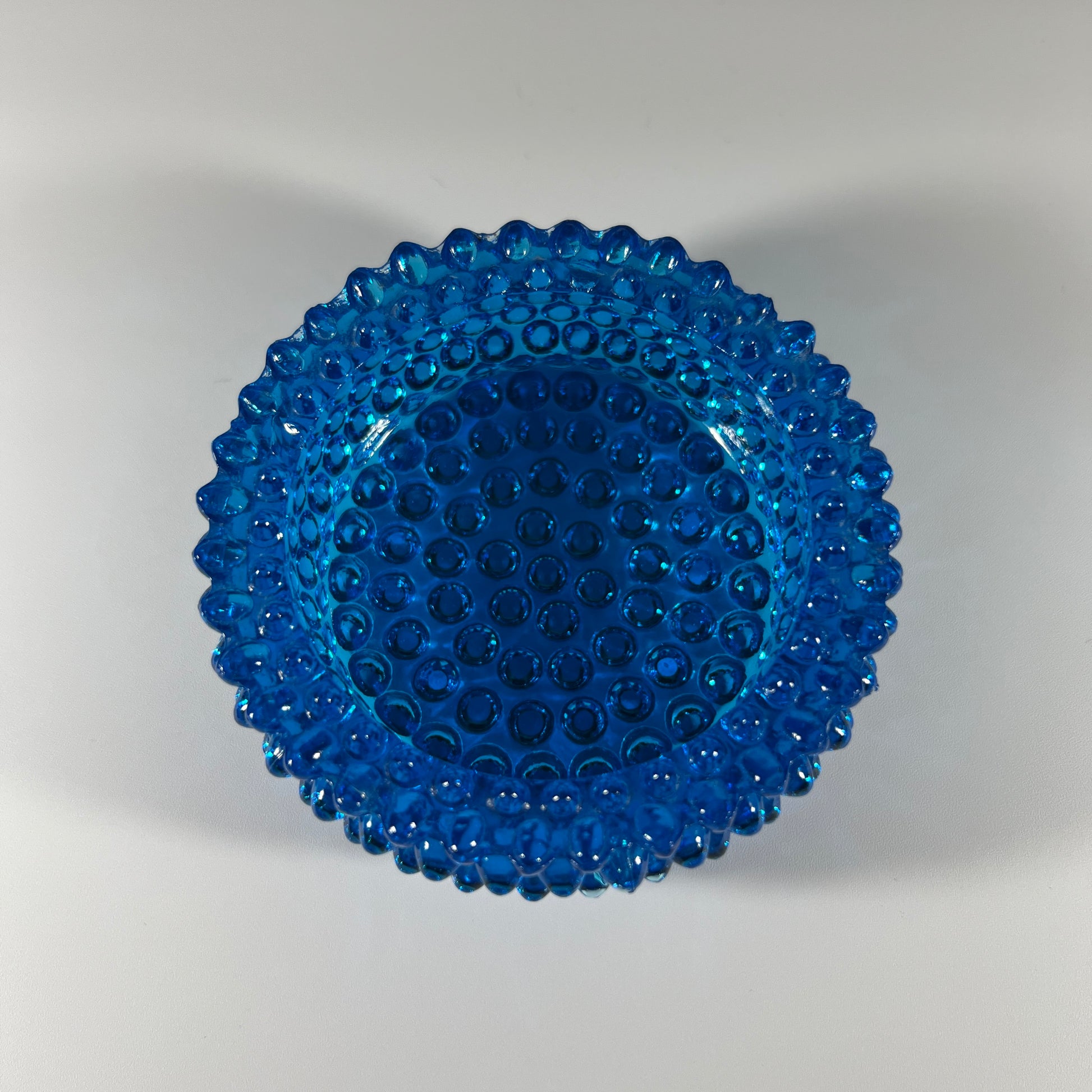 This 1940s Fenton Hobnail blue glass salt cellar is a beautiful example of vintage craftsmanship. The vibrant blue glass catches and reflects light in an ever-changing way, thanks to the texture of the hobnail design. Originally intended as a salt cellar for the dining table, it also makes a charming trinket dish or an elegant candleholder for a tealight or small pillar candle.
