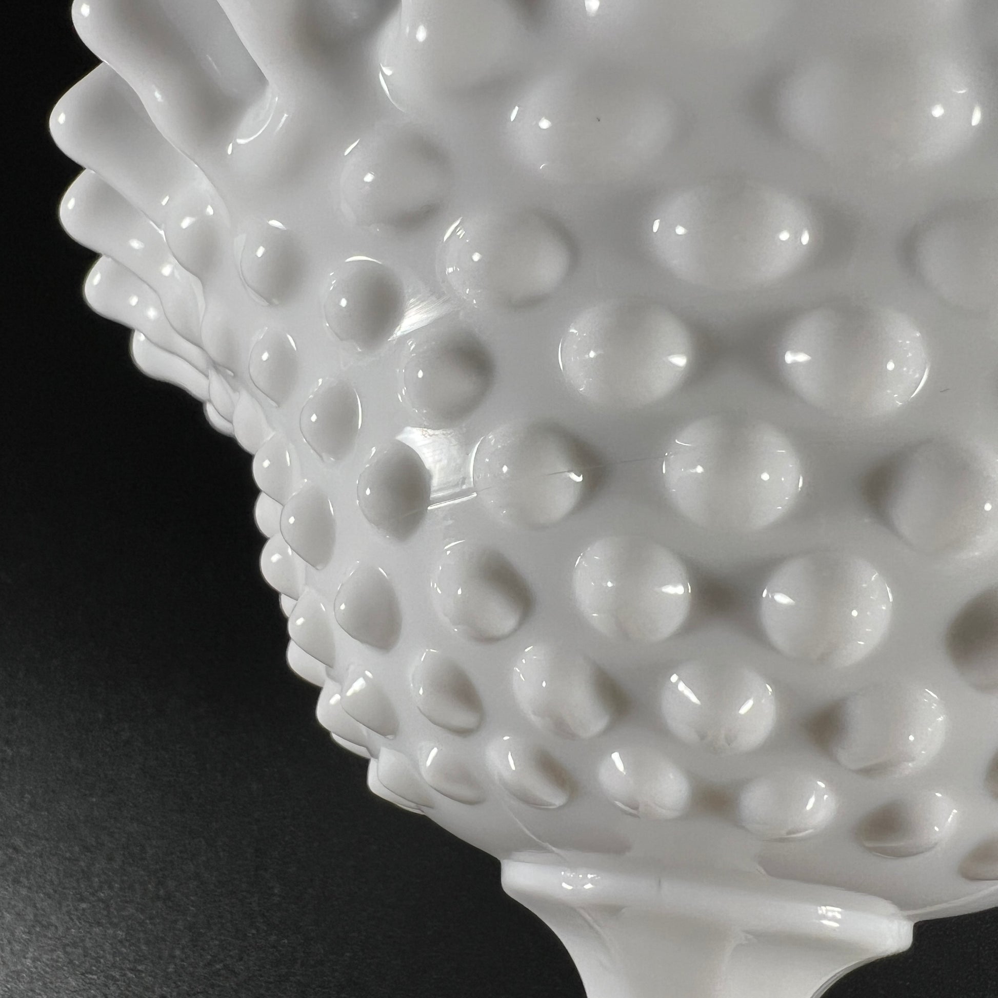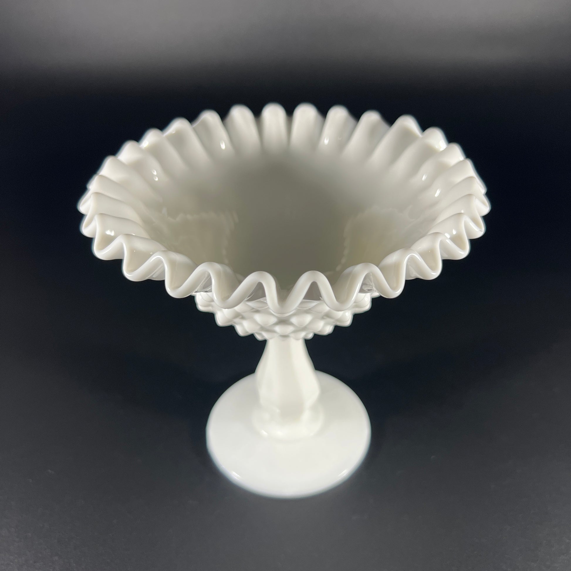 This Fenton White Hobnail compote pedestal candy dish from the 1960s is a lovely vintage piece. In good condition with wear consistent with age, it does feature a small imperfection from the manufacturing process. It’s minor but worth mentioning for full transparency. Please review the photos for more details. The dish measures approximately 5.75" H x 6" in diameter. A beautiful and unique addition to any vintage glassware or Fenton collection!