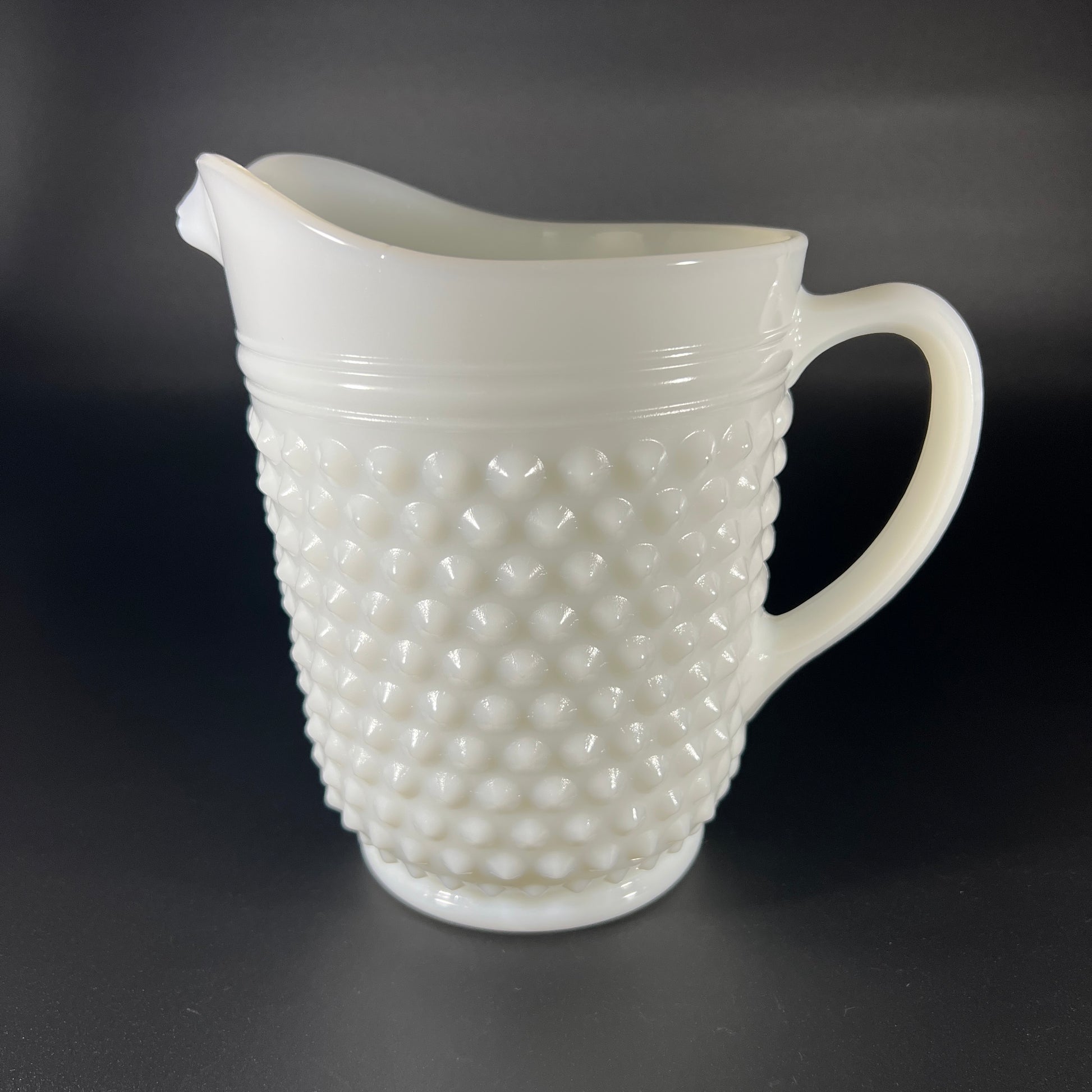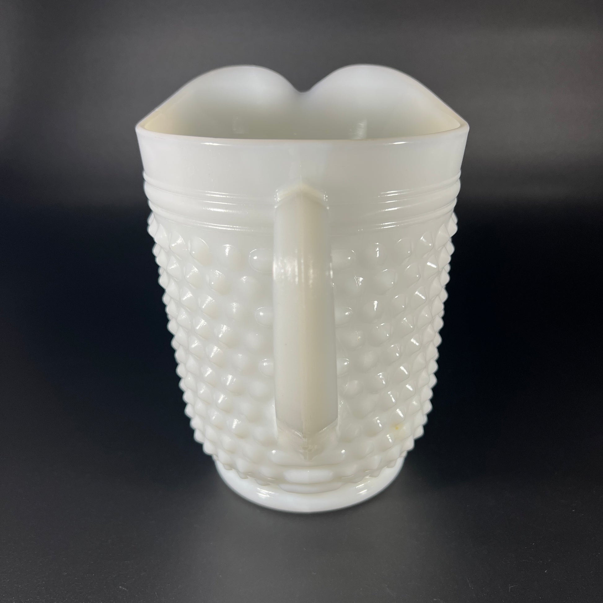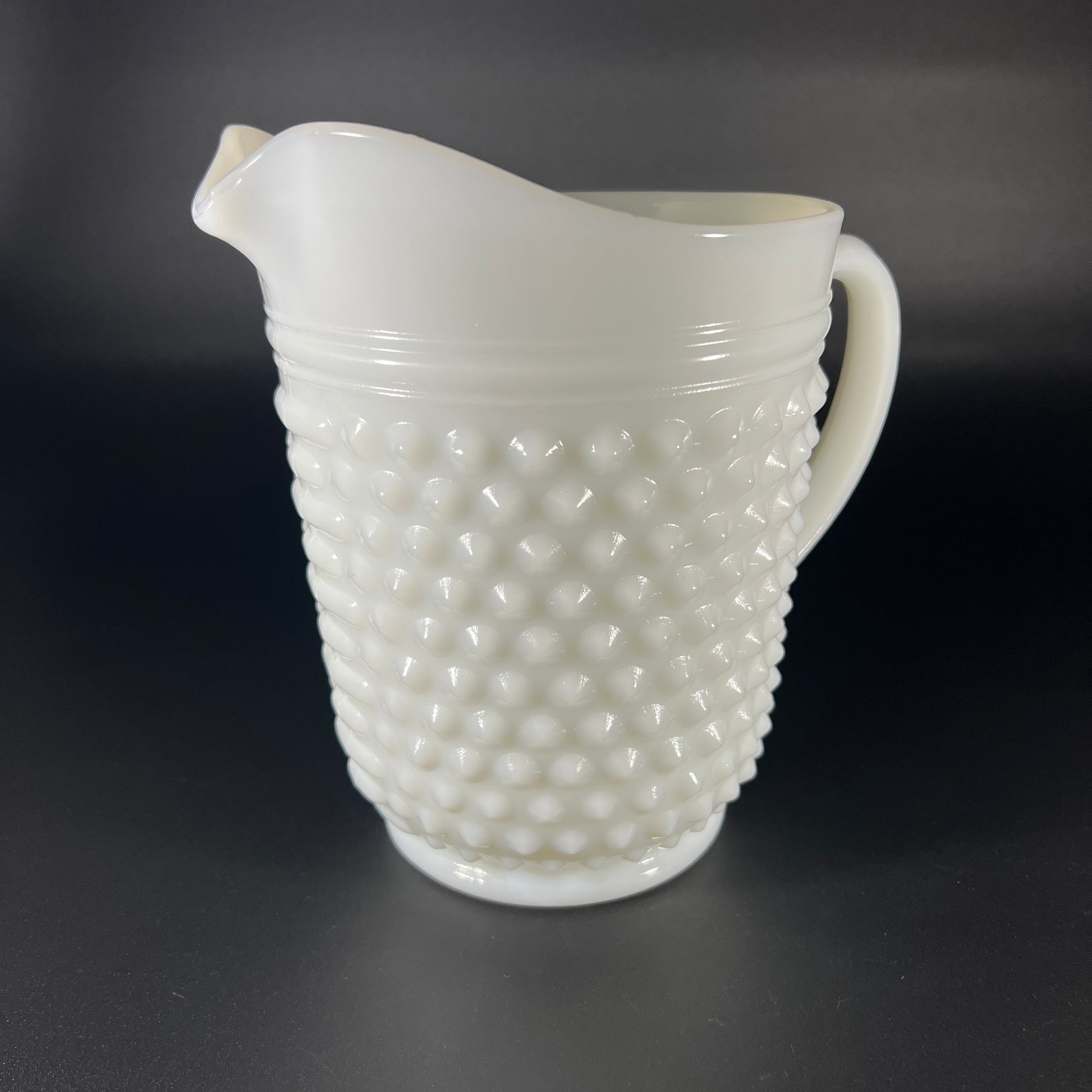 This vintage 1960s Fenton Hobnail milk glass pitcher is a classic beauty, featuring the iconic hobnail design that Fenton is known for. It’s in good vintage condition with wear consistent with age. Please refer to the photos for more details. The pitcher measures approximately 8" H x 8.5" W (with handle) x 6" D.