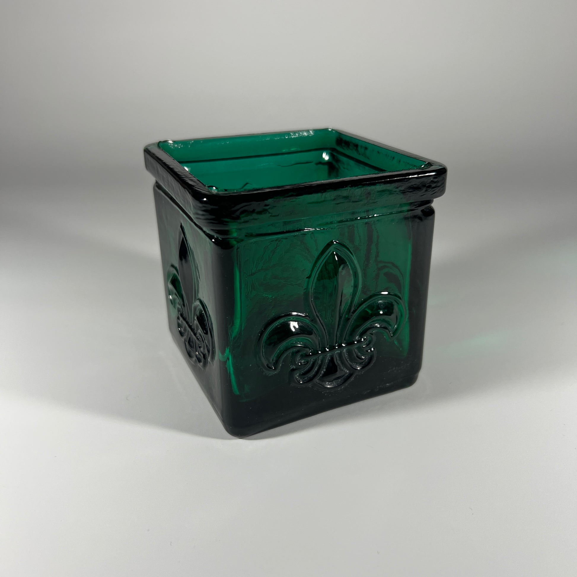 This Fleur de Lis green glass vase features a rich, dark green hue and is crafted from heavy glass. It is in excellent vintage condition, with no damage. The vase measures approximately 3.5" H, 3.25" W, and 3.25" D.
