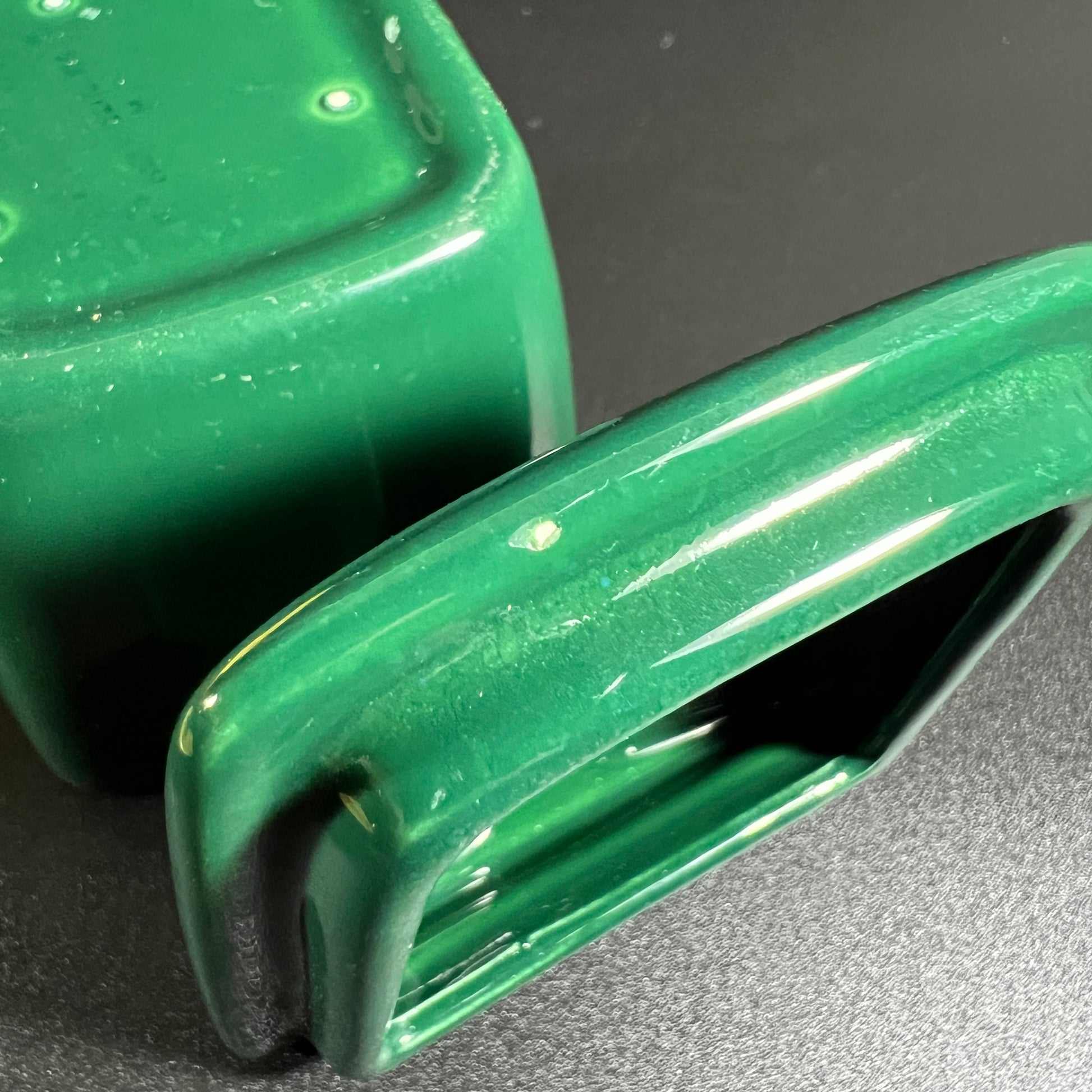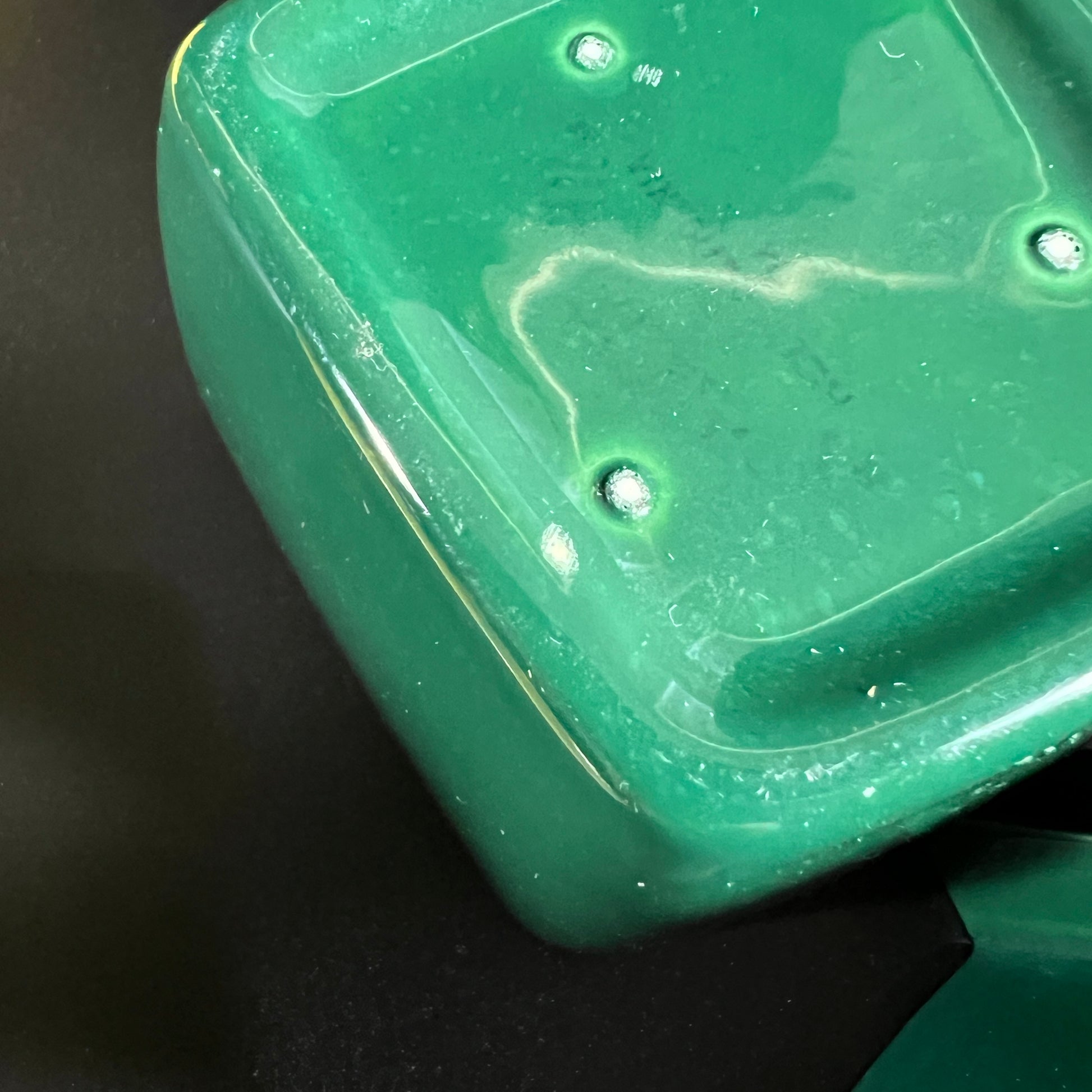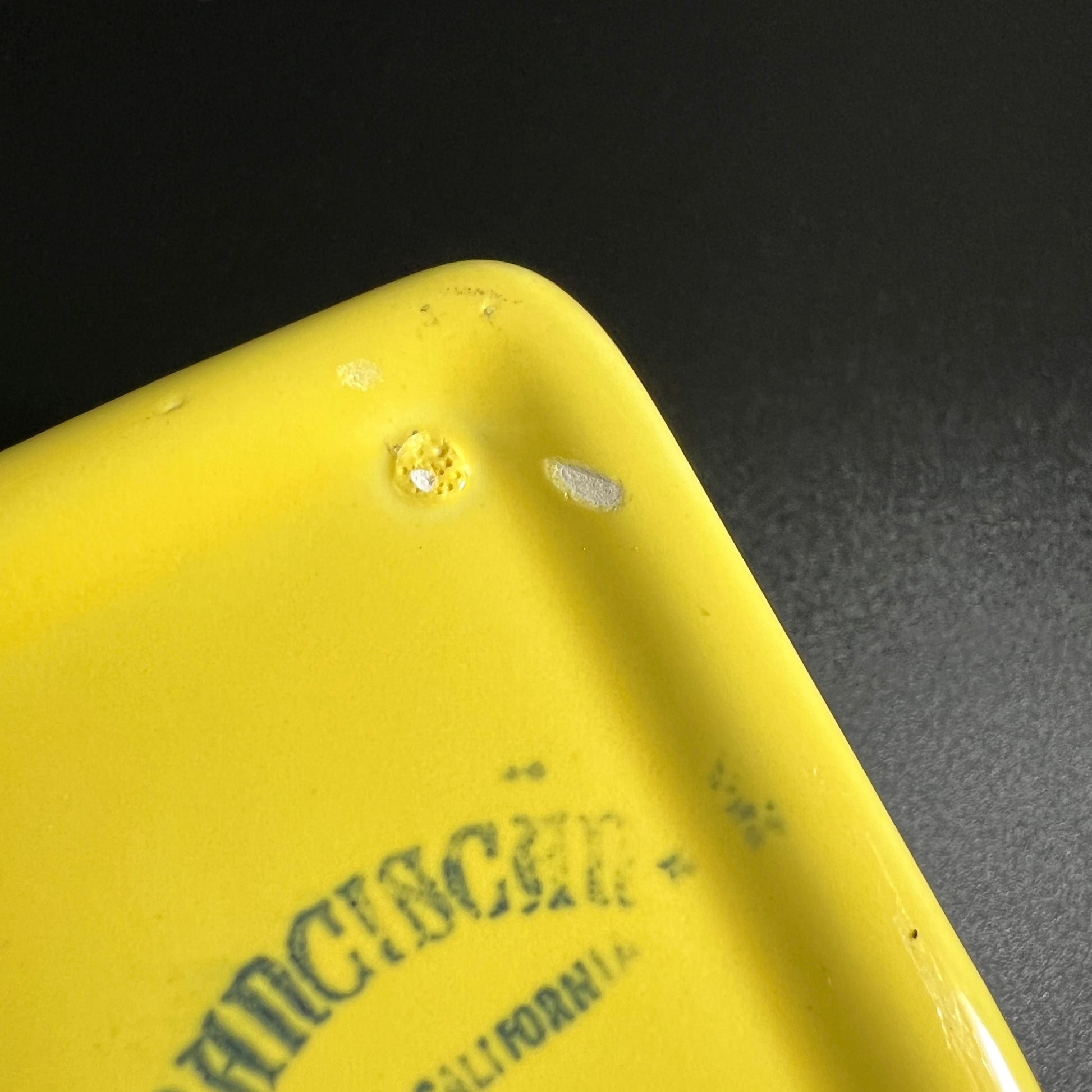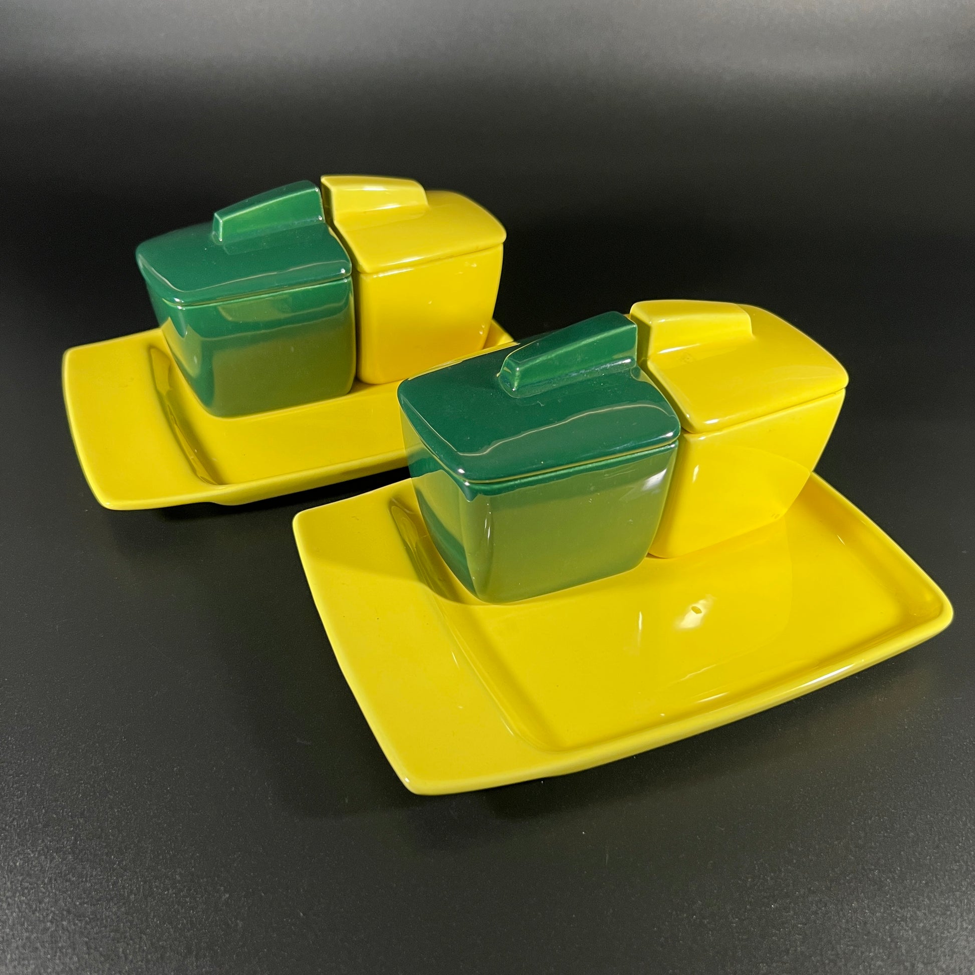 This pair of 1960s vintage Franciscan Ware condiment sets feature a vibrant combination of bright yellow and dark green. Each set includes a tray and two condiment containers with lids. The trays measure 7 1/4" by 5 1/2", while each condiment container (without the lid) stands about 2 1/8" high and is 2 1/2" deep. Both the trays and containers are marked "Franciscan Made in California" on the bottom. These condiment sets are in good vintage condition, with minor flea bites on the bottoms, consistent with age. Please refer to the photos for more details. Pricing is per set.