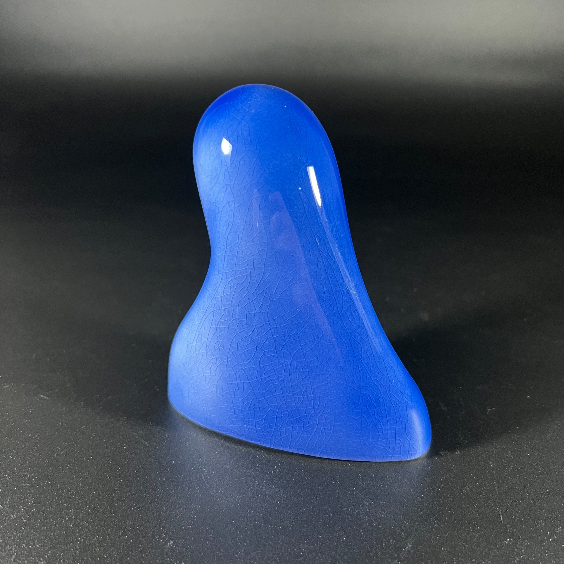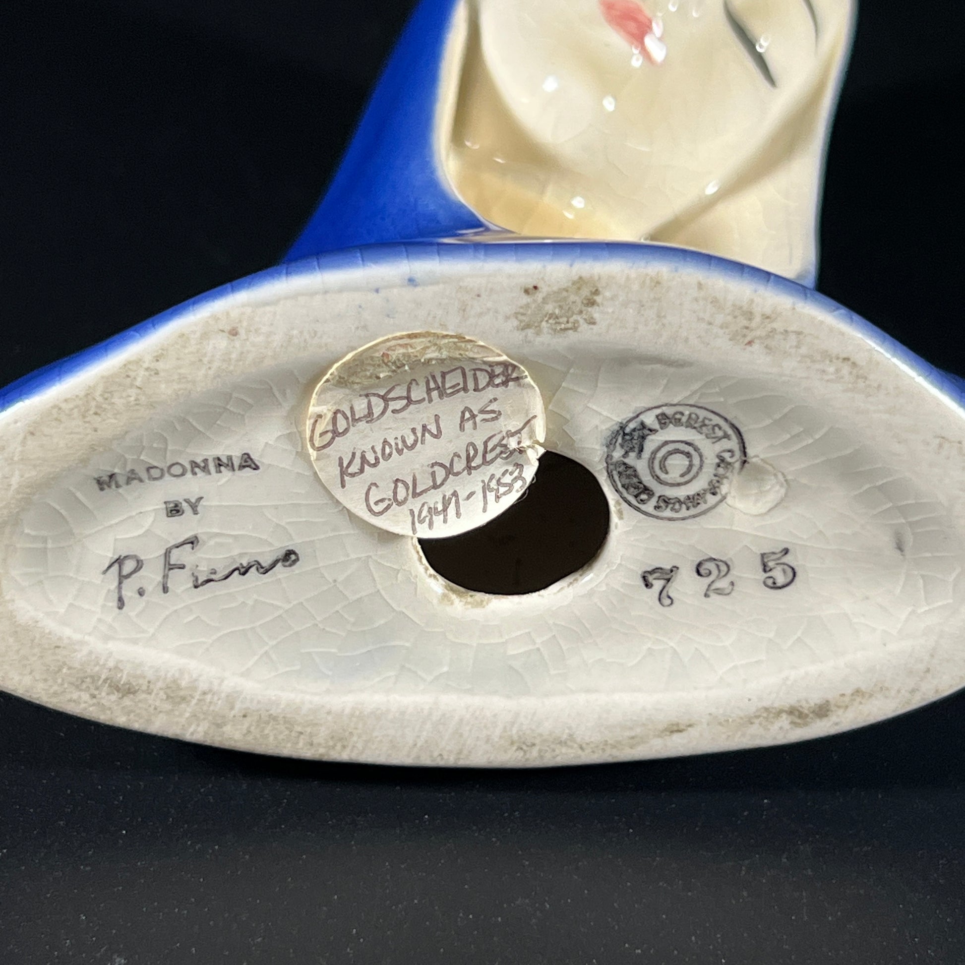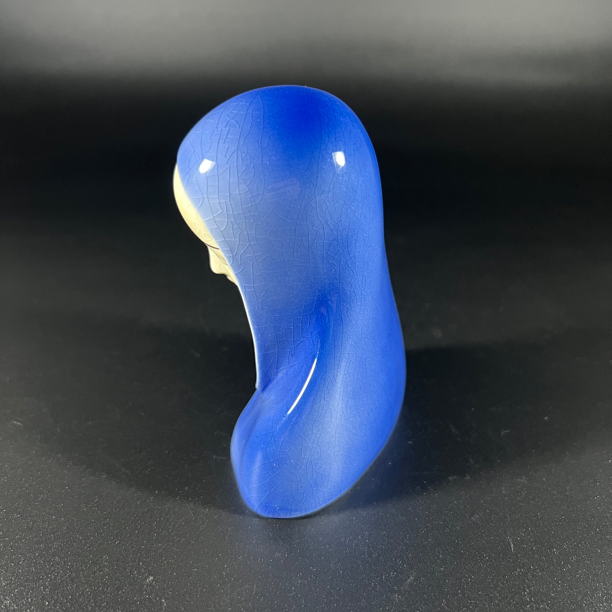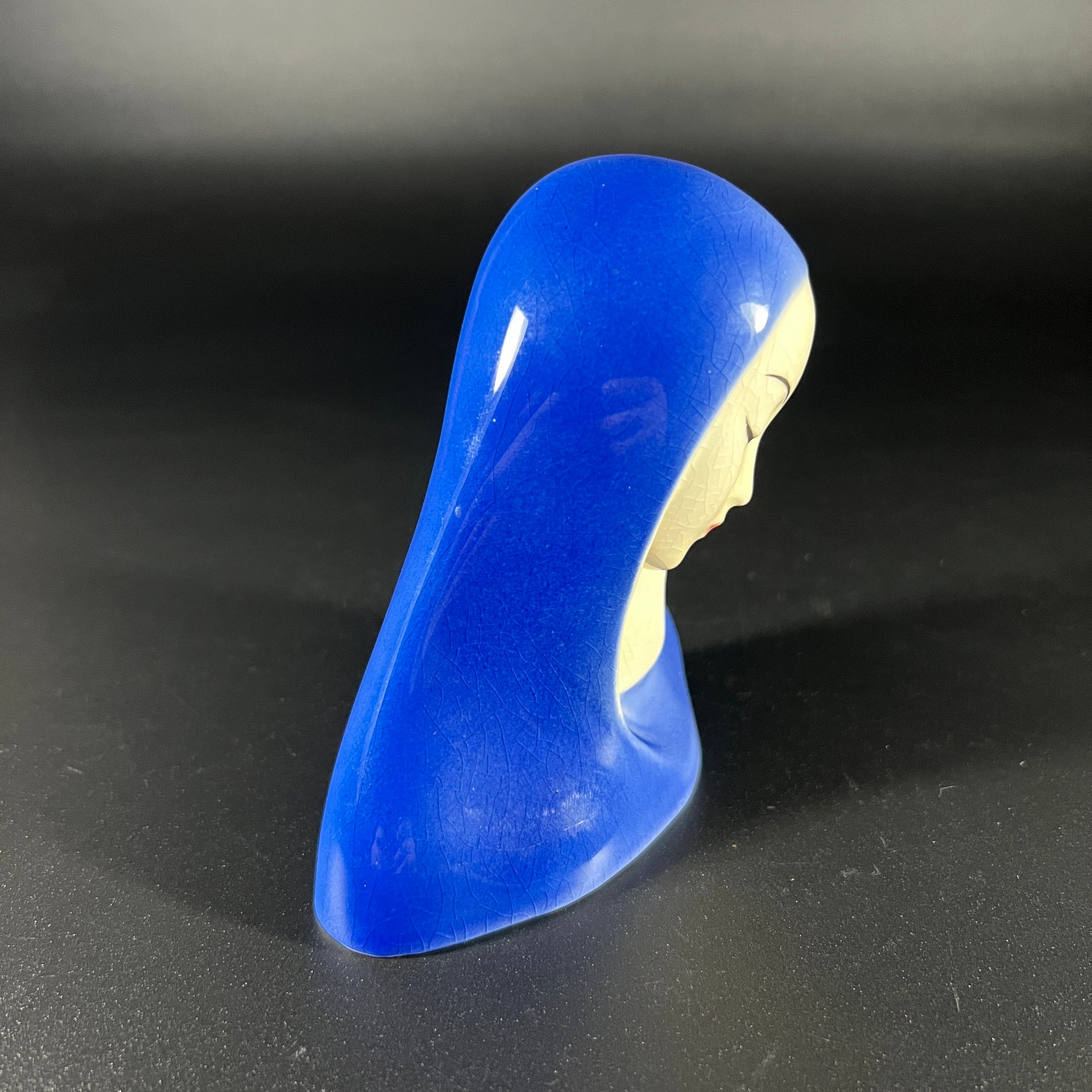 This exquisite Madonna bust is a Goldscheider piece, designed by Piera Funaro. Crafted in porcelain, it beautifully depicts the Mother Mary wearing a graceful blue cape. The stunning Art Deco style, combined with intricate religious details, makes this a standout piece for any vintage collection. Known for their exceptional quality and meticulous craftsmanship, Goldscheider delivers a masterpiece with this figurine. It is in good vintage condition, with some light crazing typical for its age. Please refer to the photos for additional details. The item measures approximately 4.5" H x 3.75" W x 2.25" D.