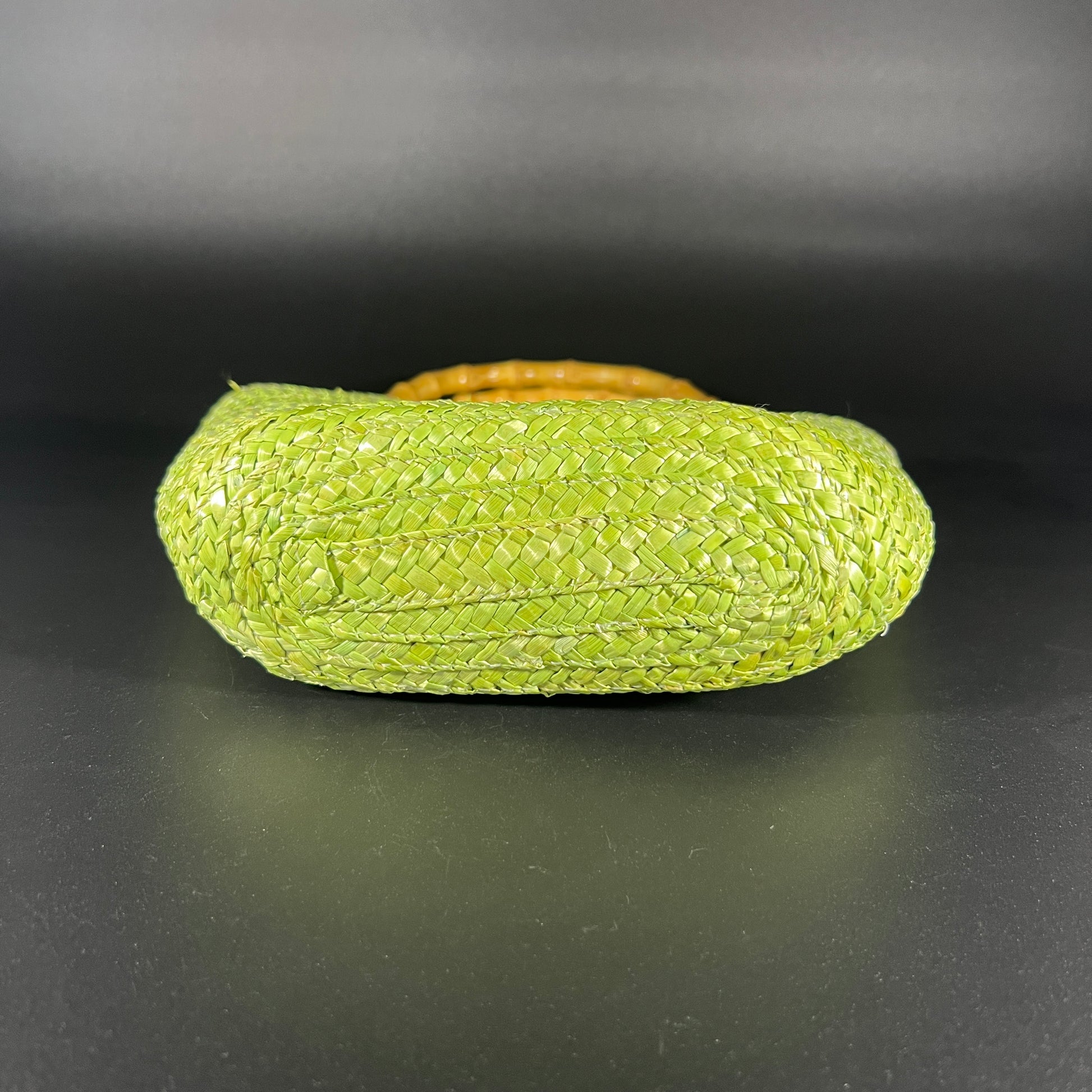 This St. Johns Bay vintage lime green woven wheat straw mini purse features a charming bamboo handle and a magnetic button closure. Inside, you'll find a playful polka dot lining with an inner zippered pocket for added convenience. In great pre-owned condition, this purse offers both style and functionality. It measures 12 inches in height (with handles), 10 inches in width, and 3 inches in depth. A perfect accessory to add a touch of retro flair to any outfit!