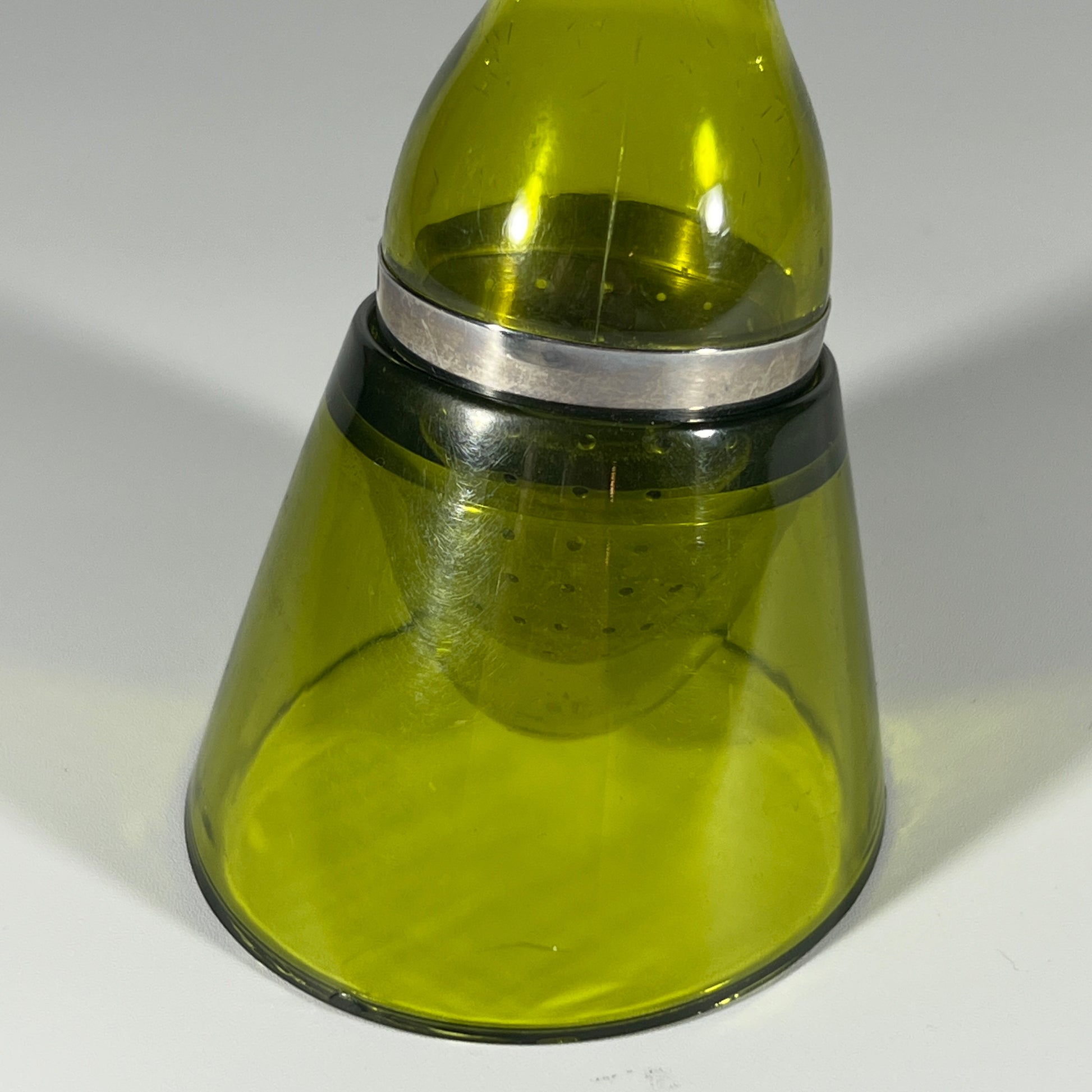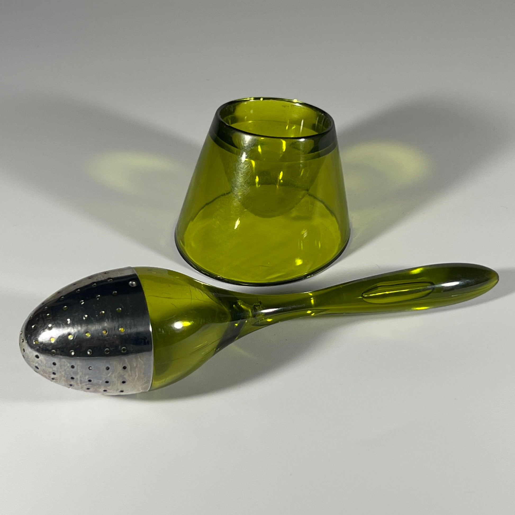 This vintage 1970s tea leaf steeper/strainer wand with stand comes in the iconic avocado green color of the era. Made from a combination of Lucite and stainless steel, it’s both functional and a charming retro piece. It’s in good vintage condition with wear typical of age, including some small hairline cracks in the plastic that do not impact its functionality. Please take a closer look at the photos for more details. The item measures approximately 7" H x 2.5" W x 2.75" D (overall).