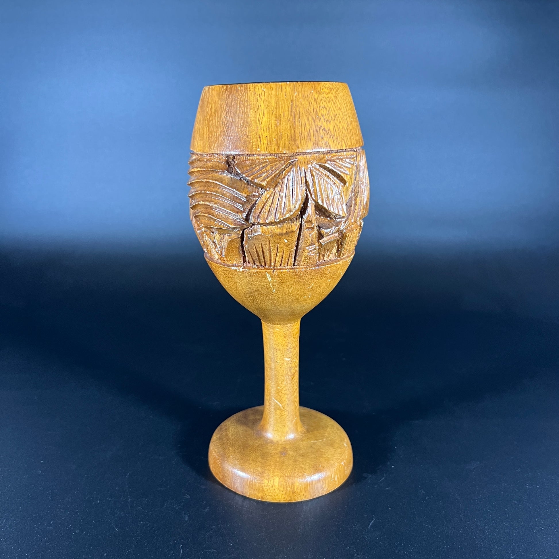 This hand-carved monkey pod tiki goblet features intricate tropical designs, including palm trees and island huts, capturing the essence of island life. Crafted from richly grained monkey pod wood, it showcases beautiful craftsmanship and a warm, natural finish. The goblet is in good vintage condition, with minor wear consistent with age. It measures approximately 8.25 inches high and 3.75 inches in diameter—perfect for adding a touch of Polynesian charm to your tiki bar or vintage décor collection.